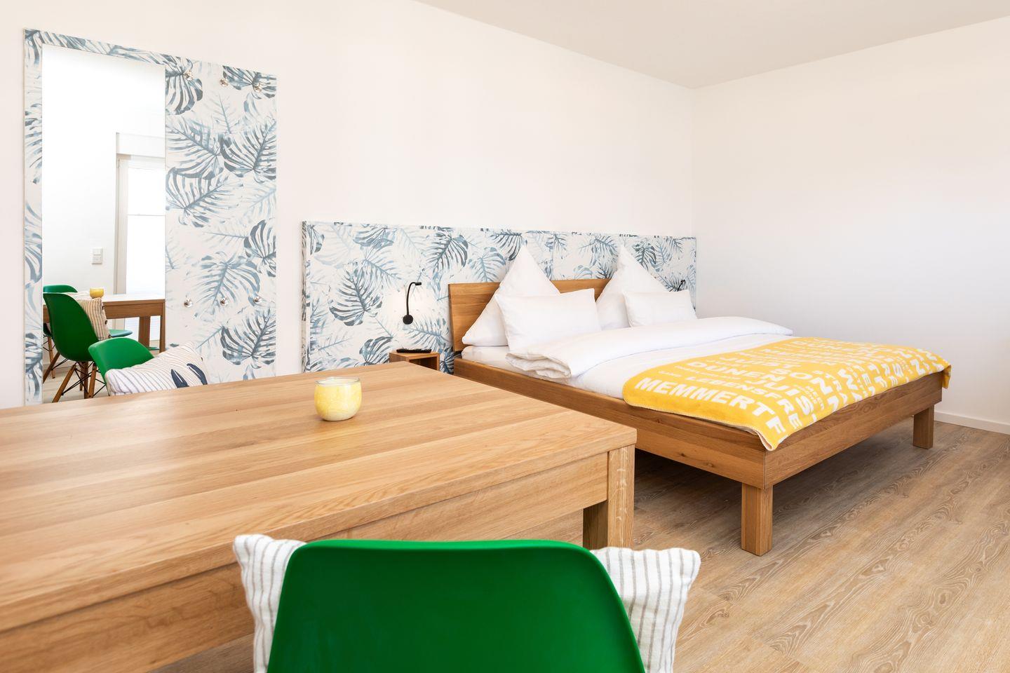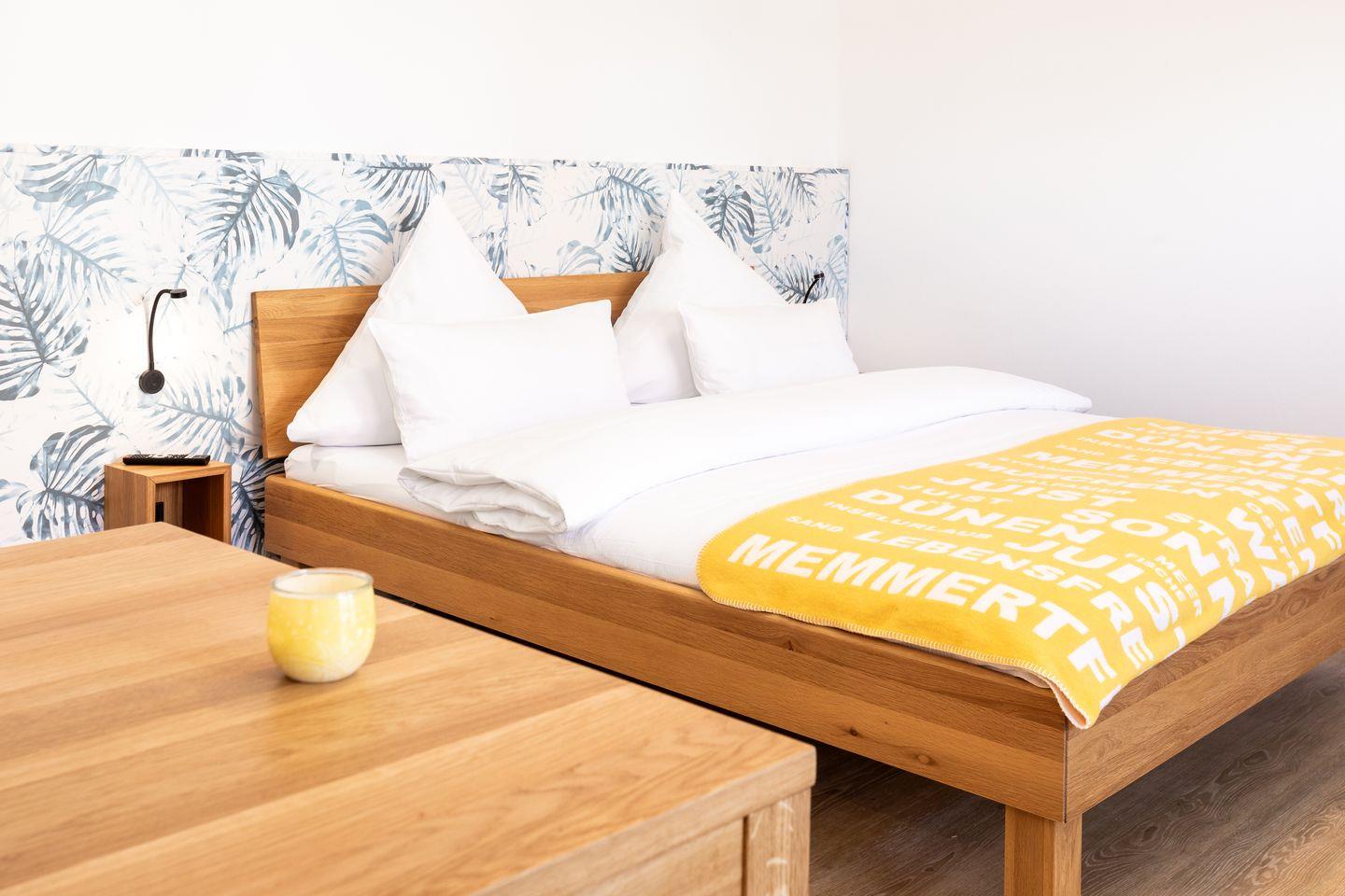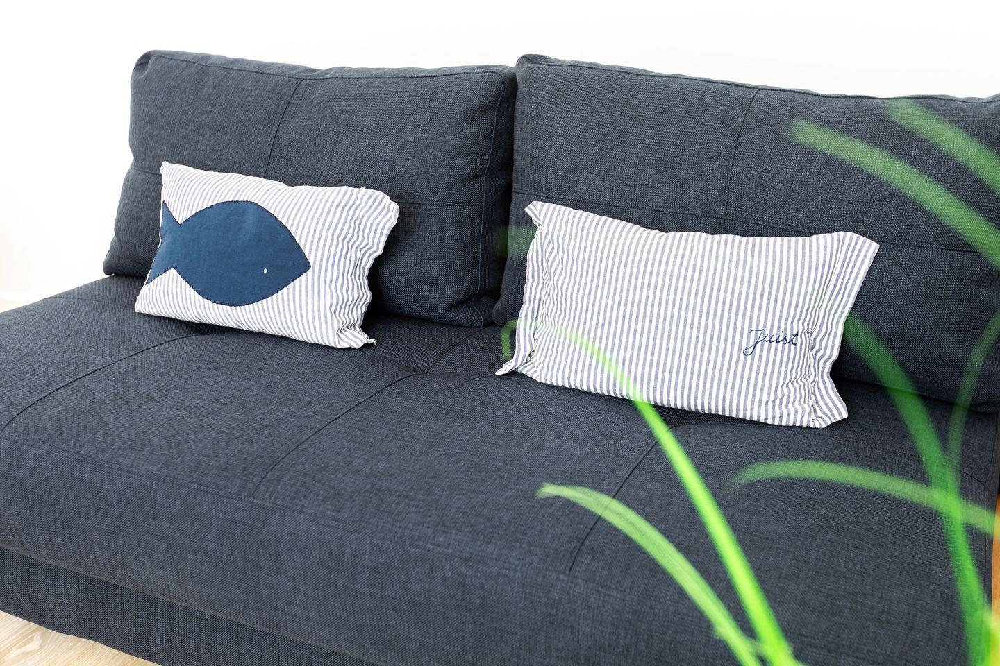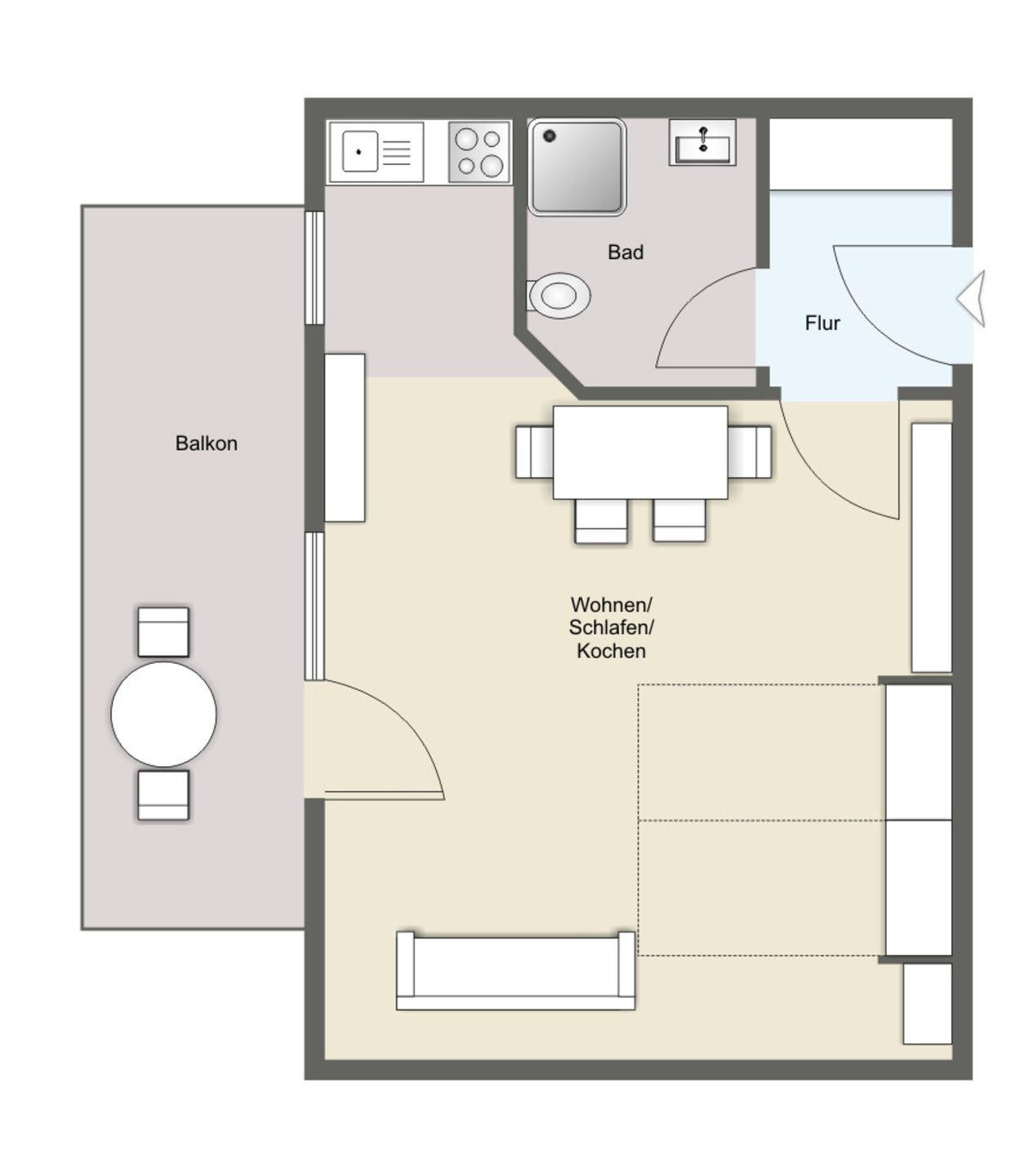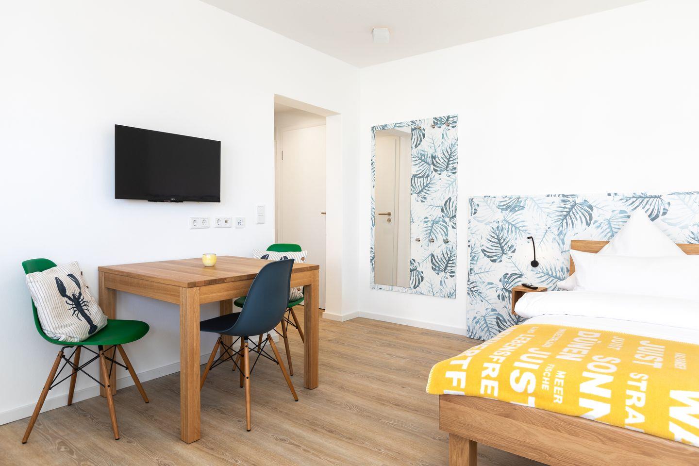 Das Appartement verfügt über ein Doppelbett und ein Schlafsofa sowie einen Esstisch, wo Sie die gemeinsamen Mahlzeiten in Geselligkeit genießen können. Die Kochnische bietet Ihnen alles, was Sie für die Zubereitung Ihrer Lieblingsgerichte benötigen – vom Herd über Kühlschrank, einer Filterkaffemaschine, bis hin zu Geschirr und Kochutensilien. Darüber hinaus verfügen Sie über einen Balkon mit Strandkorb, der sich ideal für entspannende Stunden an der frischen Luft eignet.