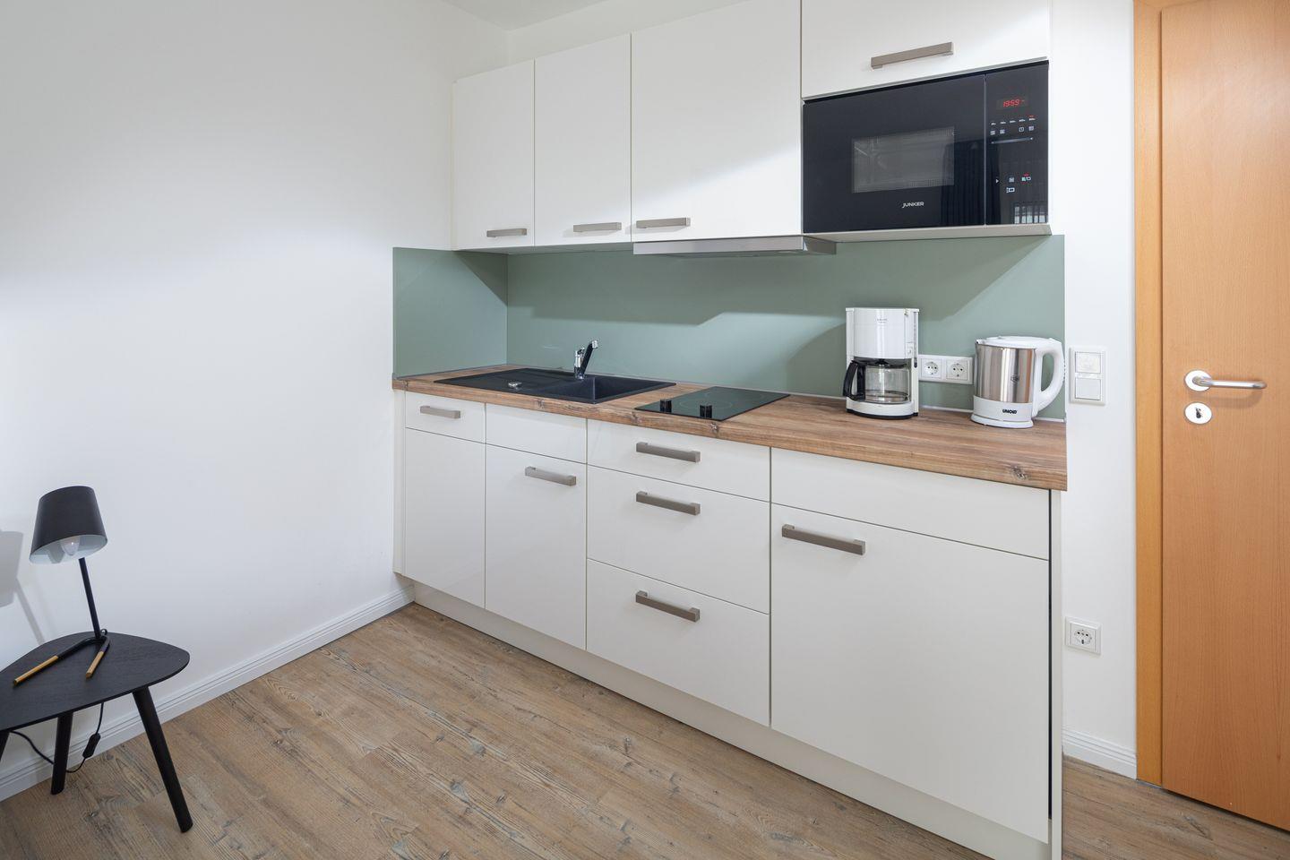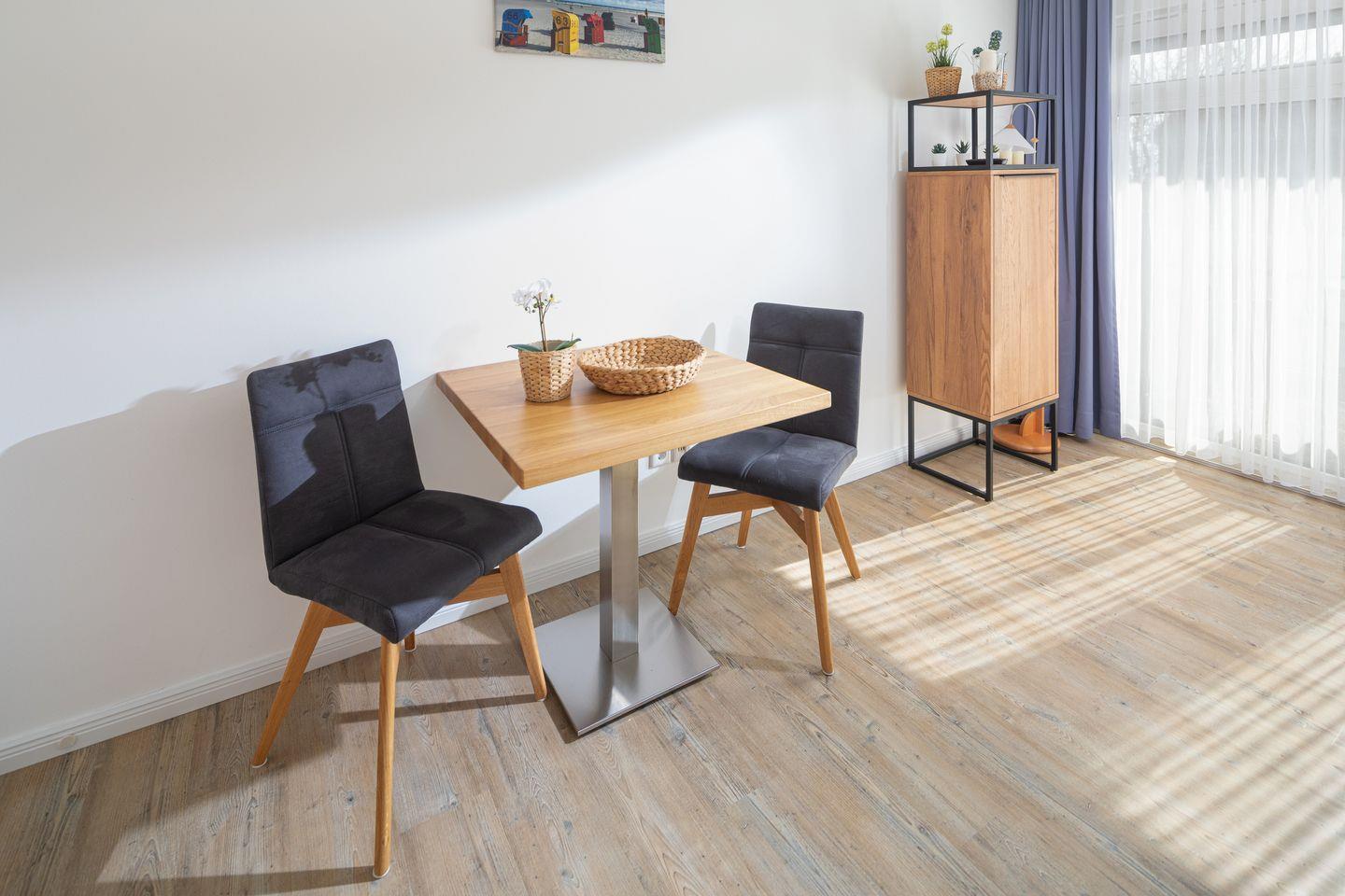 Die Wohnung beeindruckt mit ihrer modernen und allergikerfreundlichen Ausstattung. Sie verfügt über ein gemütliches Doppelbett, einem einladenden Essbereich sowie einer offenen Küche, die bestens mit allen notwendigen Küchenutensilien ausgestattet ist. Hier finden Sie unter anderem eine Spülmaschine, einen Kühlschrank, eine Mikrowelle sowie eine Kaffeemaschine für den perfekten Start in den Tag.