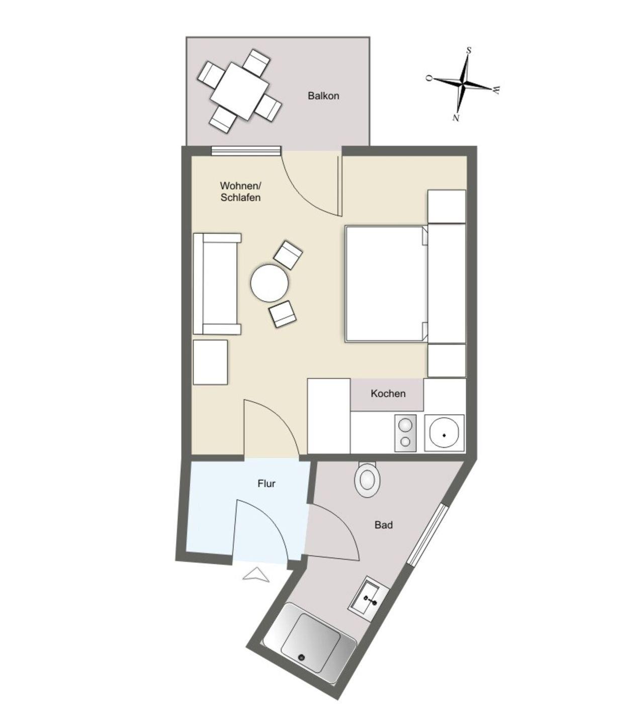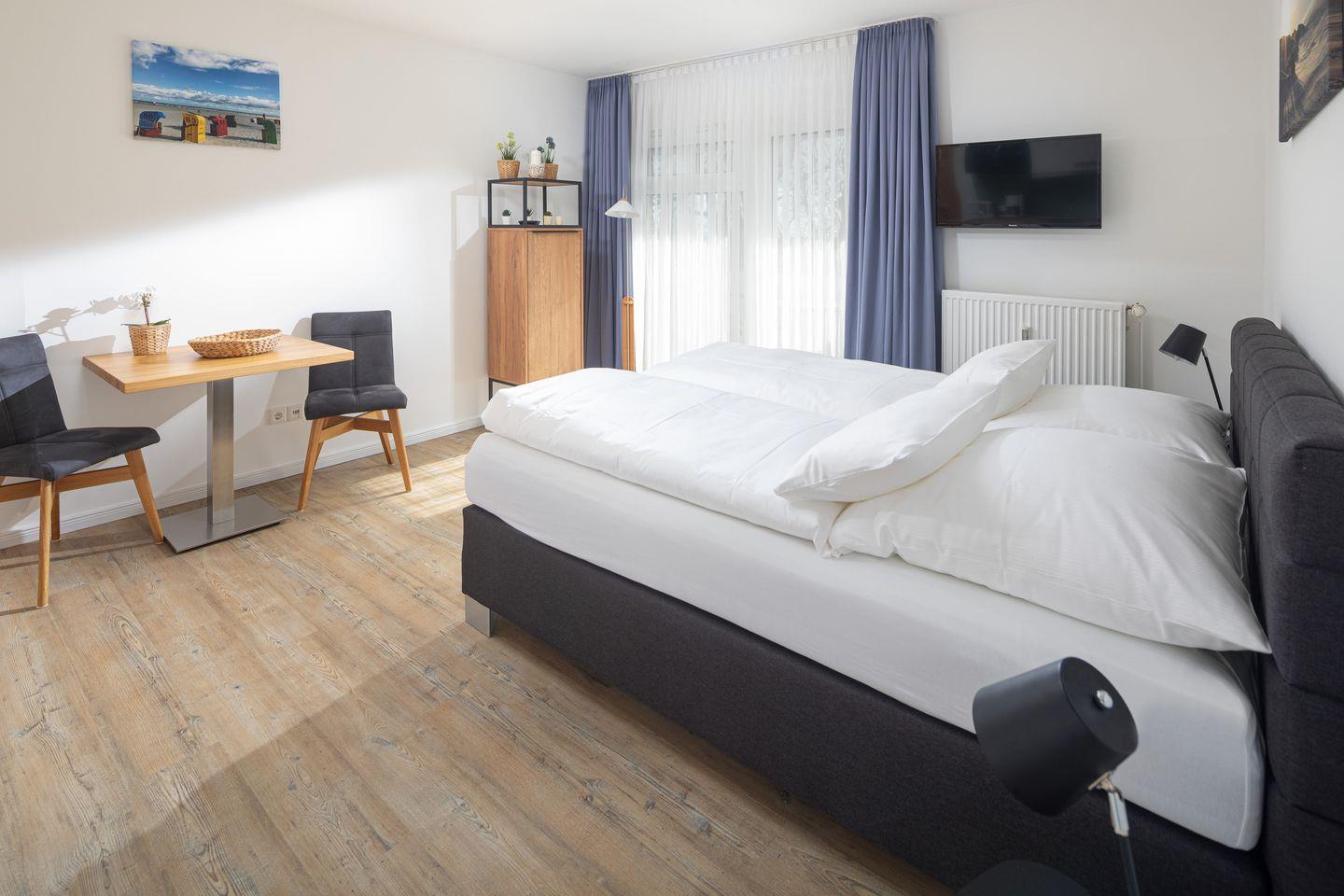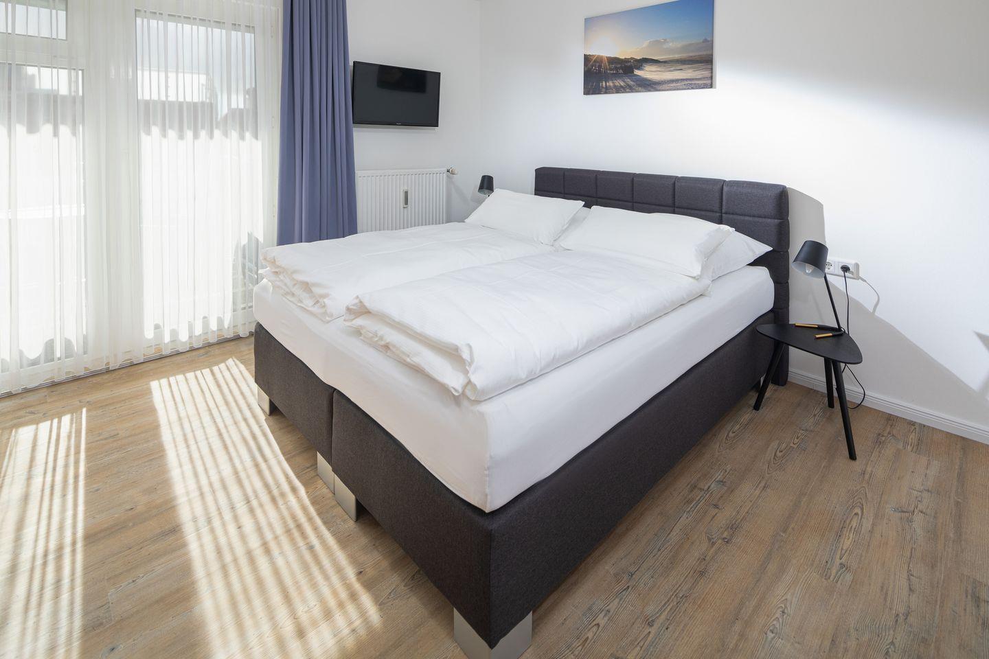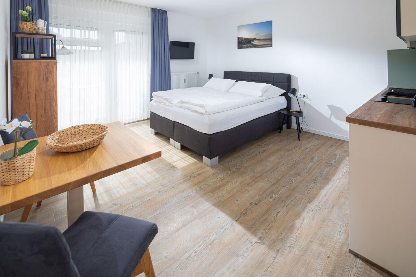 Komfortables 1-Zimmer-App. mit einem Boxspringbett und Zugang zum Südbalkon