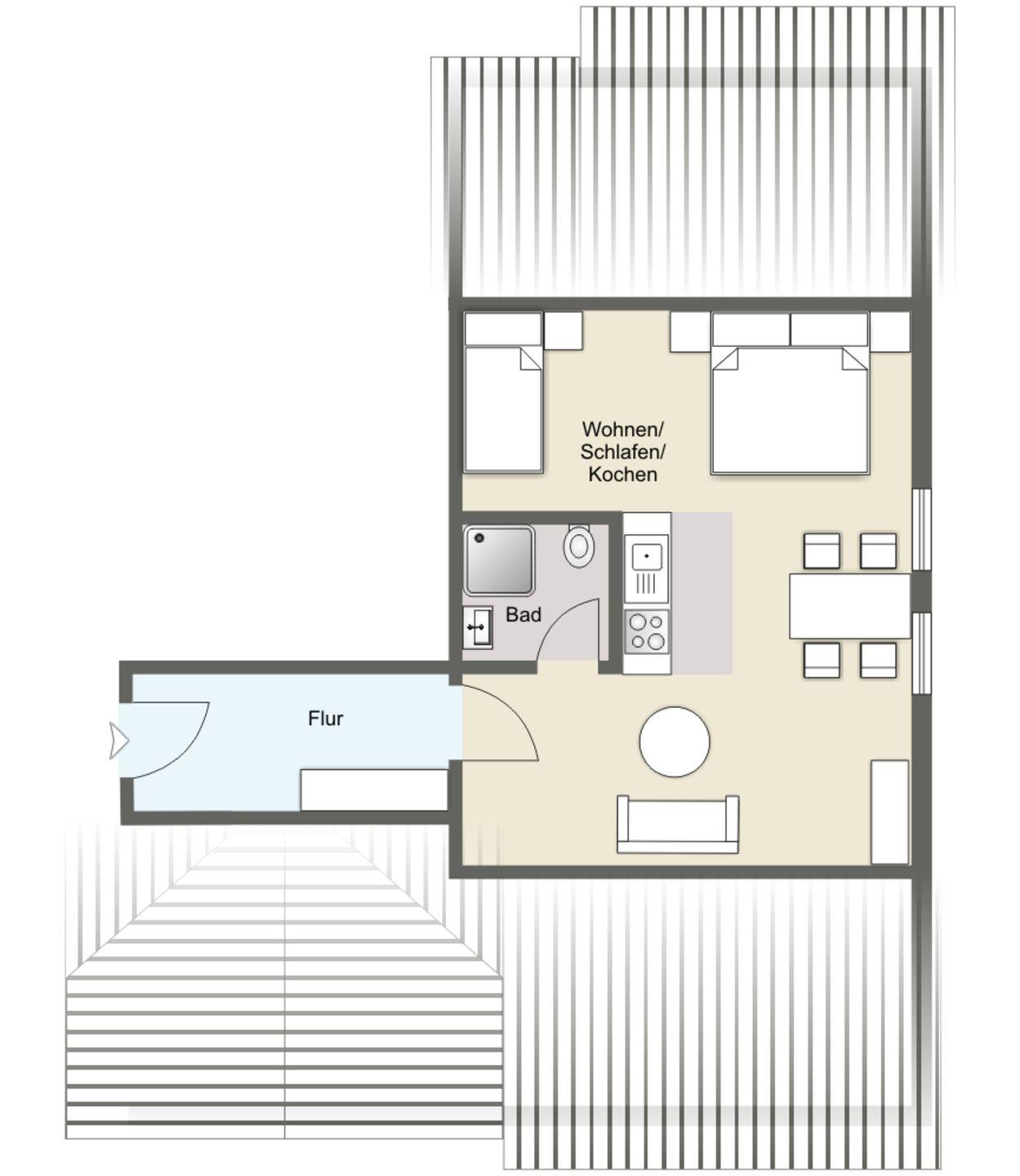 Das Badezimmer ist funktional gestaltet und verfügt über eine Dusche, ein Waschbecken sowie ein WC. Für zusätzlichen Komfort sind Haarfön, Badetücher und eine Erstausstattung an Bettwäsche vorhanden, damit Sie sich gleich wie zu Hause fühlen können. Zudem stehen Ihnen Geschirr und Besteck, sowie Küchenutensilien bereit.