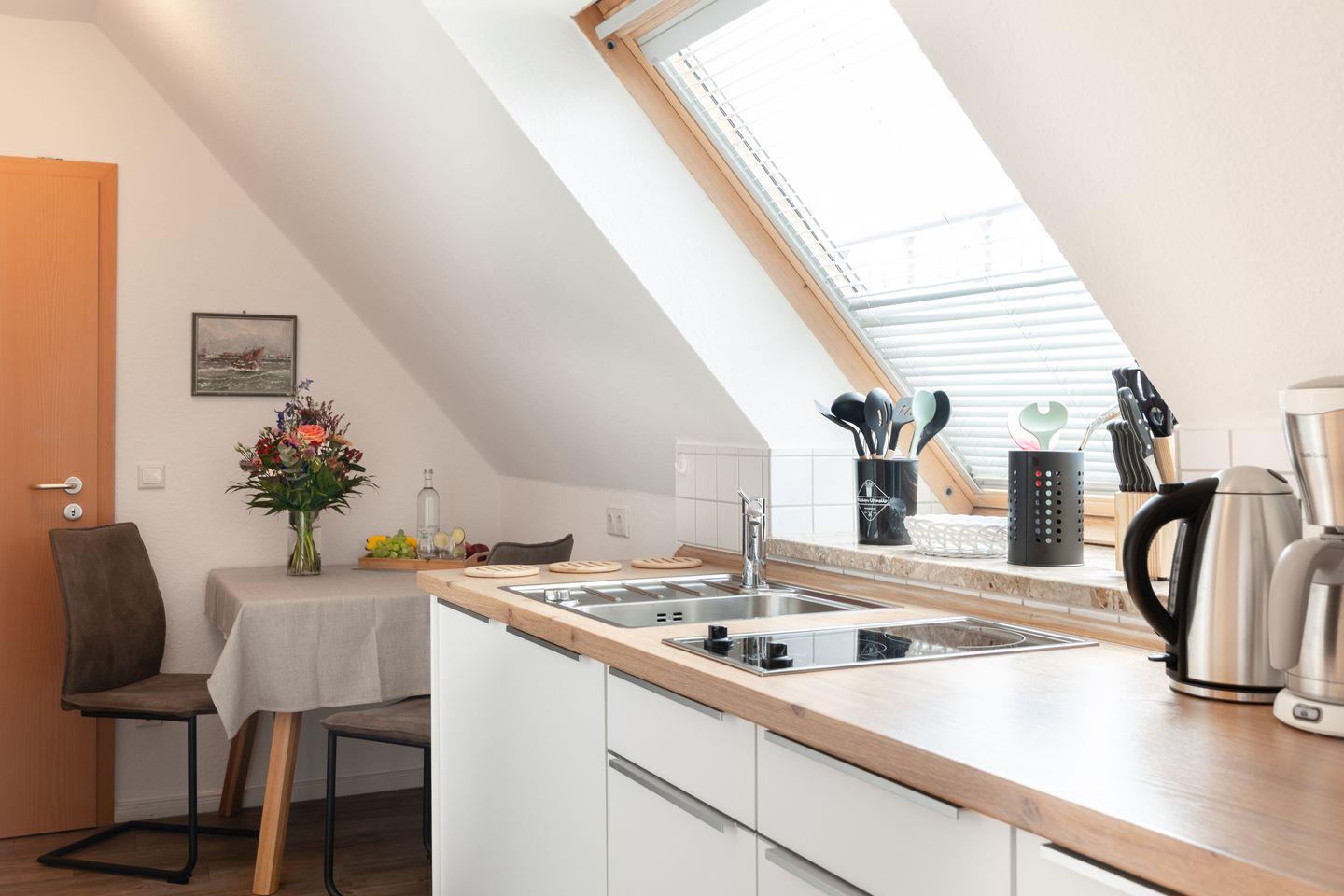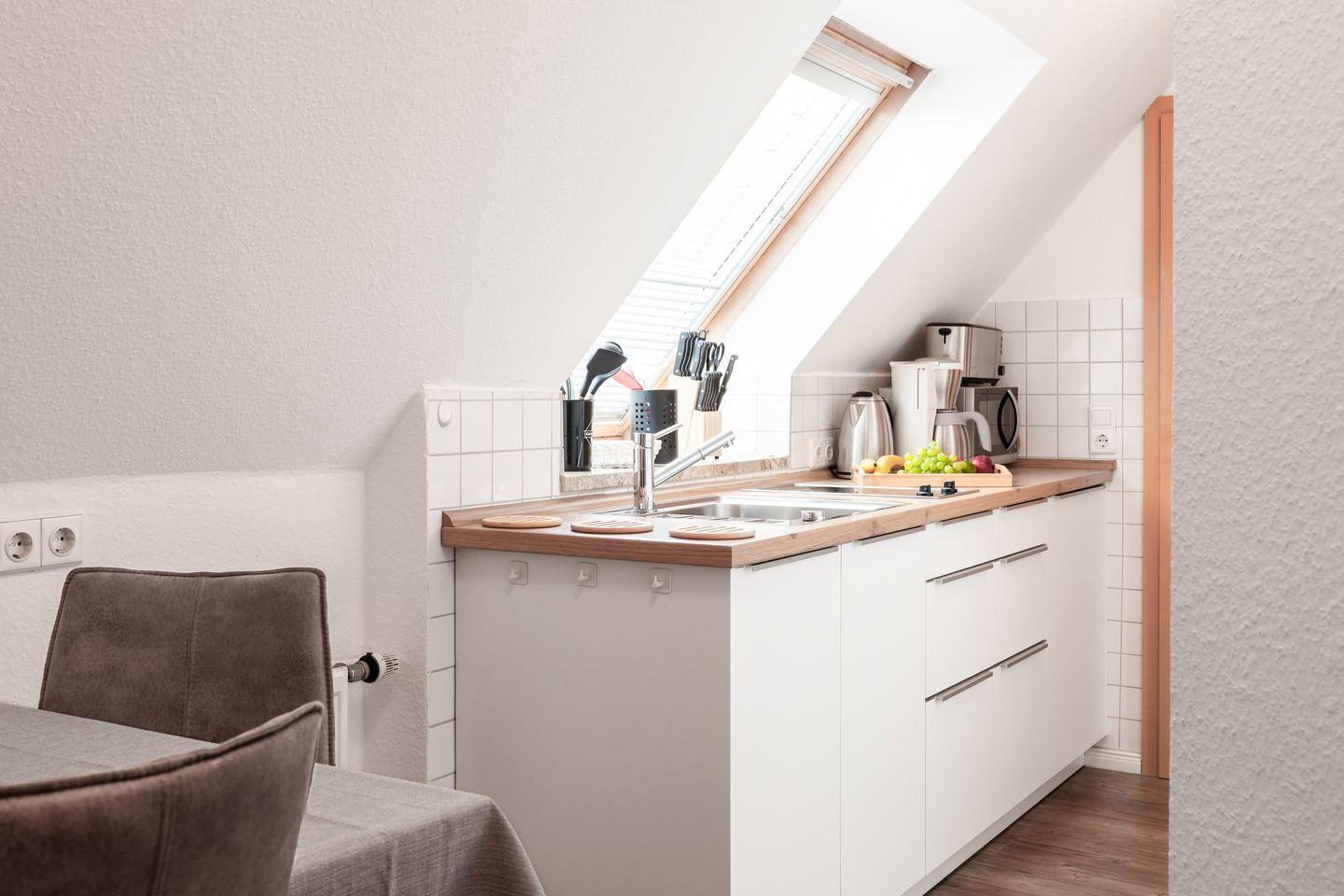Das Herzstück der Wohnung ist der Essbereich, der sich perfekt für gemeinsame Mahlzeiten eignet. Die moderne Kochnische ist mit allem ausgestattet, was Sie benötigen – von einem Herd mit zwei Platten über eine Spülmaschine bis hin zu einer Mikrowelle und einer Kaffeemaschine. Ob Frühstück, Mittagessen oder ein romantisches Dinner – hier können Sie Ihrer Kreativität freien Lauf lassen. Darüber hinaus stehen Ihnen Geschirr, Besteck und Küchenutensilien zur Verfügung.
