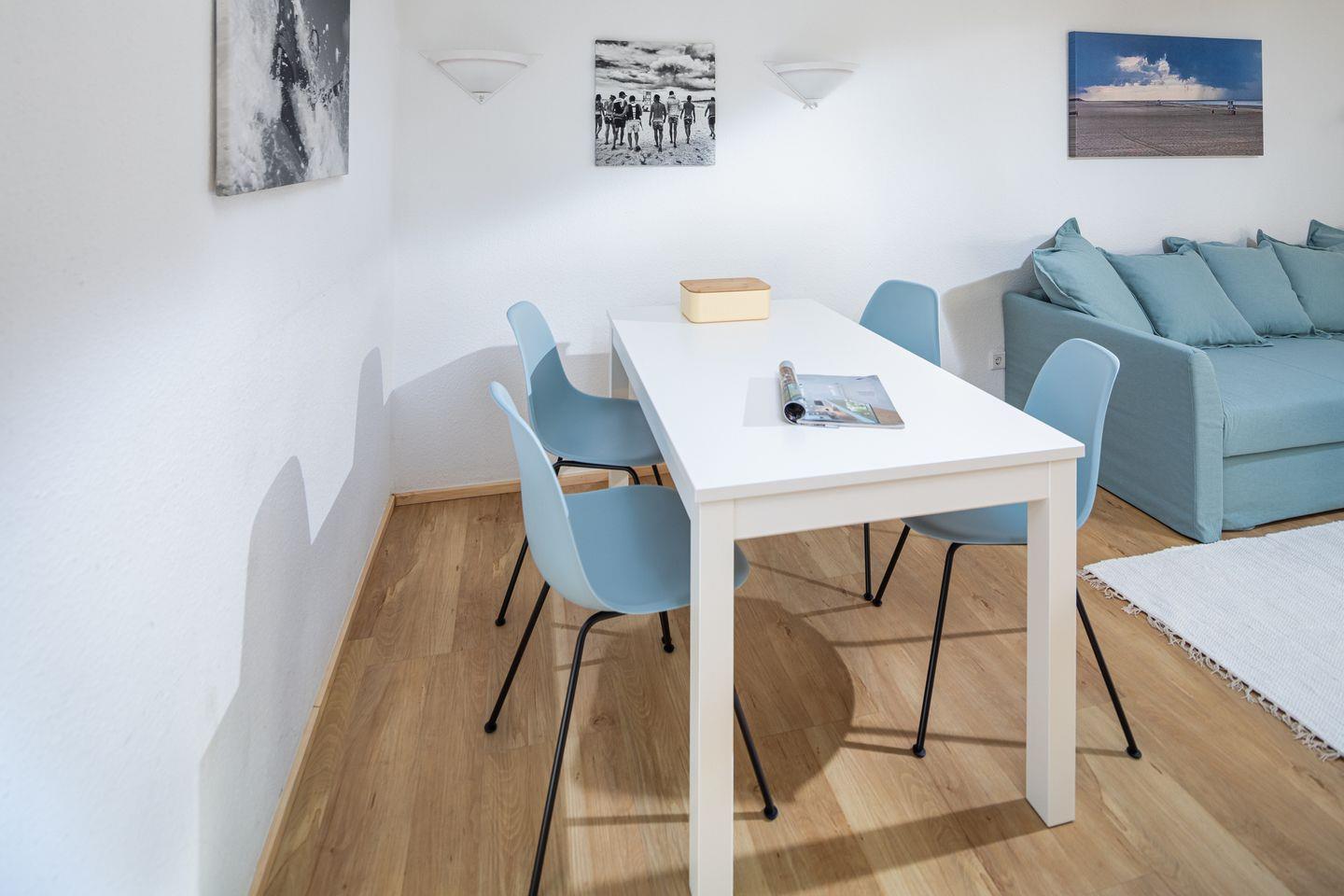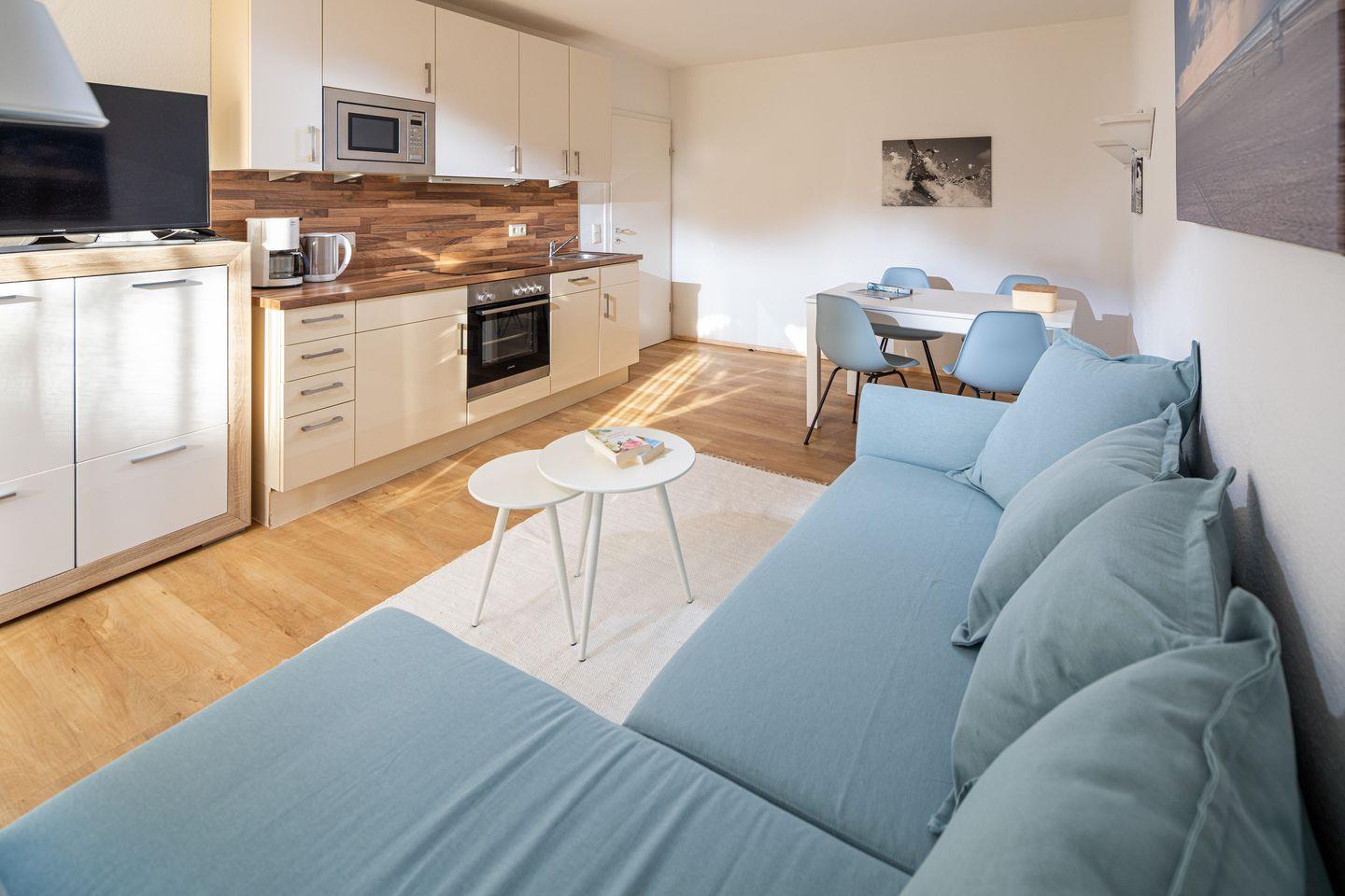 Die Ferienwohnung besticht durch ihre moderne und praktische Ausstattung. Ein gemütliches Schlafzimmer mit Boxspringbett und ein stilvolles Wohnzimmer mit einem komfortablen Sofa, welches als Schlafmöglichkeit für 2 weitere Personen genutzt werden kann. Die offene Küche ist voll ausgestattet. Hier finden Sie alles, was Sie für die Zubereitung leckerer Urlaubsmahlzeiten benötigen — von Herd, Backofen, Geschirrspüler bis hin zu Kaffeemaschine und Mikrowelle. Ein Esstisch bietet genügend Platz für gesellige Abendessen. Die Einheit ist zusätzlich allergikergeeignet und somit ideal für jeden Gast.