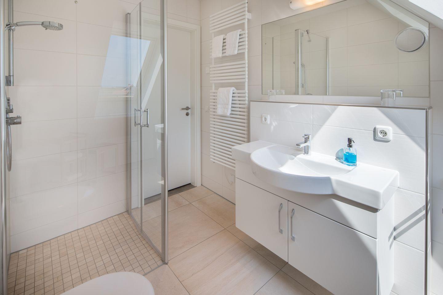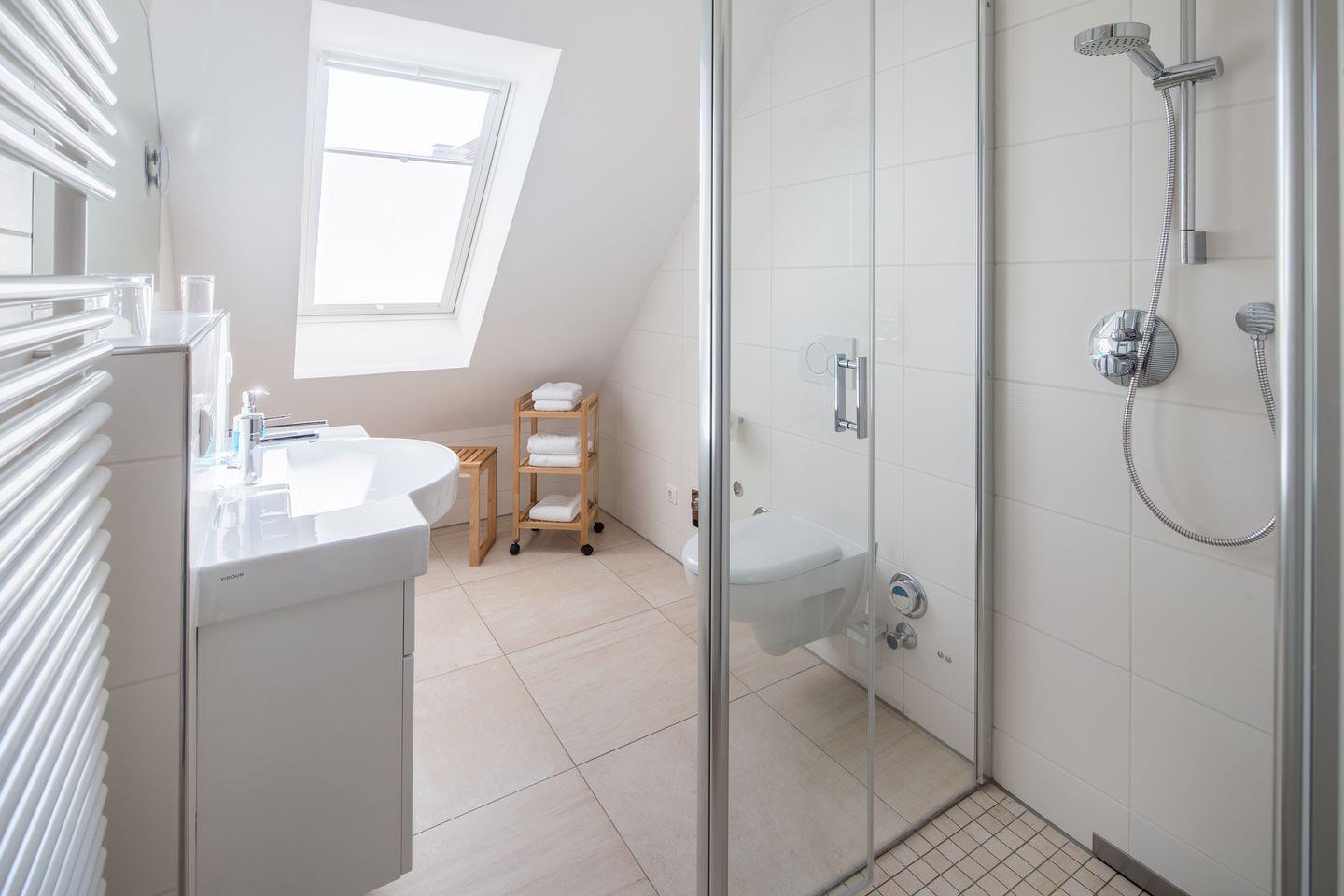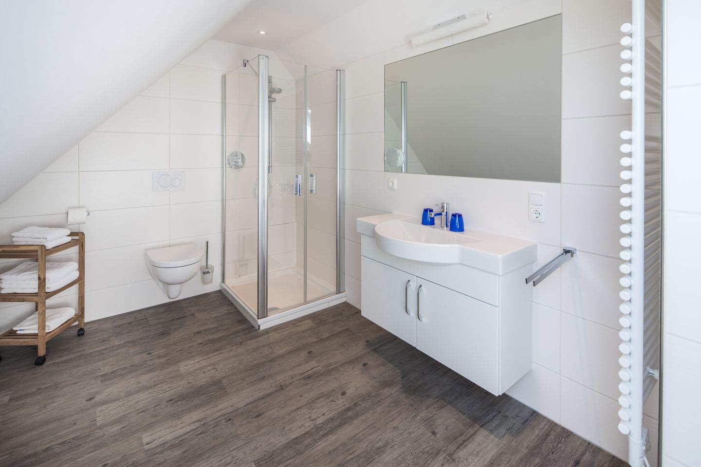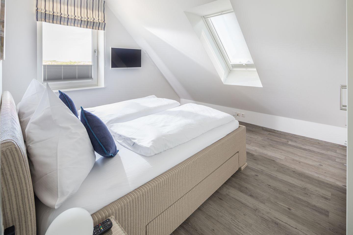 Der Küche mit Esstisch fehlt es an nichts: das Induktionskochfeld, der Backofen, die Mikrowelle und eine Spülmaschine runden das Angebot ab. Das erste Schlafzimmer liegt auf der ersten Ebene neben dem Duschbad. Das zweite Schlafzimmer befindet sich im gemütlichen Spitzboden – auch mit eigenem, separatem Bad. Der große Nordwest-Balkon lässt den Blick zu den Dünen und ins Watt schweifen.