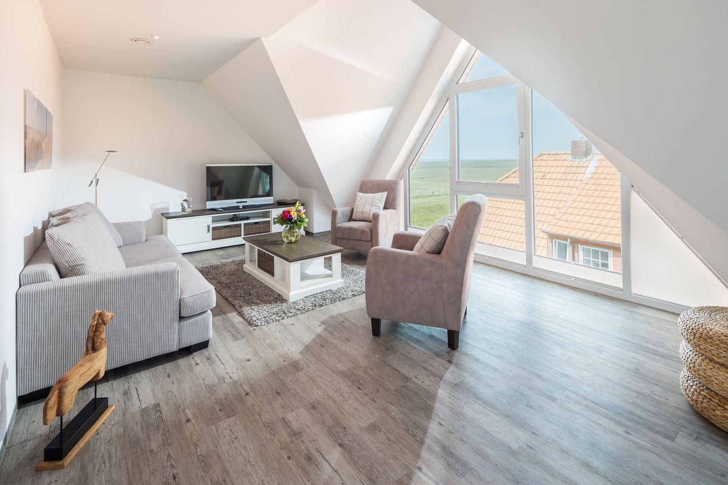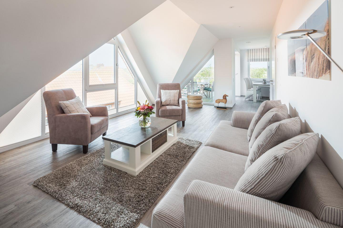 Ihr Urlaubsdomizil hat ca. 85 Quadratmeter. Es liegt im 2. Geschoss und erstreckt sich über zwei Etagen. Der helle und geschmackvoll eingerichteten Wohnbereich lädt mit einem großen Sofa, zwei Sesseln, Fernseher (und DVD-Player), Musikanlage und W-LAN zum Verweilen ein.