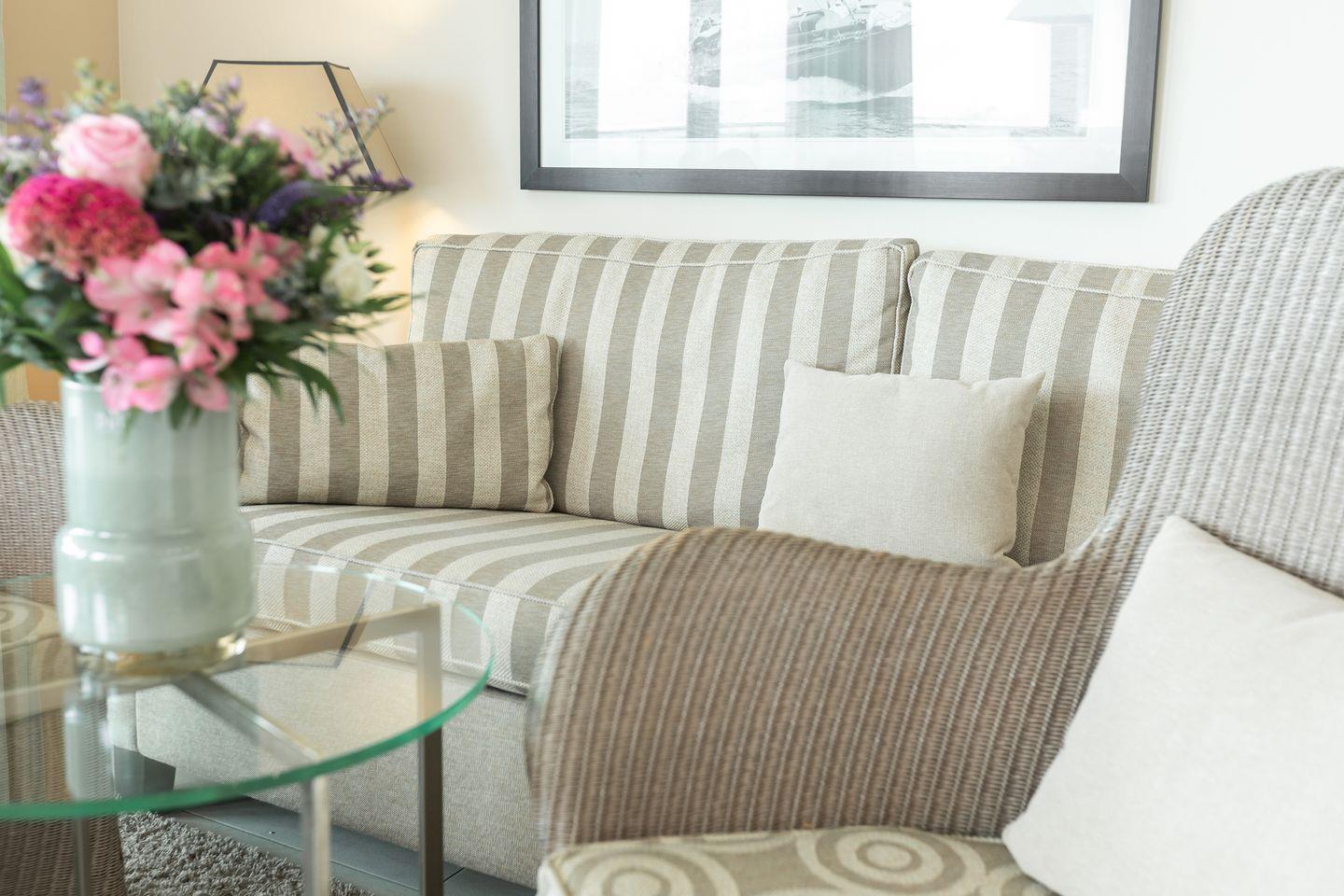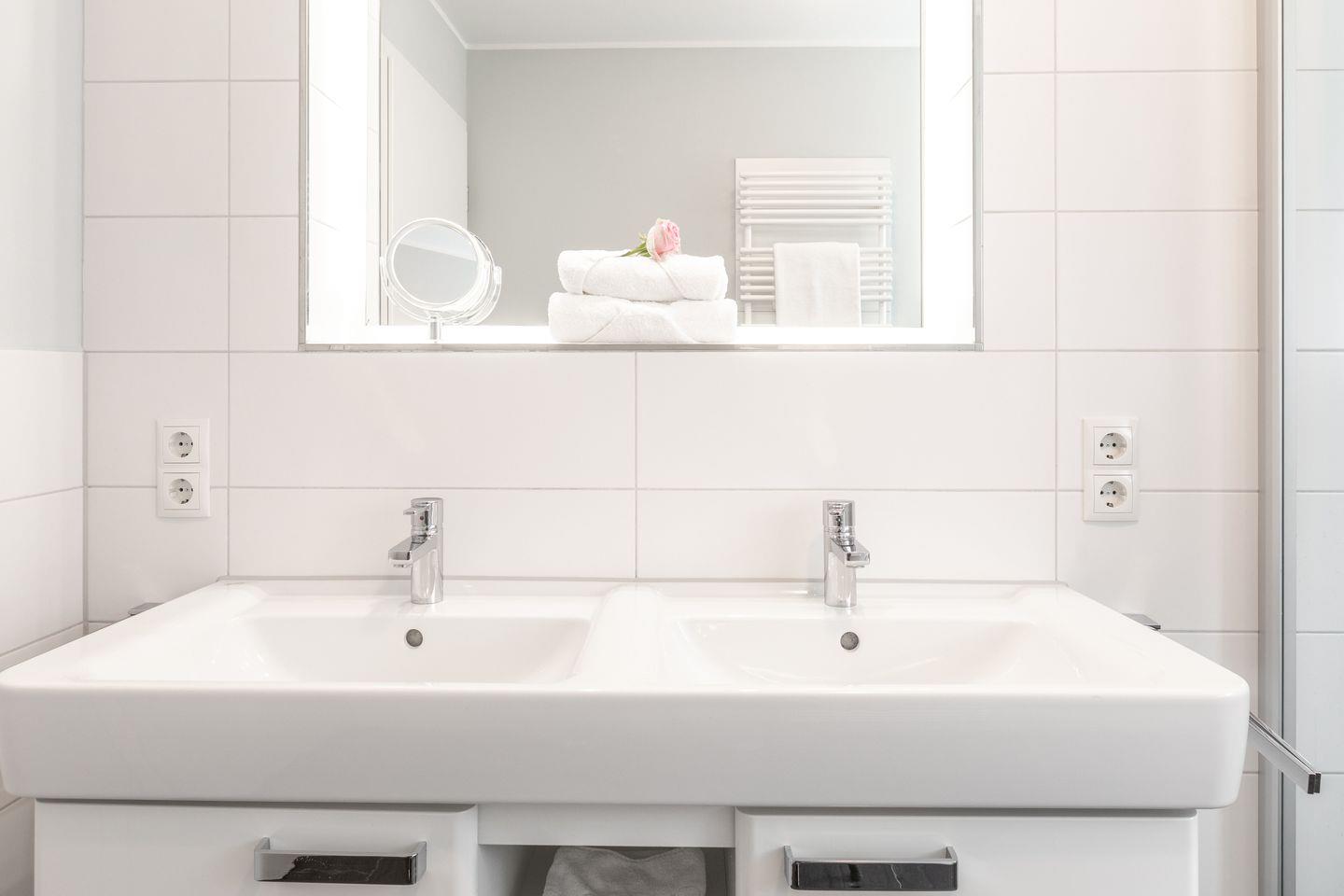 Zur Ausstattung der Ferienwohnung gehören 2 Schlafzimmer, eine Küchenzeile mit modernen Geräten, ein Bad mit großzügiger Dusche und Doppelwaschbecken.