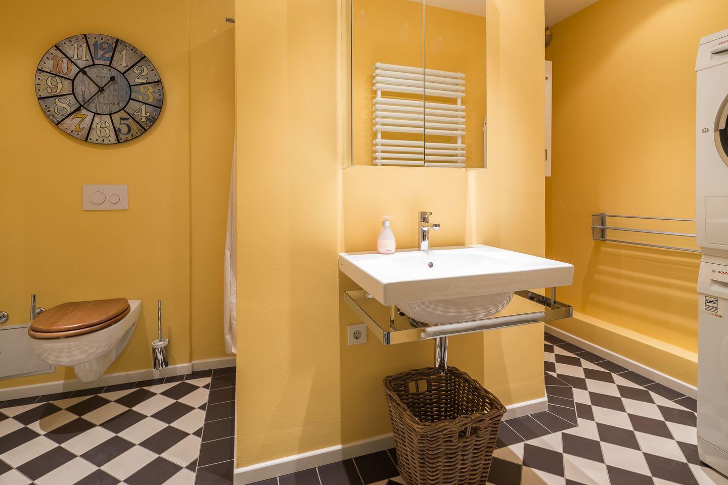 Eine Waschmaschine und ein Trockner befinden sich im Badezimmer.