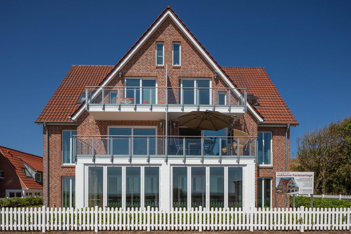 In dieser Anlage bieten wir Ihnen eine der exklusivsten Wohnungen mit Blick Richtung Watt an. Im ersten Stock des Hauses befindet sich diese moderne Ferienwohnung, die durch Eleganz und Komfort besticht. Diese niveauvolle Immobilie ist mit modernster Technologie und Einrichtung und ermöglicht die Unterbringung von bis zu 4 Personen. 2 Schlafzimmer mit Doppelbetten, ein Wohnzimmer mit einer modernen Küchenzeile und modernen Geräten, ein Duschbad und ein nach Süden ausgerichteter Balkon mit Strandkorb gehören zur gehobenen Ausstattung dieser Ferienwohnung, die die höchsten Ansprüche unserer Gäste erfüllt. Die gesamte Wohnung verfügt über eine komfortable Inneneinrichtung und wird die Herzen unserer Gäste höher schlagen. In nur wenigen Gehminuten erreicht man das Zentrum der Insel und den Strand. Werden Sie unsere Gäste und genießen Sie den Aufenthalt in der Wohnung Wattglück.