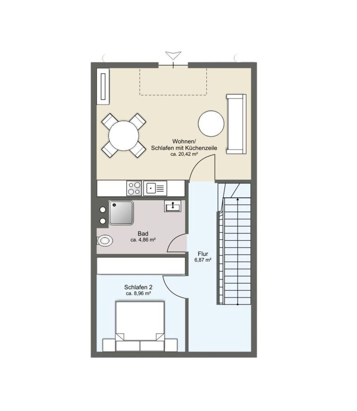 Die in zwei Etagen gegliederte Unterkunft umfasst insgesamt drei Zimmer, darunter zwei separate Schlafzimmer ( 1 SZ mit Doppelbett, ein SZ mit 2 Einzelbetten ), die sich für Familien oder gemeinsam reisende Paare eignen. Im offen gehaltenen Wohn- und Essbereich sorgen eine Sofaecke mit TV sowie WLAN für angenehme Unterhaltung und Konnektivität. Dabei bleibt genügend Platz, sich am Esstisch gemeinsam zu den Mahlzeiten zu treffen.