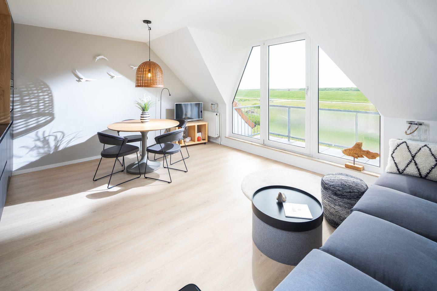 Die Ferienunterkunft „Deichloft“ bietet auf 45 m² ein durchdachtes und komfortables Ambiente für bis zu vier Personen. Mit einem guten Meerblick können Sie das maritime Panorama sowohl vom Objekt als auch vom eigenen Balkon genießen – ein idealer Rückzugsort nach einem Tag am Strand.