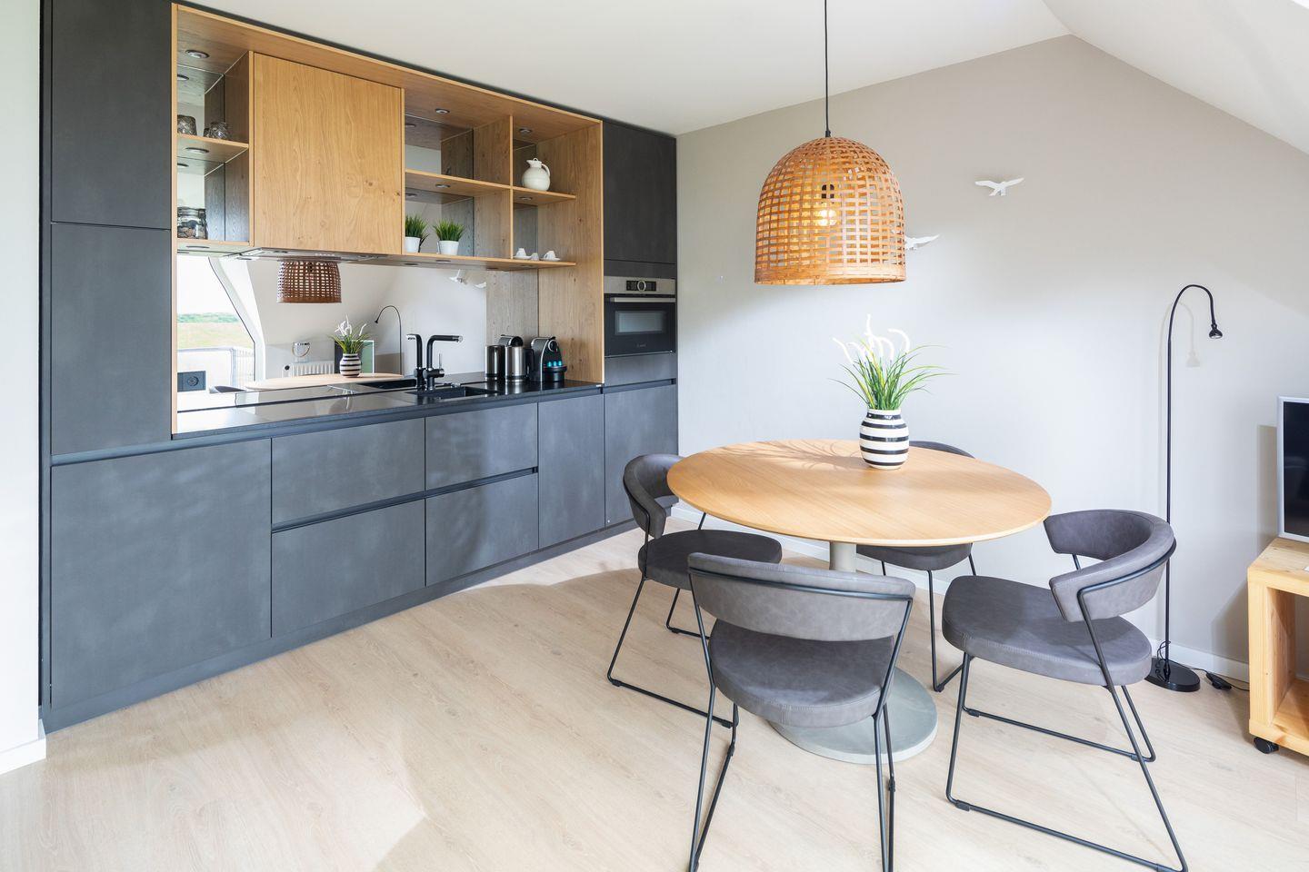 Die offene Küche integriert sich harmonisch in das Wohnkonzept. Sie ist vollständig mit Ceranherd, Spülmaschine, Kühlschrank mit Gefrierfach, Mikrowelle, Kaffeemaschine, Wasserkocher, Toaster und Küchenutensilien ausgestattet. So können Sie ohne Aufwand Ihre Lieblingsgerichte zubereiten. Für den praktischen Komfort stehen Ihnen Geschirr, Besteck, Geschirrhandtücher, Reinigungsmittel und ein Staubsauger zur Verfügung.