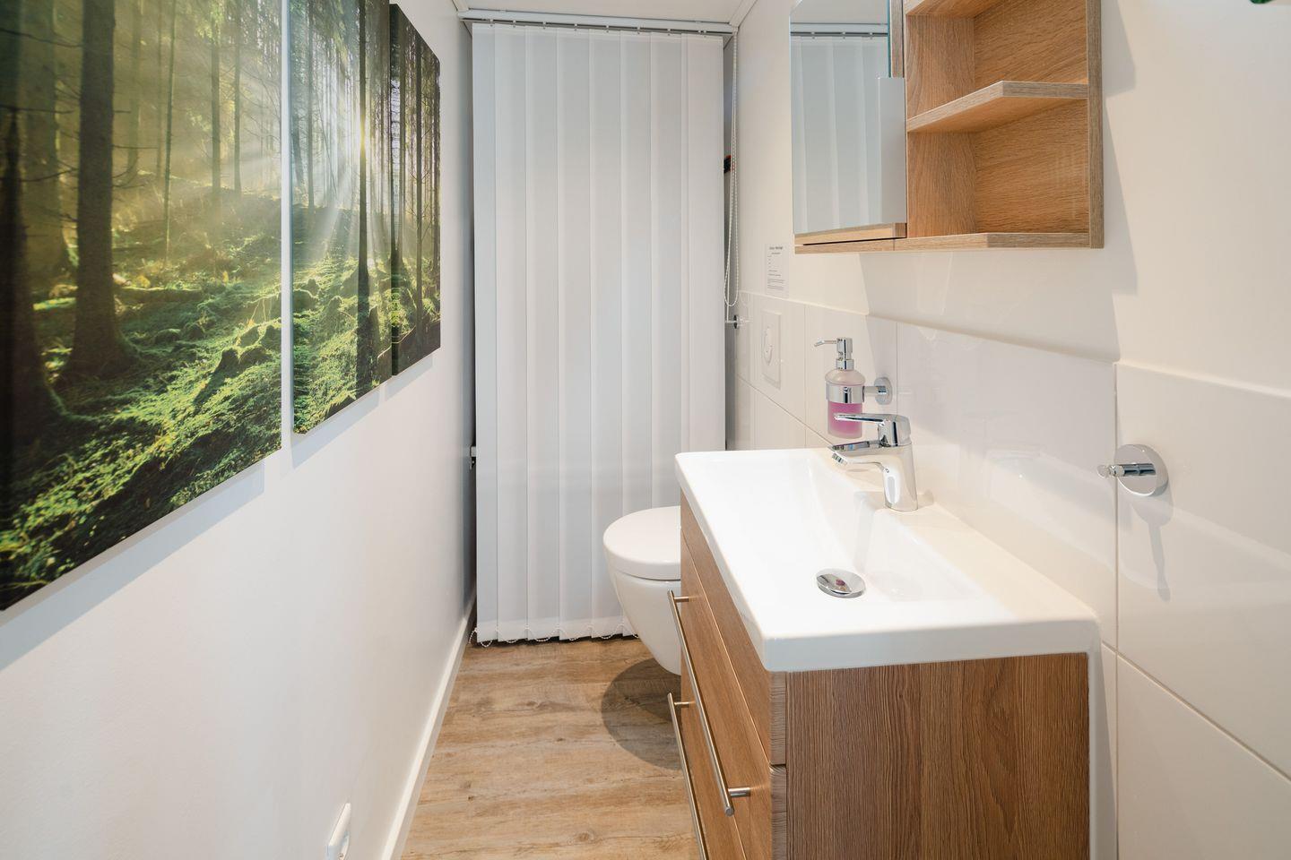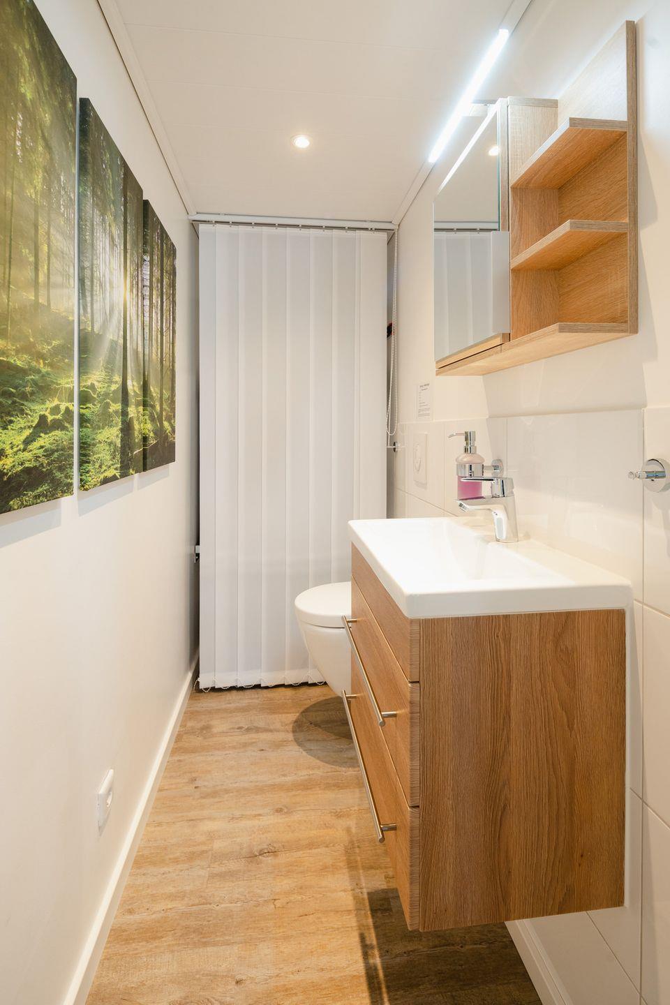 Ein zusätzliches WC lässt Staus vor der Badezimmertür vergessen. Hier befinden sich – dezent hinter einem Vorhang verborgen - auch die Waschmaschine mit Trocknerfunktion und praktische Haushaltshelfer.
