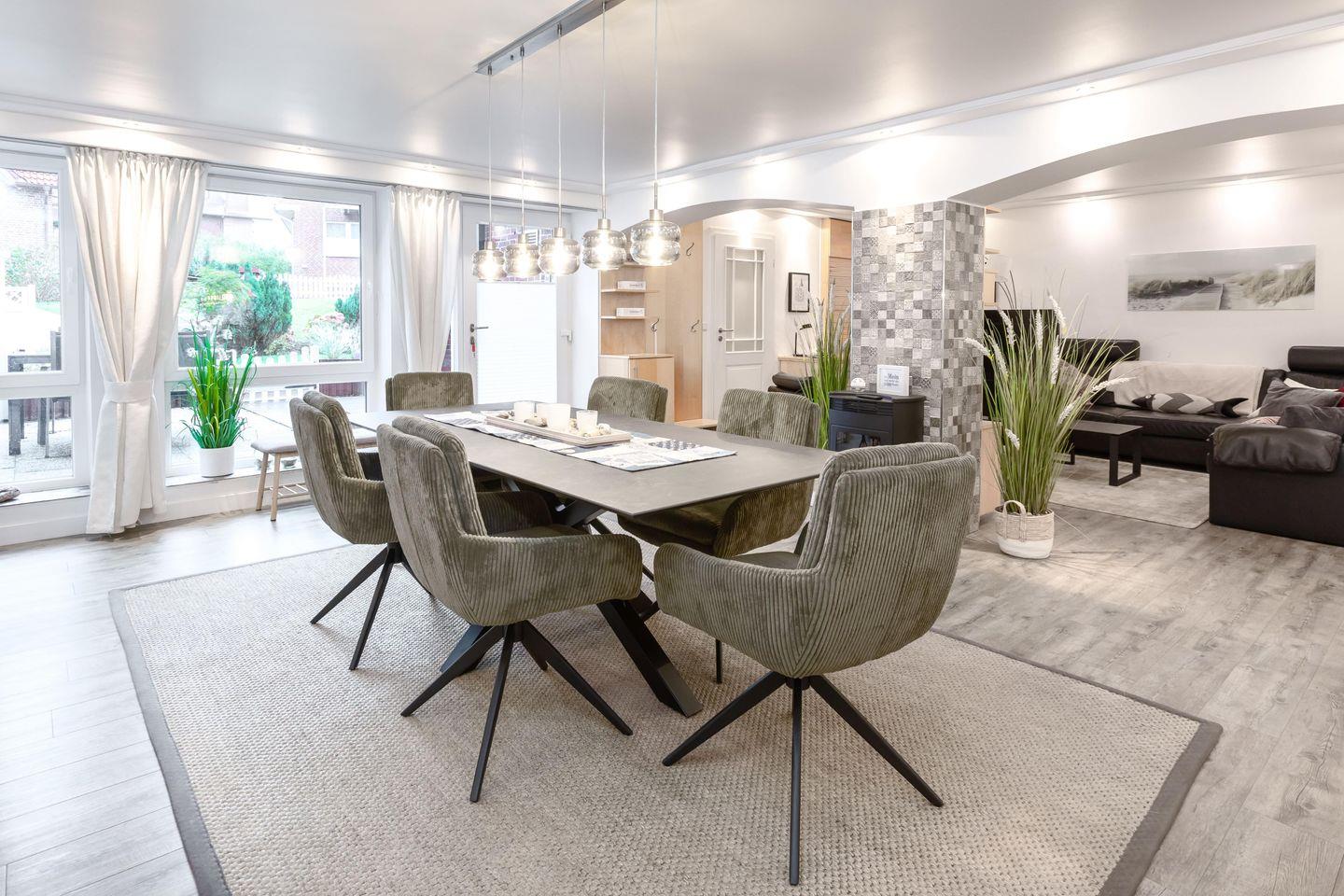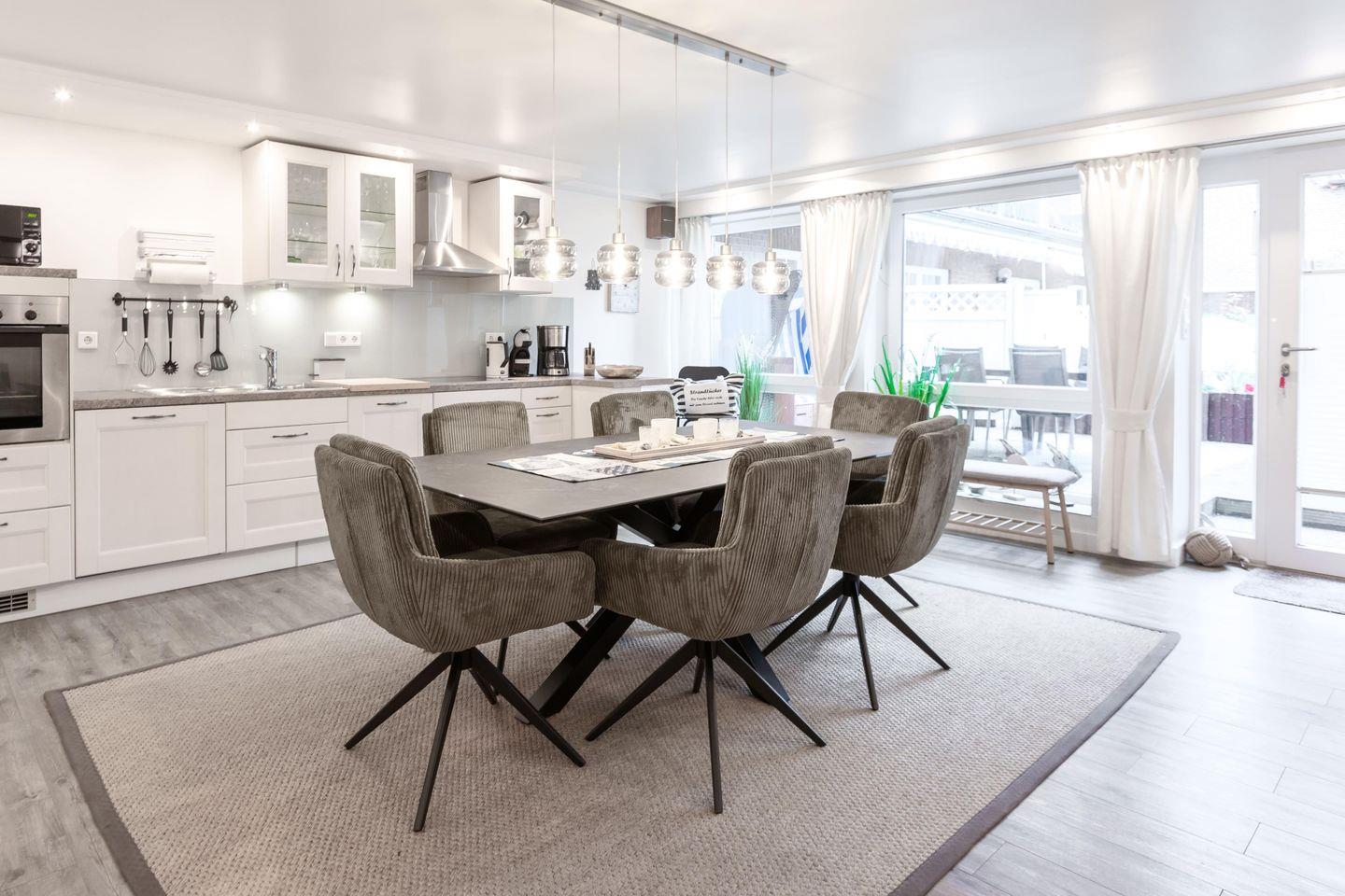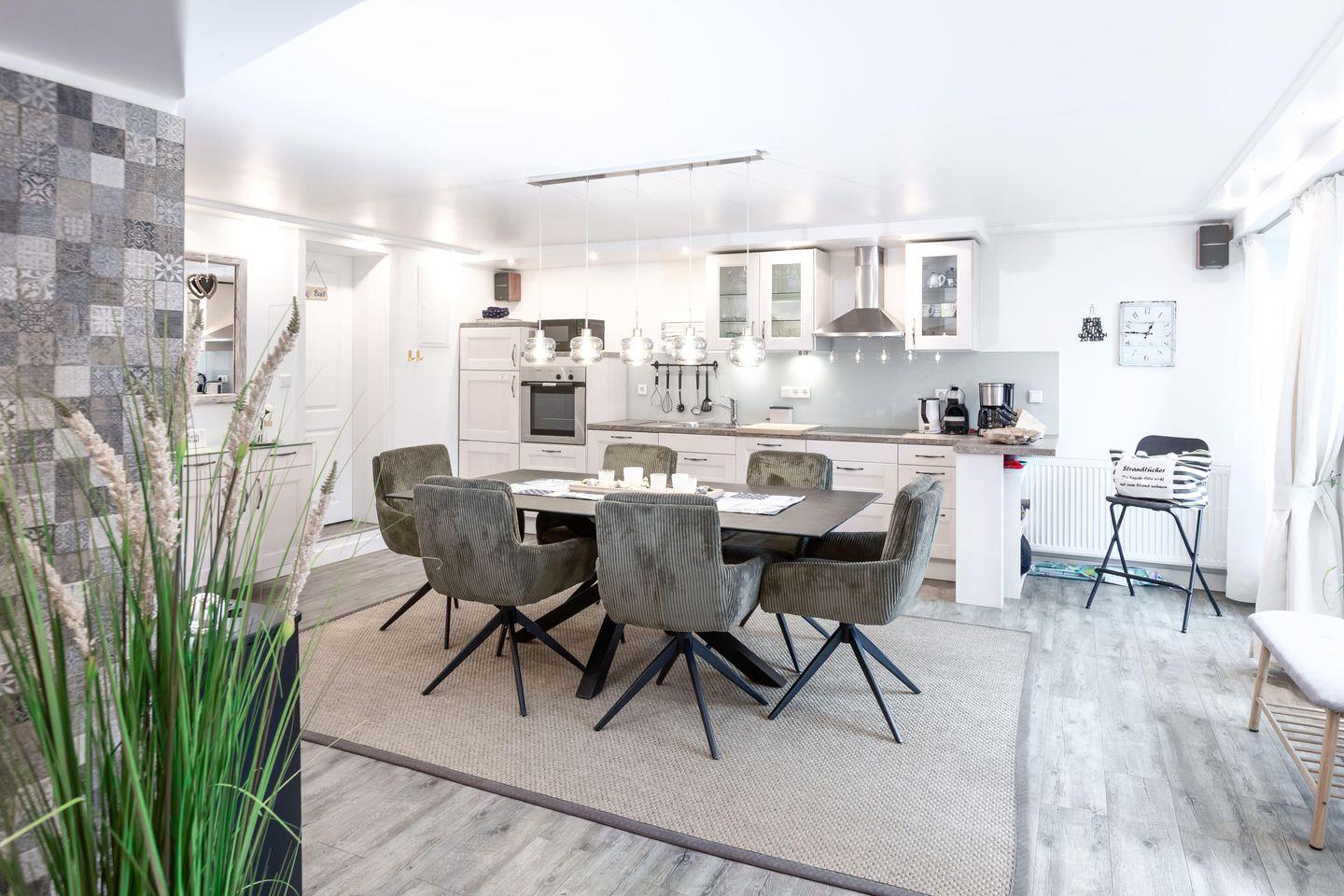 Beim Eintreten beeindruckt sofort der großzügige, ca. 48 m² große Wohn- und Essbereich mit seinem besonderen Flair und Blick in den Garten durch eine fast bodengleiche Fensterfront. Kinder haben hier viel Platz zum Spielen. Die mit Mikrowelle, Dolce Gusto Kaffeeautomat, Filterkaffeemaschine, Toaster, Wasserkocher, Backofen, Induktionskochfeld und Kühl-/Gefrierschrank komplett ausgestattete Küche und der riesige Esstisch laden dazu ein, sich selbst zu beköstigen. Abends oder bei schlechtem Wetter kann man sich hier mit Gesellschaftsspielen bequem ausbreiten. Der elektrische Kaminofen in der Mitte des Wohn-/Essbereichs lässt Romantikerherzen höher schlagen.