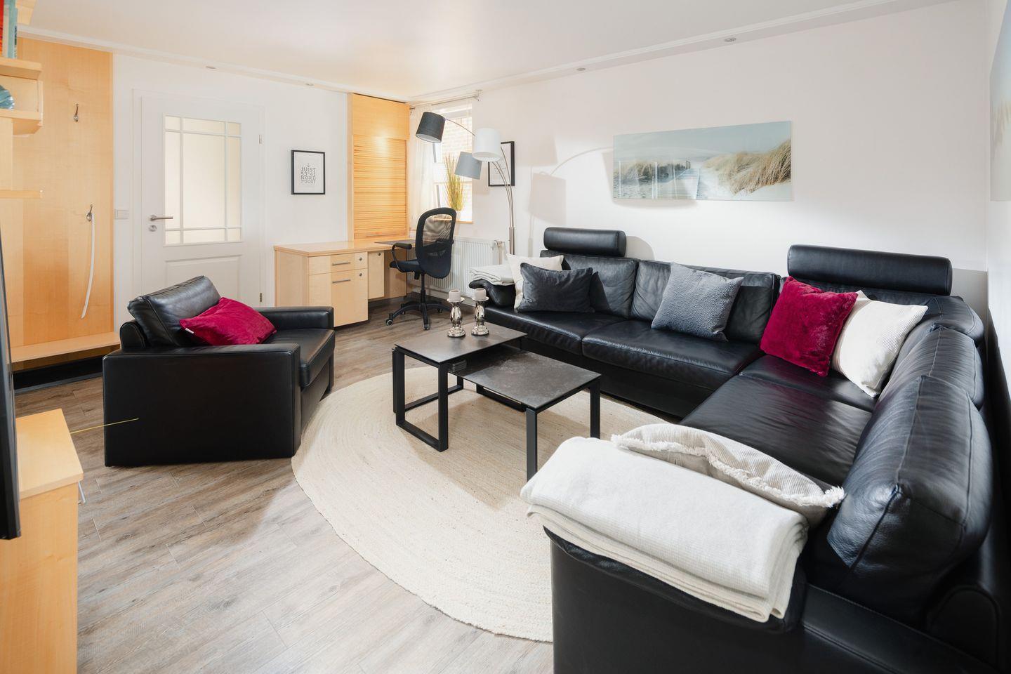 Ein großer Fernseher, das gemütliche Ledersofa, zwei getrennte Schlafzimmer (beide mit Doppelbetten, eines mit zusätzlichem Fernseher) sorgen für Entspannung. Im großen Badezimmer mit Doppelwaschbecken und Dusche befindet sich auch die gemütliche Drei-Personen-Sauna. Saunatücher sind vorhanden!