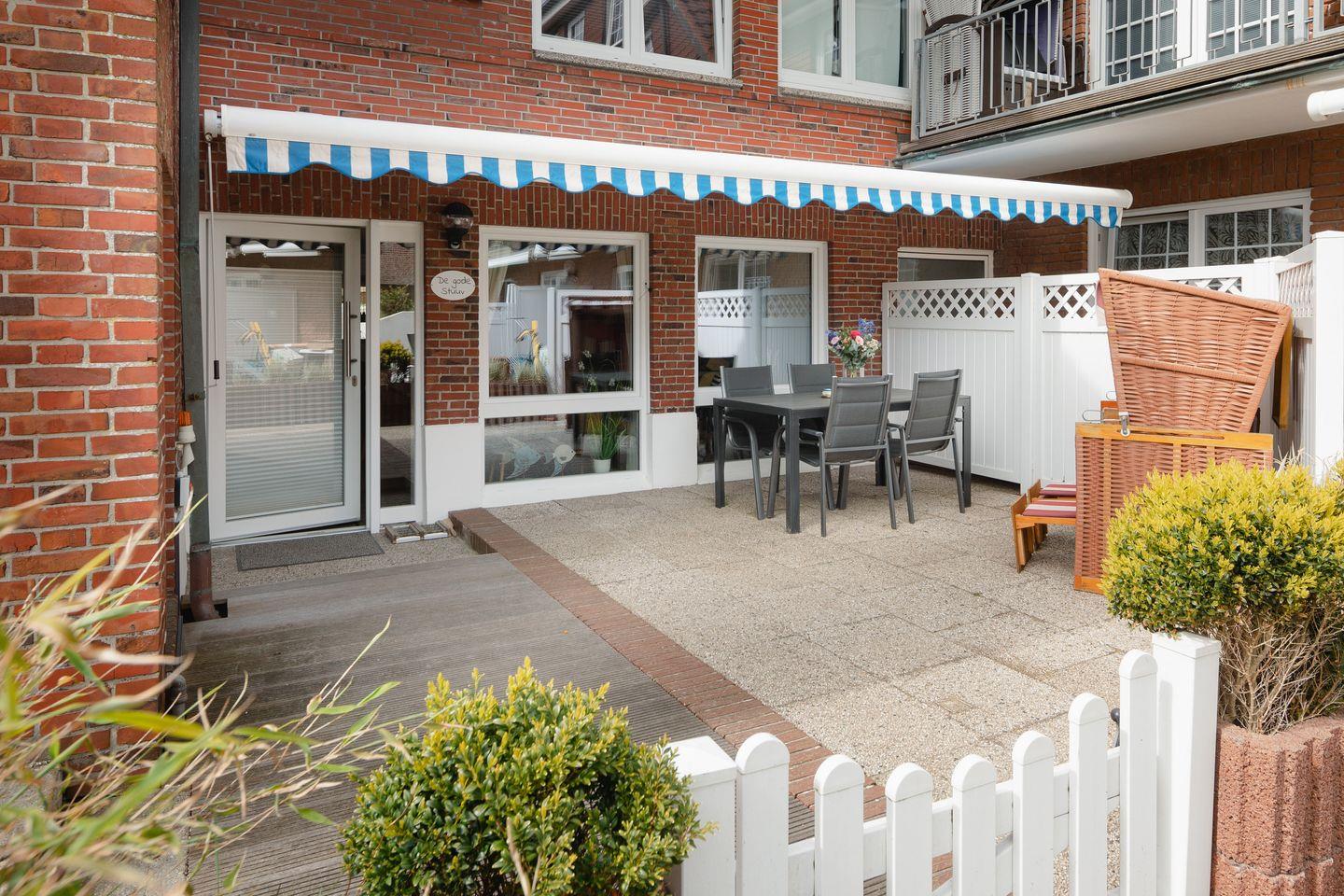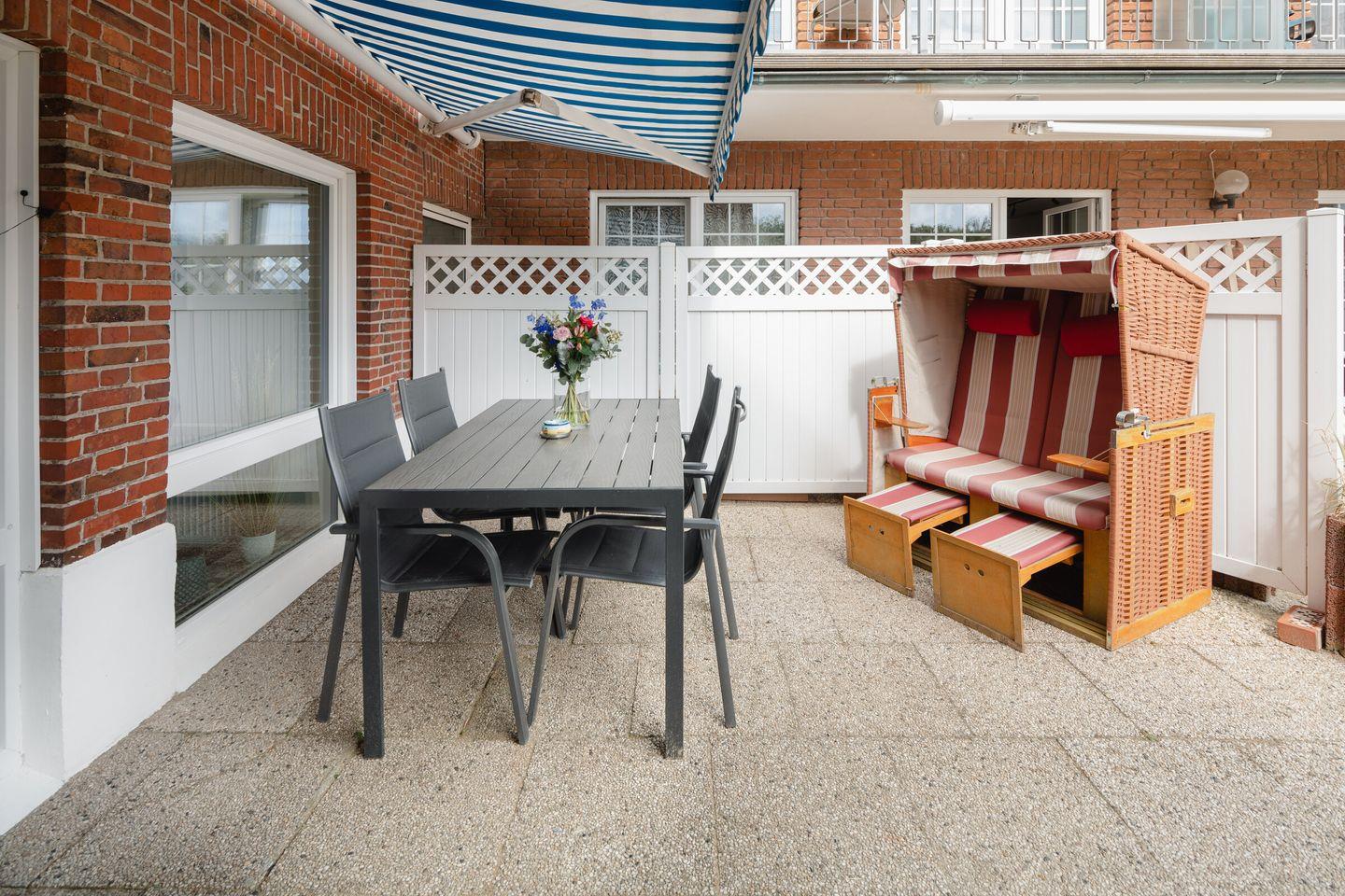 Zur Wohnung gehört eine ebenerdige, 36 m² große und windgeschützte Terrasse mit Markise, Sitzgruppe und Strandkorb, direkt an den Garten angrenzend.