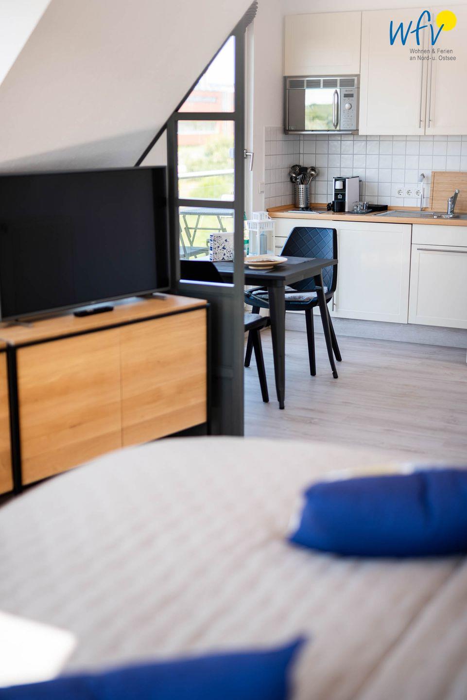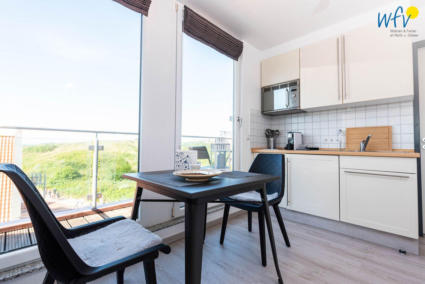 Die moderne offene Einbauküche mit hochwertigen Geräten wie 2-Platten-Ceranherd, Mikrowelle und Kühlschrank mit Gefrierfach ermöglicht Ihnen eine bequeme Selbstverpflegung. Oder Sie lassen sich kulinarisch verwöhnen: Zu einem Sonderpreis können Sie im "Hotel Atlantic" frühstücken (3 Min. Fußweg) - täglich zwischen 8 und 12 Uhr.