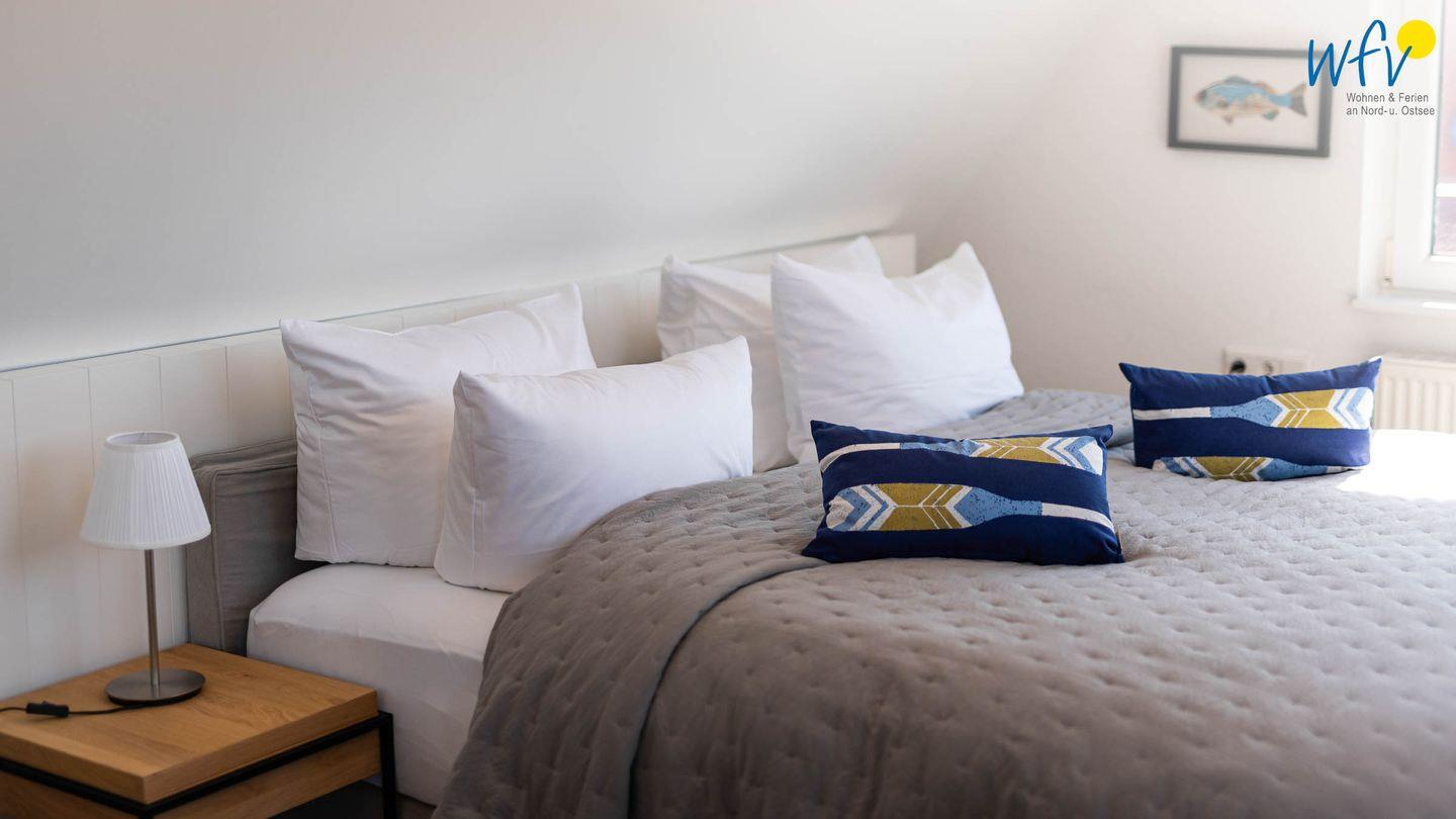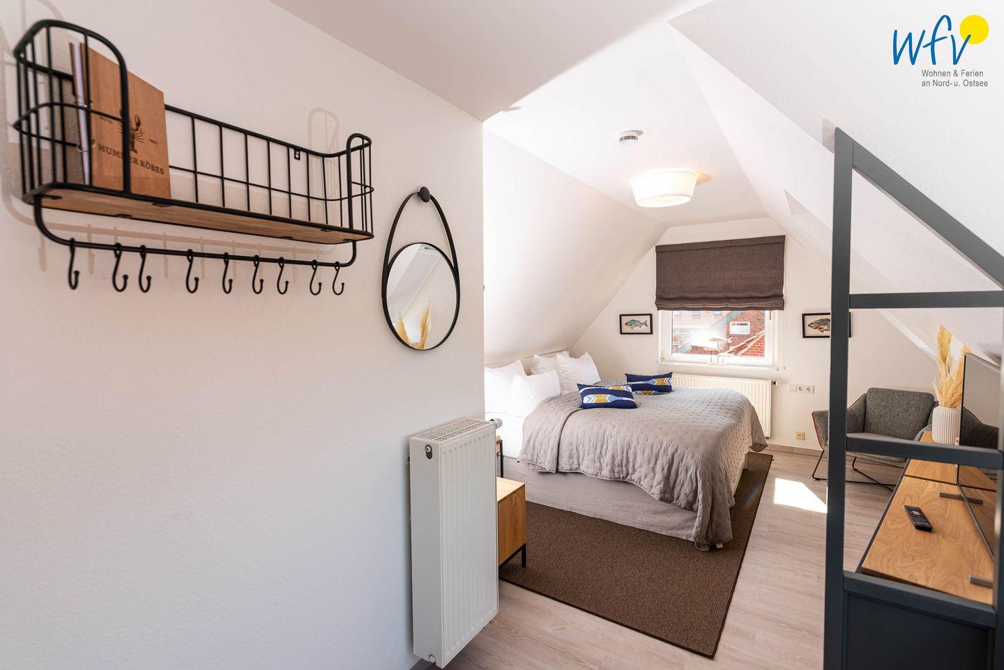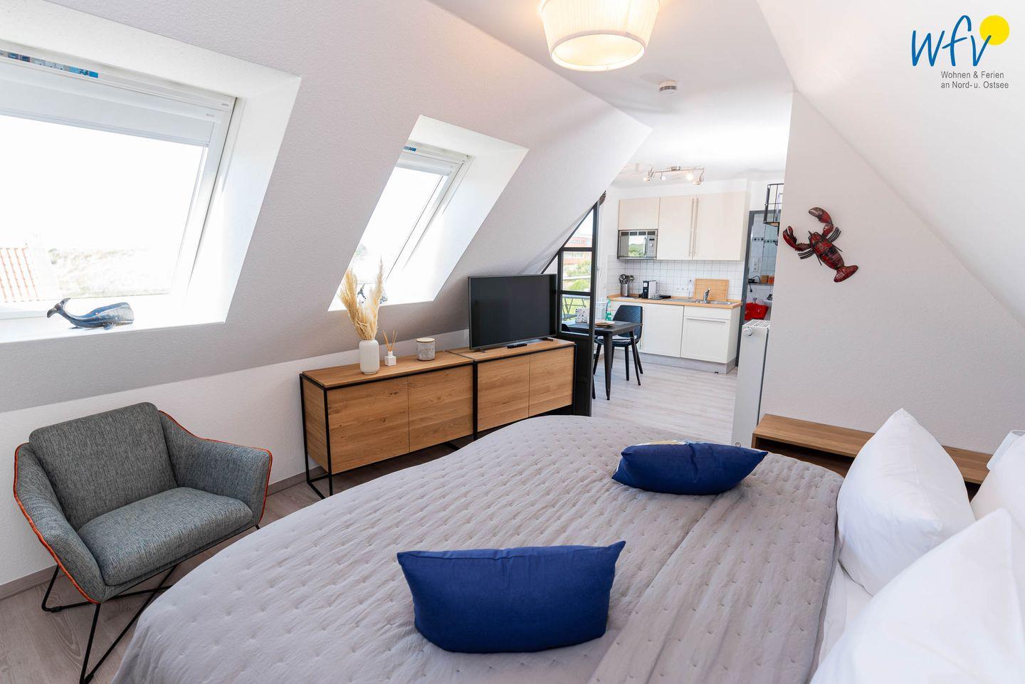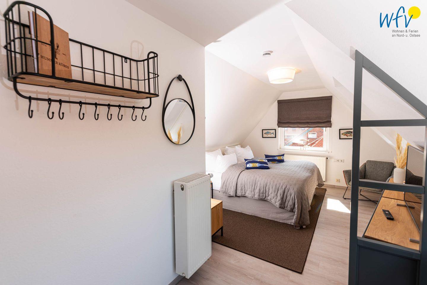 Nach dem Strandtag oder der Fahrradtour lädt ein komfortables Doppelbett sowie ein Relaxsessel und ein TV zu entspannten Stunden ein. Zum Surfen vom Smartphone aus empfangen Sie kostenlos freies WLAN. Eine geräumige Kommode bietet Ihnen Platz für die Urlaubsgarderobe.