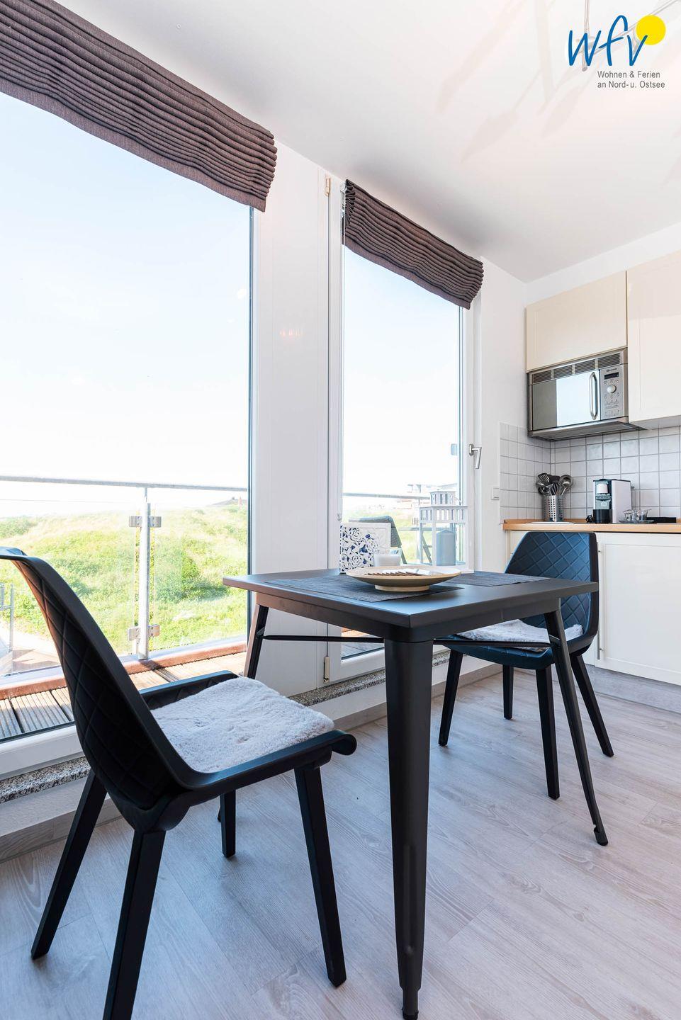 An dem Esstisch am Fenster mit schönem Blick in die Dünen genießen Sie die idyllische Inselatmosphäre. Bei gutem Wetter können Sie sich zum Essen wunderbar ins Freie auf den hübsch möblierten Balkon setzen. Oder Sie lesen hier in Ruhe ein gutes Buch, lassen die Seele baumeln und erholen sich in vollen Zügen - ein herrliches Urlaubsgefühl!