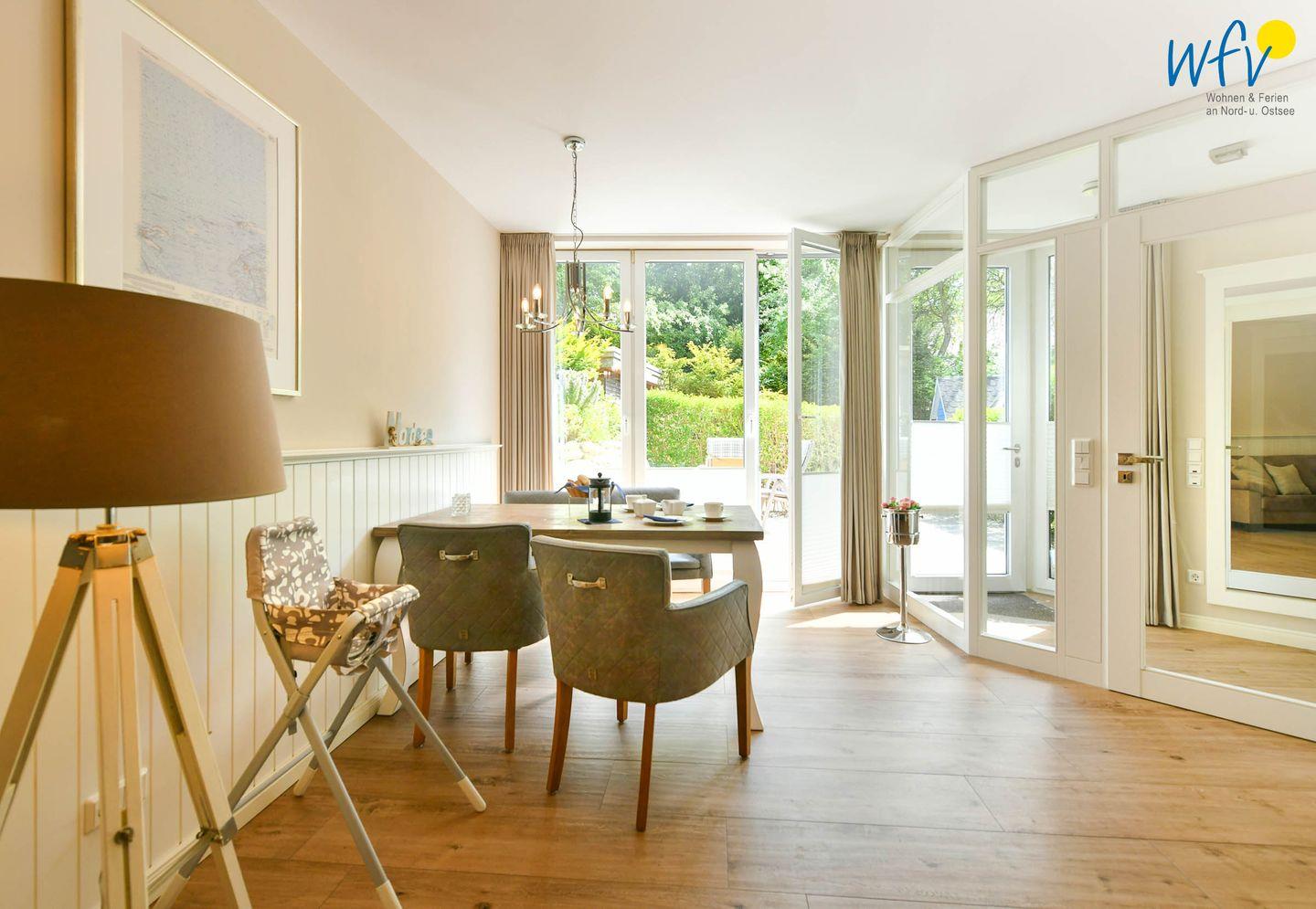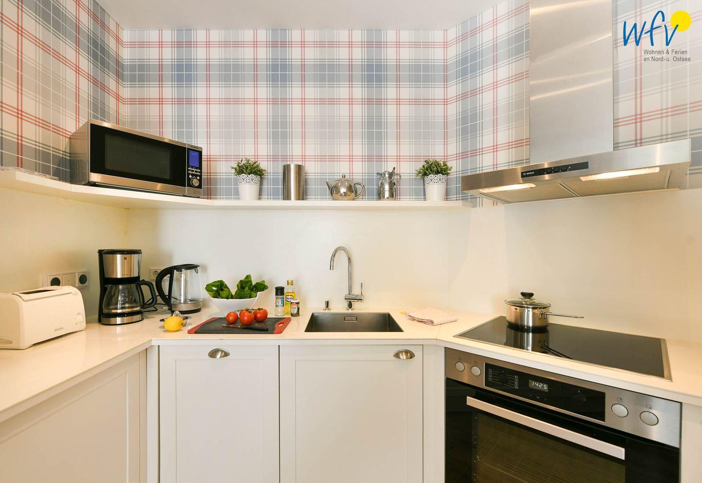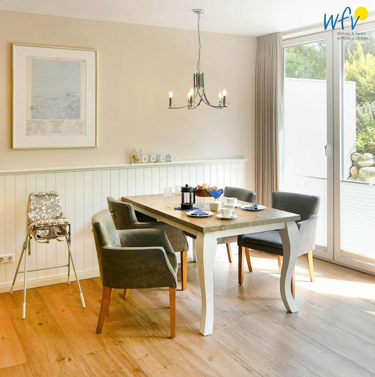 In der modernen Einbauküche finden Sie eine moderne Vollausstattung (u.a. mit Ceranfeld, Backofen, Mikrowelle, Geschirrspüler, Kaffeemaschine und Toaster). Am großzügigen Essplatz mit schönem Blick ins Grüne bekommt man direkt Lust einen neuen ereignisreichen Tag auf Juist zu planen!