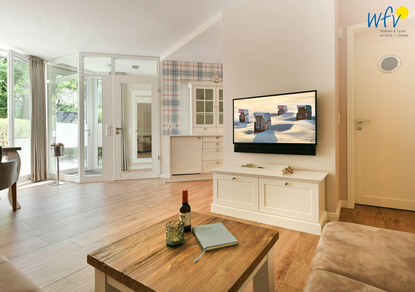 Ein heller Wohnbereich mit integrierter Küche, Essplatz und gemütlicher Sitzecke sowie zwei separate Schlafzimmer, ein modernes Duschbad und eine sonnige Terrasse machen Ihren Urlaub zum Genuss!
