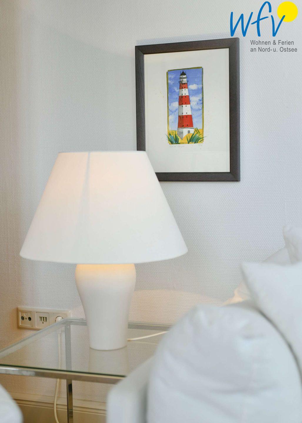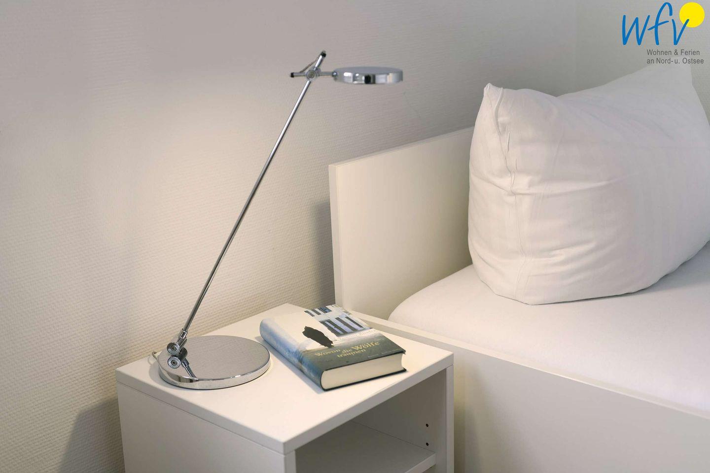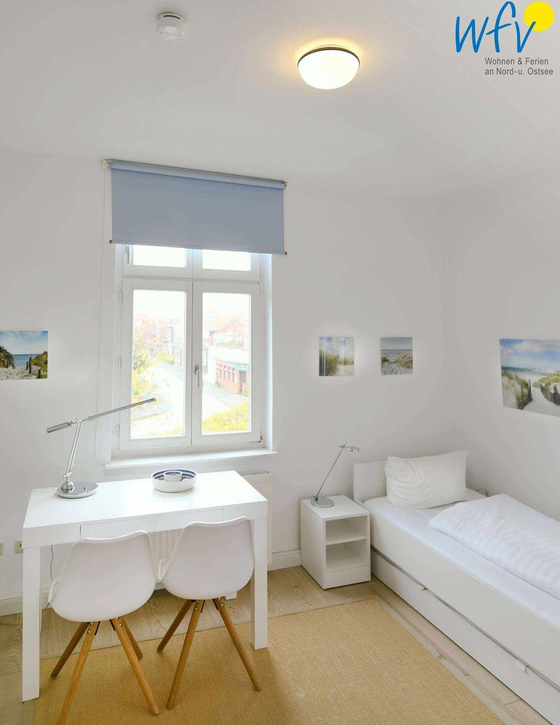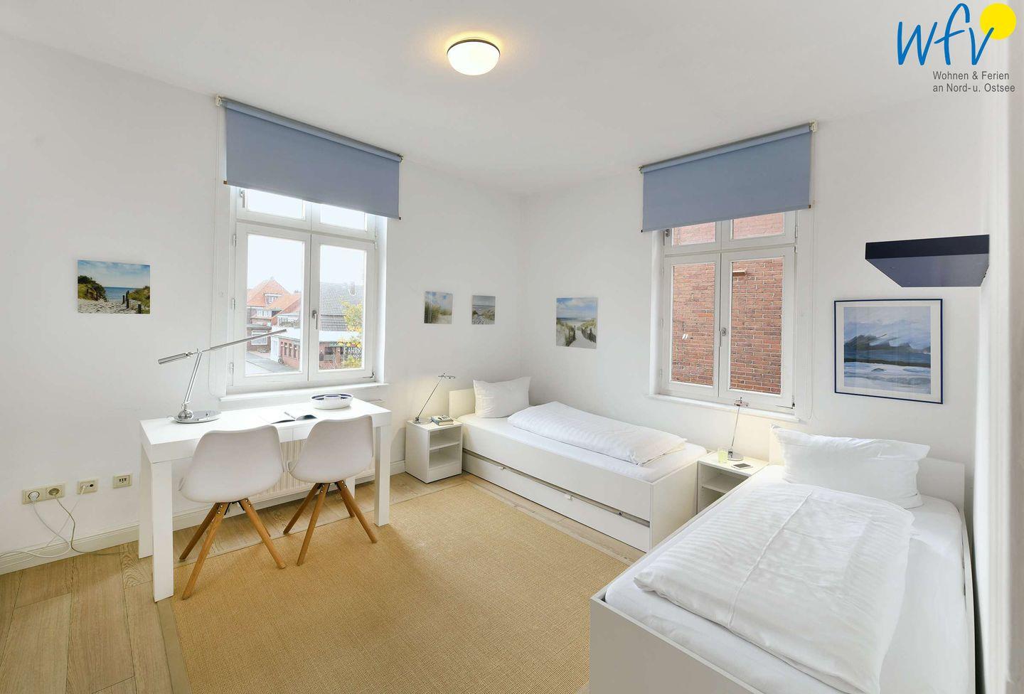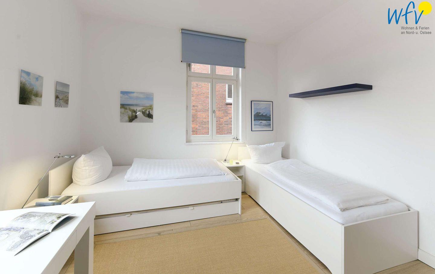 Die zwei separaten Schlafzimmer der Ferienwohnung „Robbenplate“ auf Juist teilen sich in Eltern – und Kinderschlafzimmer auf. Eines der Zimmer ist mit einem Doppelbett eingerichtet, das andere mit zwei Einzelbetten (eines davon zum Doppelbett ausziehbar).