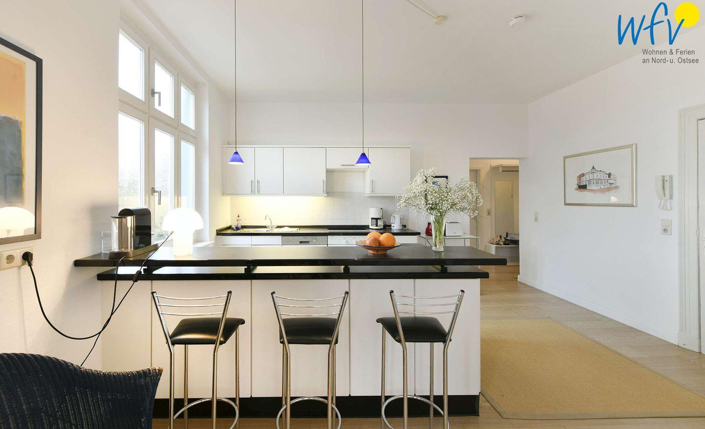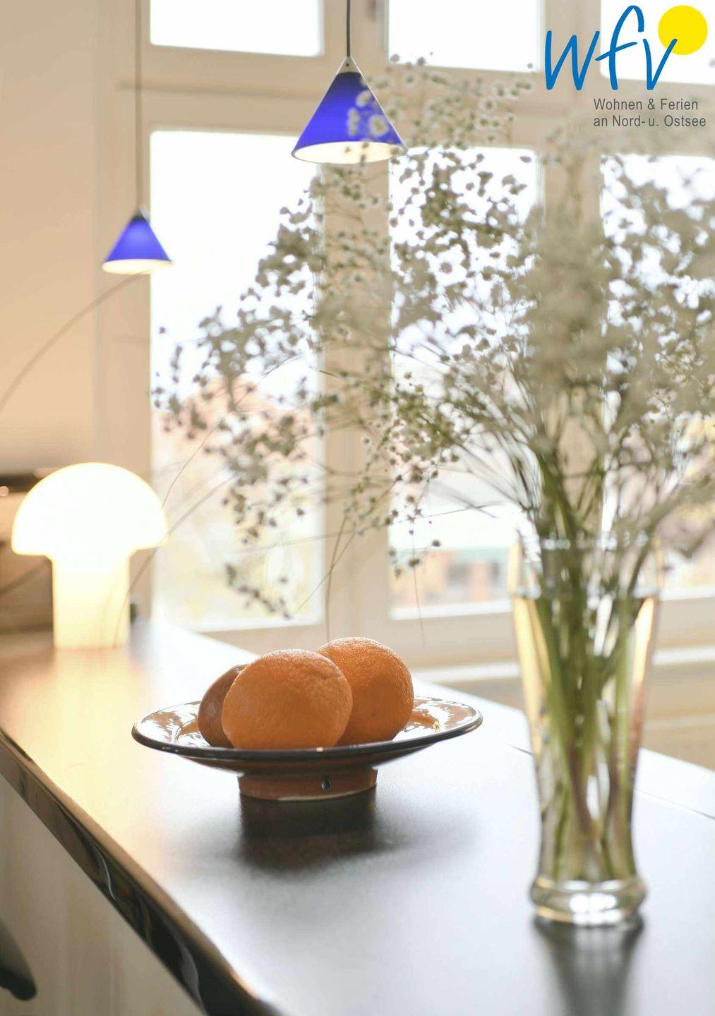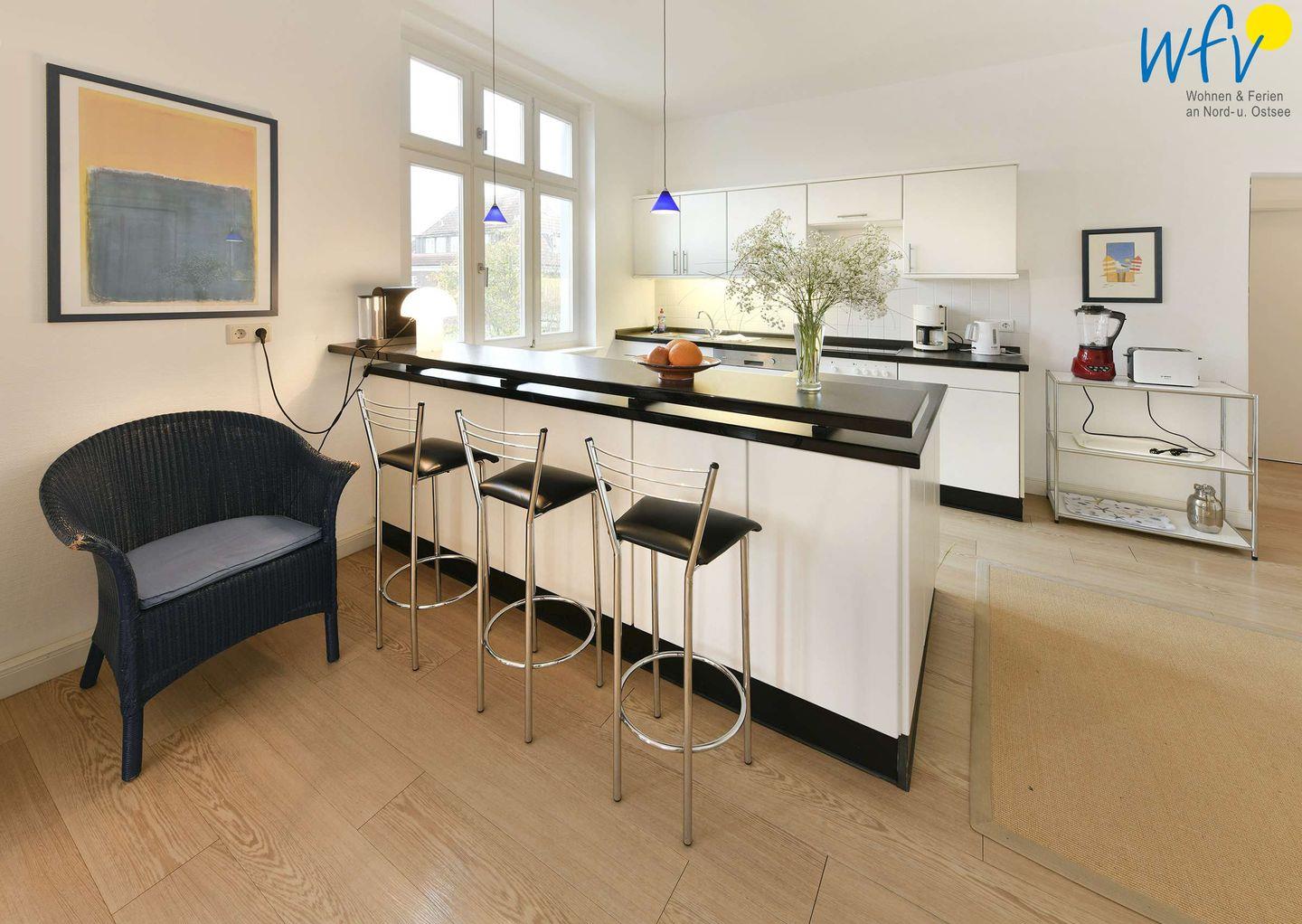 Es empfängt Sie eine modern eingerichtete Wohnküche: Sowohl der Tresentisch, als auch der Essbereich im Turmerker bietet Gelegenheit zum Sitzen. Eine komplette Ausstattung (4-Platten-Ceranfeld, Backofen, Spülmaschine) ermöglicht Ihnen eine bequeme Selbstverpflegung.