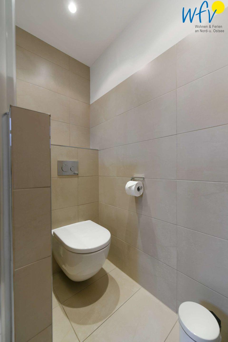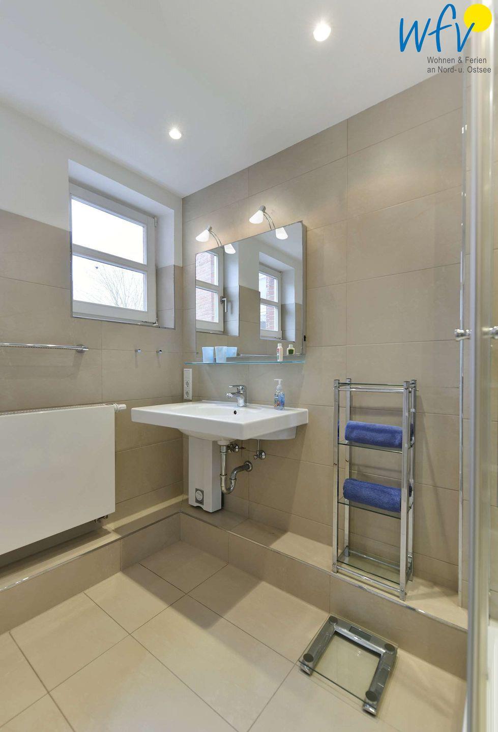 Das stilvoll ausgestattete Badezimmer verfügt über Waschbecken, WC und Dusche. Ein Fön ist vorhanden und muss nicht selbst mitgebracht werden.