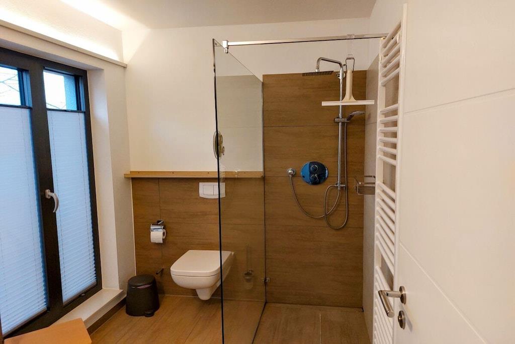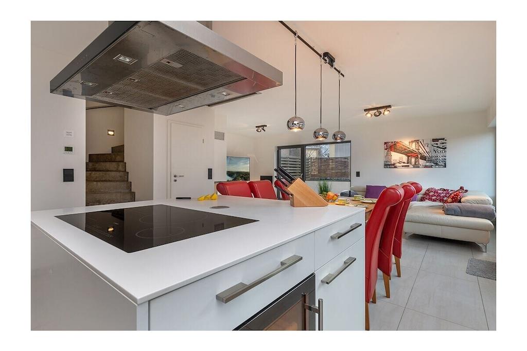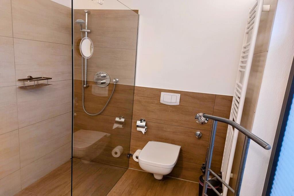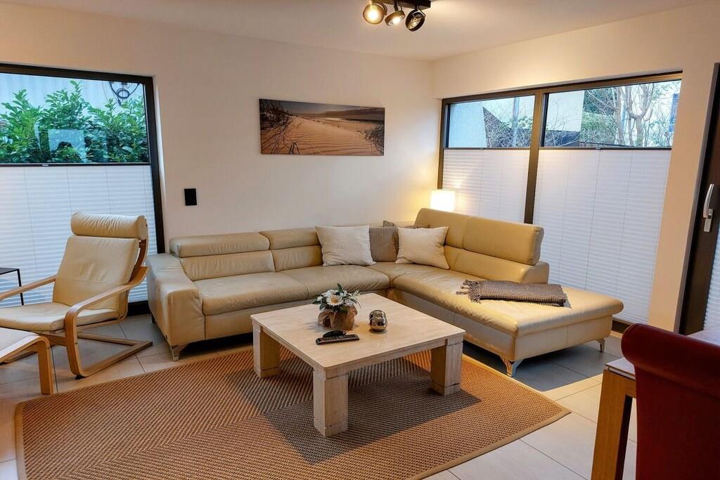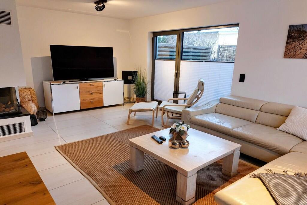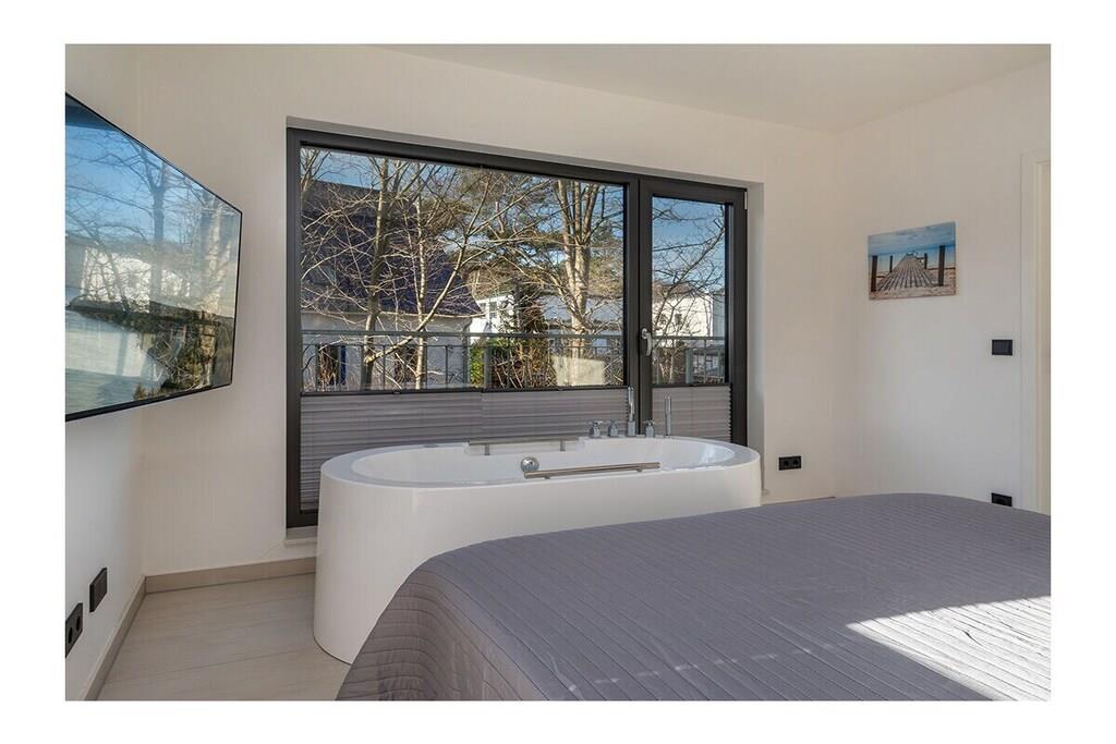 The holiday apartment has three bedrooms. It also features a gas fireplace, a ground-floor terrace, three bathrooms, and more. The apartment is equipped with every imaginable comfort. On the ground floor, there is one bedroom, a spacious living/dining area with an open-plan kitchen, and a small bathroom. Upstairs, there are two bedrooms (each with its own bathroom), one of which is equipped with a sauna and whirlpool. The box-spring bed in the second bedroom (180x200cm) is electrically adjustable and includes two slatted frames, mattresses, and toppers (each 90x200cm).