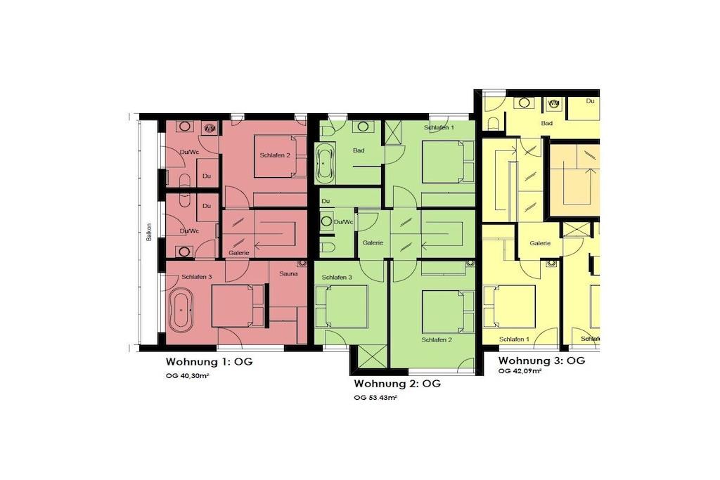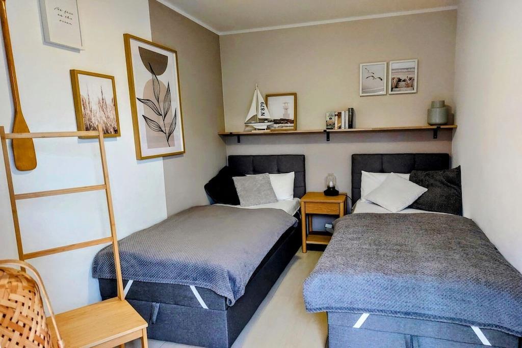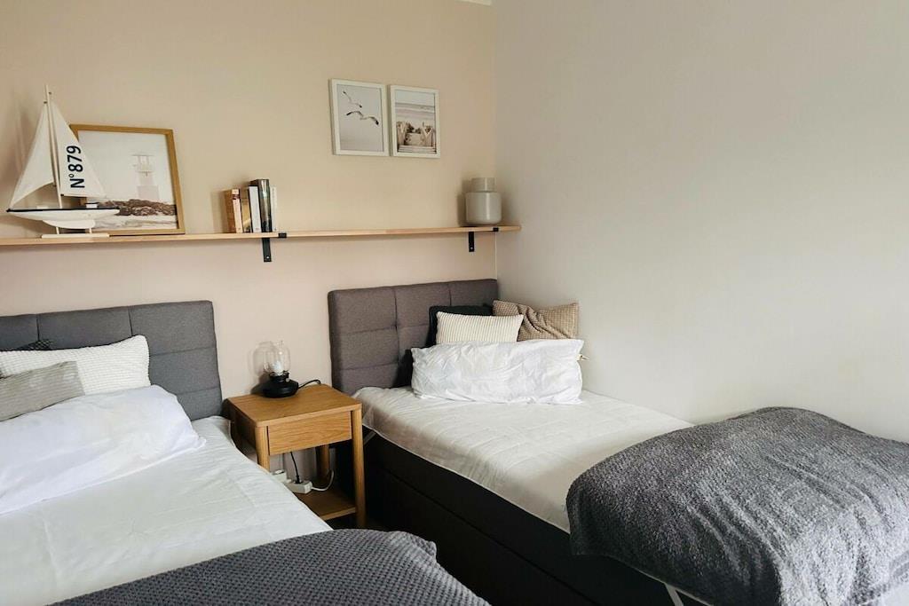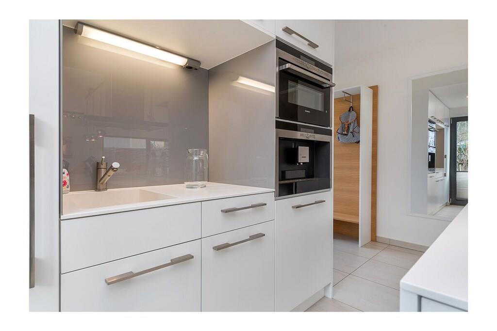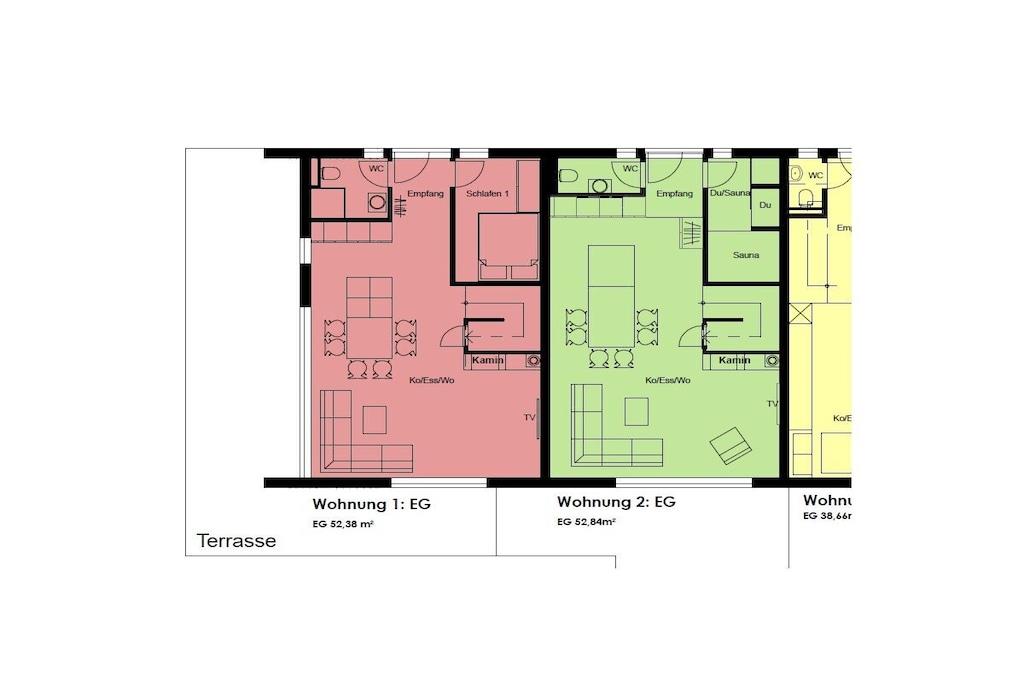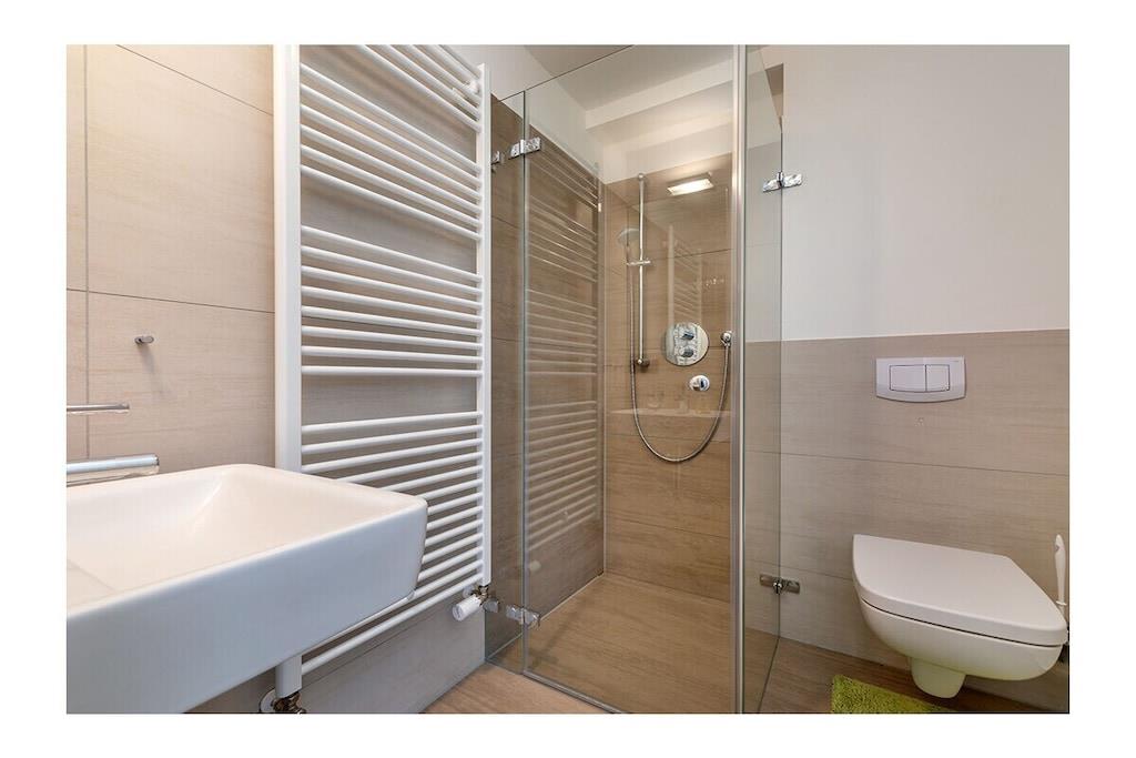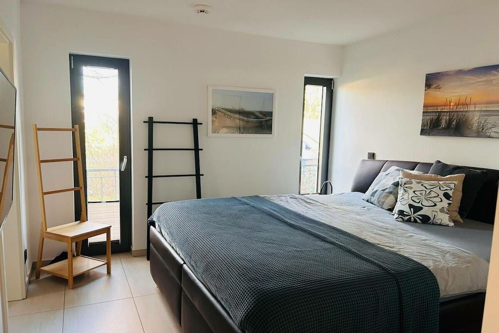 The holiday apartment has three bedrooms. It also features a gas fireplace, a ground-floor terrace, three bathrooms, and more. The apartment is equipped with every imaginable comfort. On the ground floor, there is one bedroom, a spacious living/dining area with an open-plan kitchen, and a small bathroom. Upstairs, there are two bedrooms (each with its own bathroom), one of which is equipped with a sauna and whirlpool. The box-spring bed in the second bedroom (180x200cm) is electrically adjustable and includes two slatted frames, mattresses, and toppers (each 90x200cm).