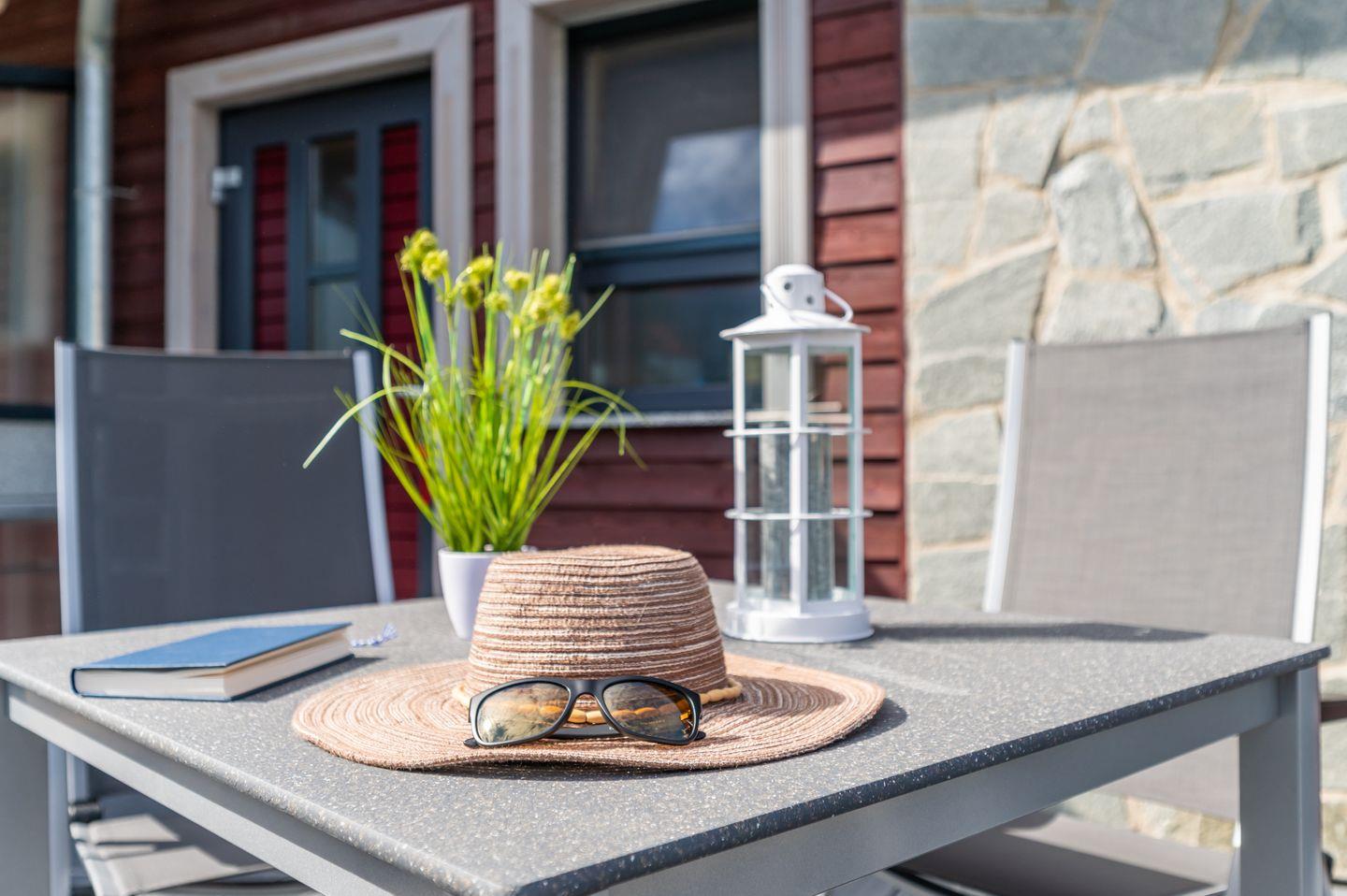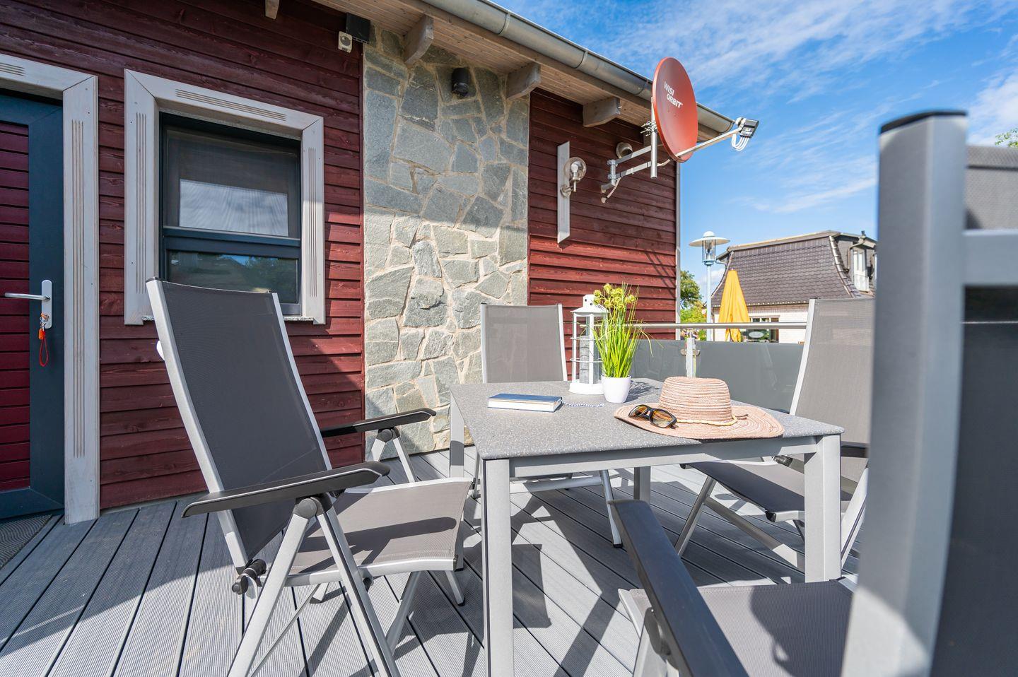 Auf der möblierten Südterrasse erleben Sie das beruhigende Meeresrauschen und können entspannte Stunden im Freien genießen. Die großzügige Liegewiese lädt zum Sonnenbaden ein, während ein eigener PKW-Stellplatz auf dem Grundstück für zusätzlichen Komfort sorgt.
