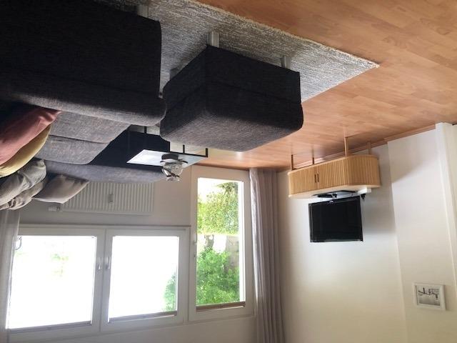 Das Wohnzimmer ist lichtdurchflutet, mit einem Sofa und einem Flachbildfernseher (internetfähig inkl. Radio) ausgestattet. Der Essplatz verbindet das Wohnzimmer mit der offenen Küchenzeile mit Herd, Backofen und Geschirrspülmaschine. Zur weiteren Ausstattung gehören u.a. eine Kaffeemaschine, Espressomaschine (Nespresso Kaffeekapseln), Wasserkocher, Toaster und ein Milchaufschäumer. Fenster sind mit Insektenschutzgittern ausgestattet.