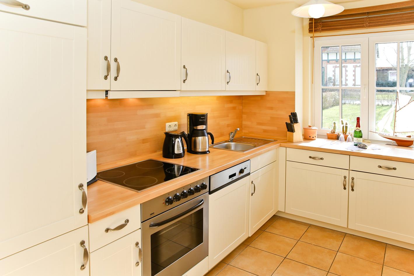 Die voll ausgestattete Küche mit Geschirrspüler, Mikrowelle u. Backofen befindet sich mit dem großzügigen Wohnraum mit Farb-TV u. DVD-Player im Erdgeschoss.