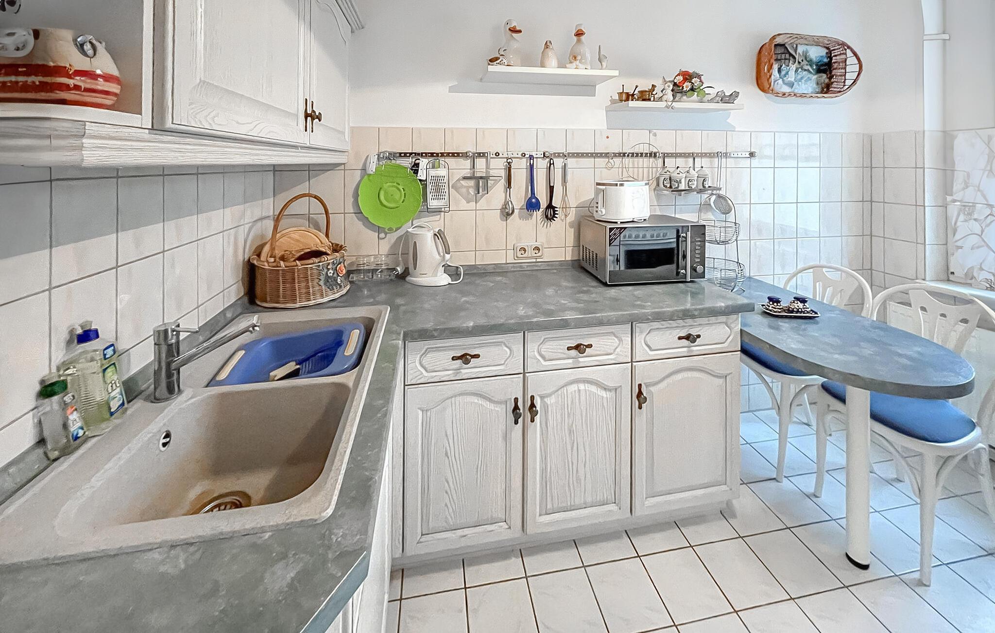 Die Ferienwohnung befindet sich in einem separaten Ferienwohnung in Reihenhausstil, zusammen mit einer weiteren Ferienwohnung auf dem umzäunten Wohngrundstück des Eigentümers in ruhiger Ortslage von Kölpinsee. Bis zum Ostseestrand sind es etwa 500 Meter, bis zur nächsten Gaststätte, einem Bäcker und einem Supermarkt sind es ebenfalls nur wenige hundert Meter.Die Ferienwohnung liegt im Obergeschoss des Hauses (Zugang über Treppe), hat einen separaten Eingang und ist etwa 90 Quadratmeter groß. Sie bietet Platz für bis zu 3 Personen und ist ausgestattet mit einem Wohnzimmer mit Polstermöbel (Schlafcouch), Flachbild-TV, Radio mit CD-Player, einem separaten Esszimmer mit Sitzgruppe sowie mit einer separaten Küche mit E-Herd und Backofen, Kühl- Gefrierkombination, Mikrowelle, kleiner Essecke und div. Küchenkleingeräten. Weiterhin verfügt die Ferienwohnung über ein Schlafzimmer mit Doppelbett und 1 Liege und einem Badezimmer mit Wanne und Fön. Das WC befindet sich vom Badezimmer räumlich getrennt in einem separaten Bad. Die Wohnung ist teilweise mit Insektenschutz vor den Fenstern und einer Zentralheizung ausgestattet. Das Rauchen ist ausschließlich im Freien erlaubt.Außerdem zur Nutzung zur Verfügung stehen: WLAN (nur auf Anfrage; 3 EUR/Tag), möblierte Terrasse vor der Wohnung mit Grill, Unterstellmöglichkeit für Fahrräder, Parkplatz.Im Gesamtpreis enthalten sind: Bettwäsche, Wasser- und Energieverbrauch. Handtücher sind mitzubringen. Die Unterkunft ist für Kleinkinder nicht geeignet.