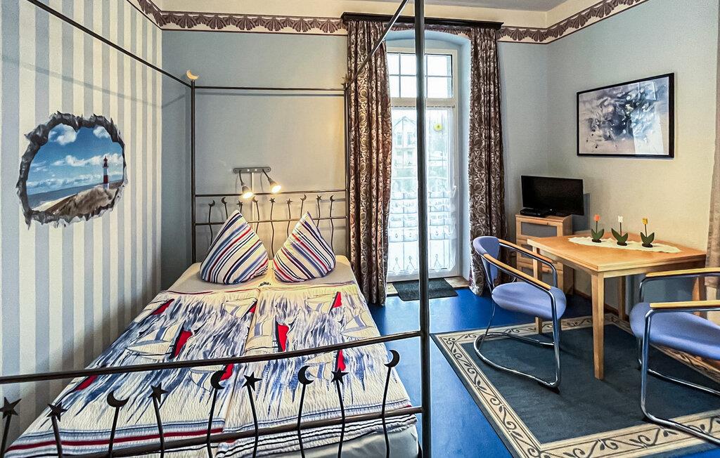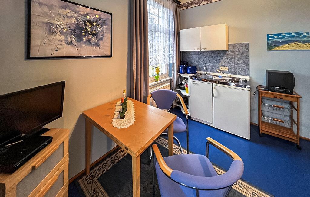 Die kleine Einraum-Wohnung für 2 Personen befindet sich im Obergeschoss und verfügt über einen möblierten Balkon. Sie ist ausgestattet mit einem kombinierten Wohn-/Schlafraum mit offener Küchenzeile (Doppelbett, Sitz- und Essecke, Flachbild-TV, E-Kochfeld, Kühlschrank mit Tiefkühlteil, Mikrowelle, div. Küchengeräte), sowie einem Bad mit DU/WC.