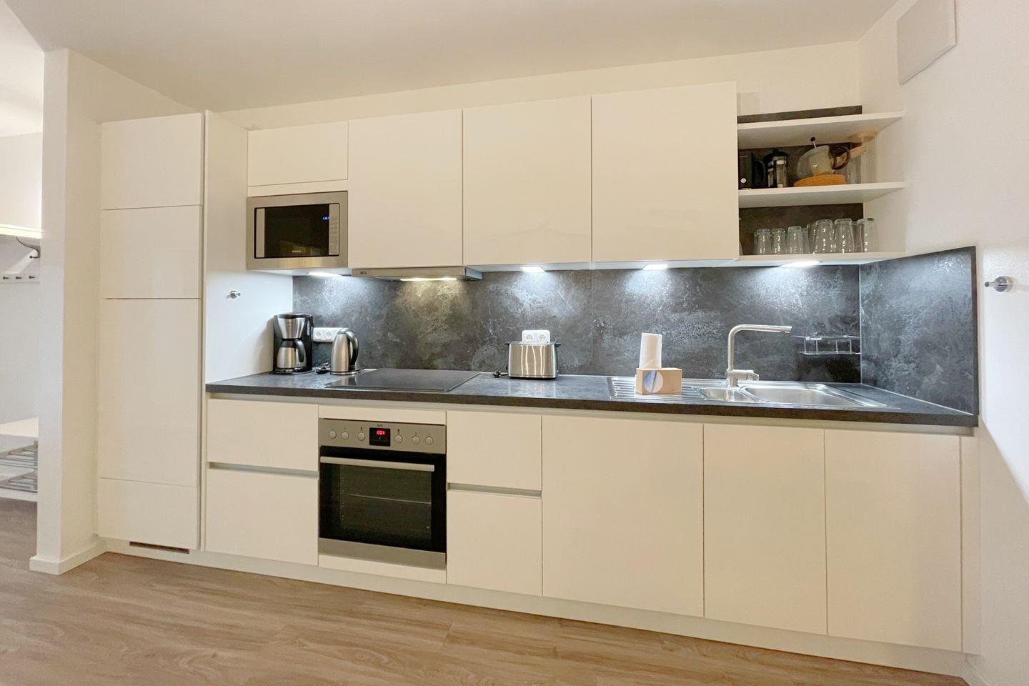 Das helle und freundliche Interieur des Hauses schafft sofort eine einladende Atmosphäre. Mit zwei komfortablen Schlafzimmern ausgestattet, in denen Sie nach einem erlebnisreichen Tag entspannen können, findet jeder einen Rückzugsort. Das offene Wohnkonzept verbindet den Wohnbereich mit der modernen Küche, welche mit hochwertigen Geräten, darunter ein Ceran-Herd, ein Backofen, eine Spülmaschine und ein Kühlschrank mit Gefrierfach, ausgestattet ist. Hier können Sie gemeinsam kochen und besondere Momente am Esstisch verbringen. Der gemütliche Sofabereich mit großem Fernseher sorgt für Unterhaltung und entspanntes Beisammensein.