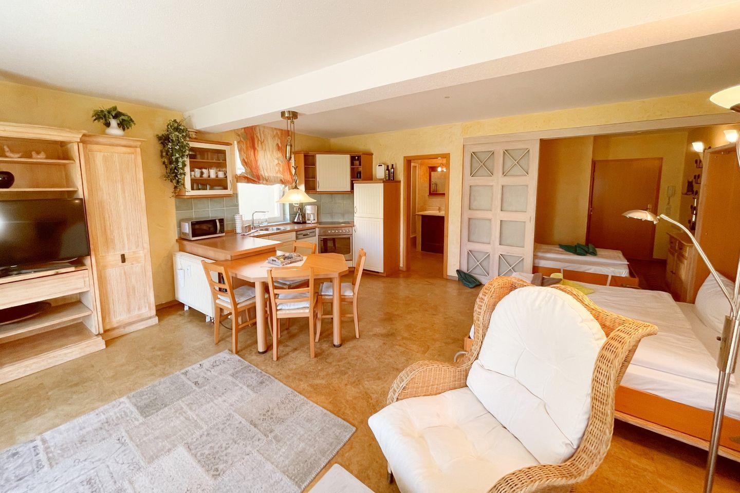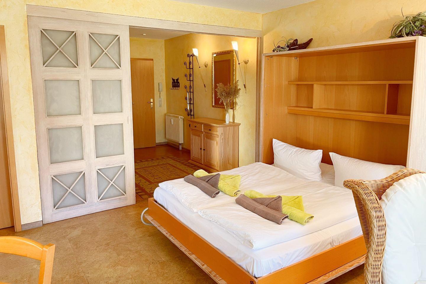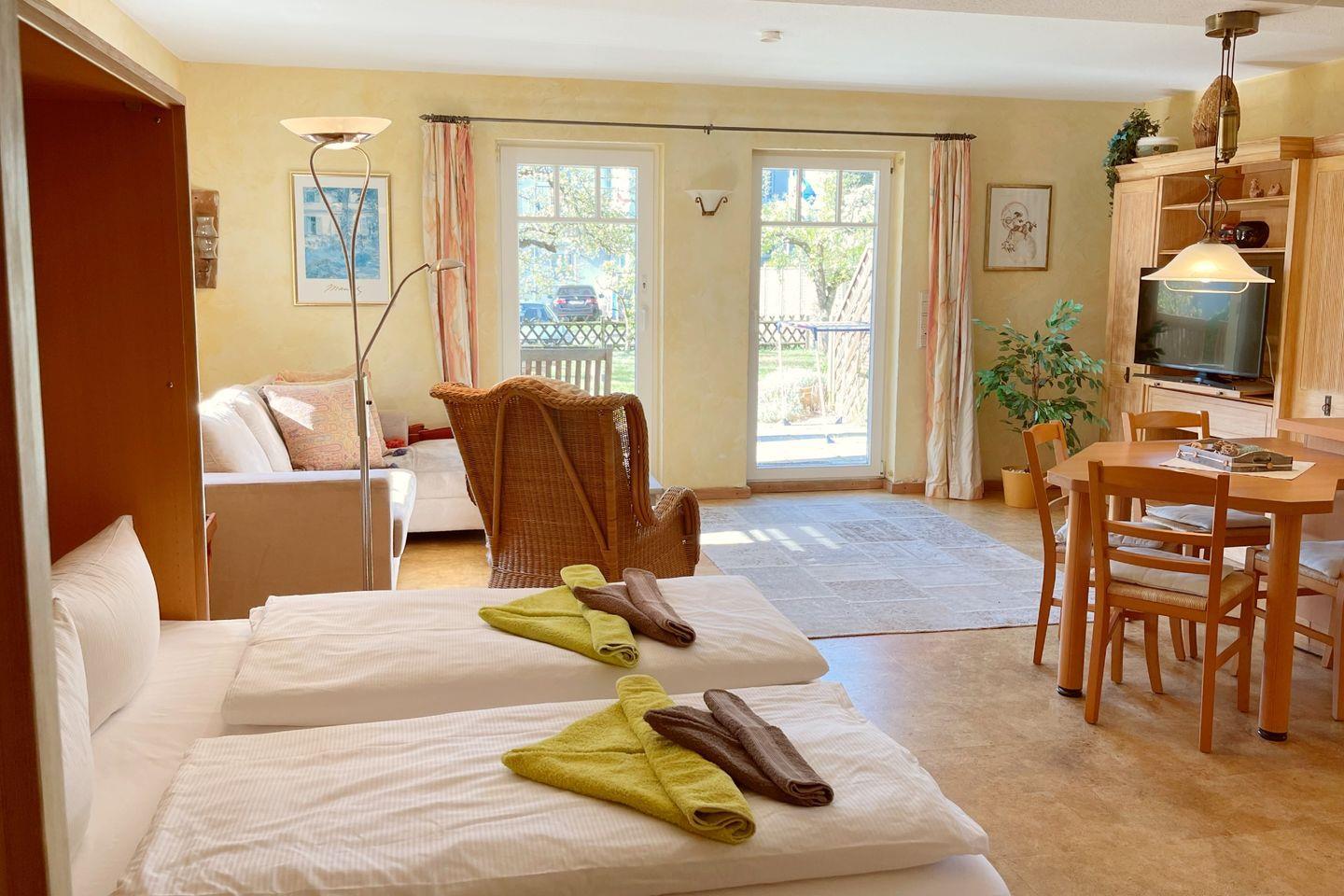Das 1,5-Zimmer-Apartment im Erdgeschoss begrüßt Sie mit einer Sonnenterrasse in Südlage. Sehr ruhig und nur wenige Gehminuten von der Ostsee entfernt. Das Wohnzimmer mit offener Küche, Essecke, bequemer Couch und einem Schrankbett, bildet das Herzstück dieses Apartments. Im Vorraum befindet sich ein weiteres Schrankbett, für die 3te Person, das mittels Schiebetür, vom Wohnzimmer, getrennt werden kann. In dem modernen Duschbad befindet sich neben dem WC ein doppelter Waschtisch mit Spiegel.
