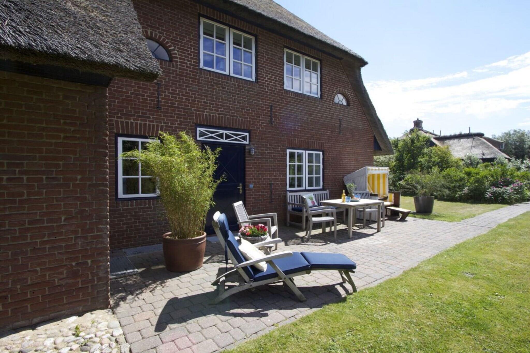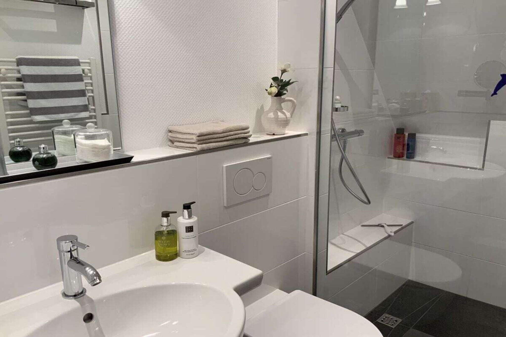 Our holiday apartment, House 1C, is suitable for 4 people. On the ground floor, there is a large living-dining area (approx. 42 sqm) with a fully equipped kitchen (convection oven, dishwasher, microwave, Nespresso, etc.), a smart TV, a hi-fi system, and Wi-Fi. A comfortable wooden staircase leads to the upper floor, where there is a double bedroom (smart TV), a bedroom with single beds, and a modern shower room with toilet (underfloor heating). The basement has another shower room with toilet, a washing machine, and a dryer. Our house is surrounded by a spacious garden, where all units have their own terrace with a beach chair, table, chairs, and loungers.