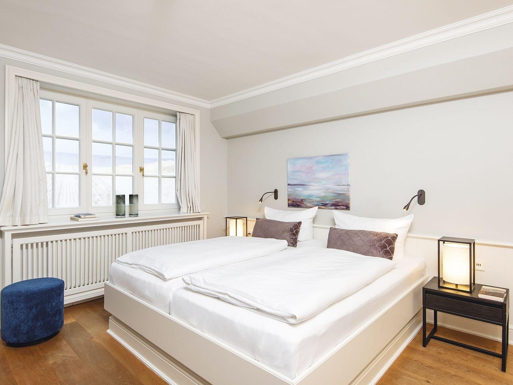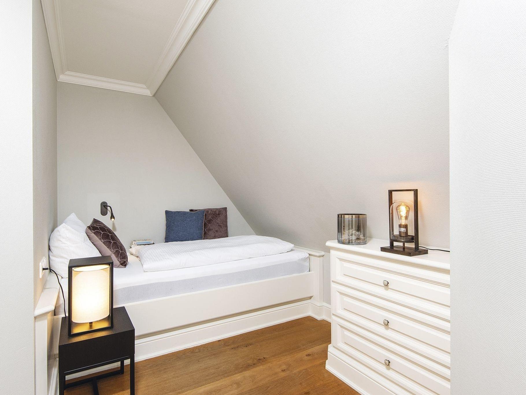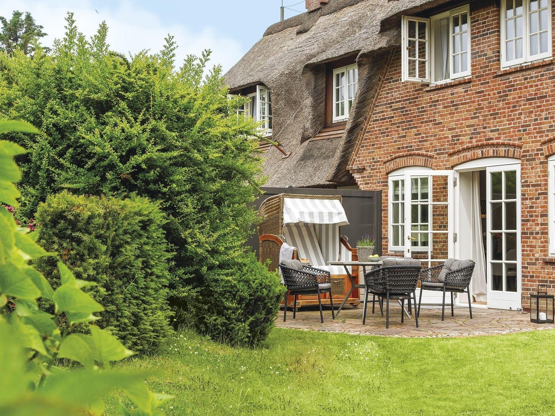 Ein elegant gemütliches Hausteil mit Platz für bis zu Fünf auf drei Etagen. Durch den kleinen Flur erreicht man direkt den stilvoll mit kleinen Farbakzenten eingerichteten Wohn-/Essbereich mit gemütlichen Polstermöbeln, Kamin, großen Fensterfronten nach Süden und Osten und einem Esstisch für gemütliche Runden, nebst voll ausgestatteter separater Küche. Von hier haben Sie auch Zugang zum hübsch eingewachsenen Garten mit Terrasse und Strandkorb nach Südosten. Im hellen Untergeschoss gibt es ein gemütliches Doppelschlafzimmer mit großem Einbauschrank und gleich nebenan ein großzügiges Bad mit Eckbadewanne. Das Obergeschoss hält ein Einzelschlafzimmer und ein Doppelschlafzimmer mit geräumigen Einbauschränken, sowie ein modernes Duschbad bereit. Das familientaugliche Quartier ist mit Terracotta- und Echtholzfußböden ausgelegt.