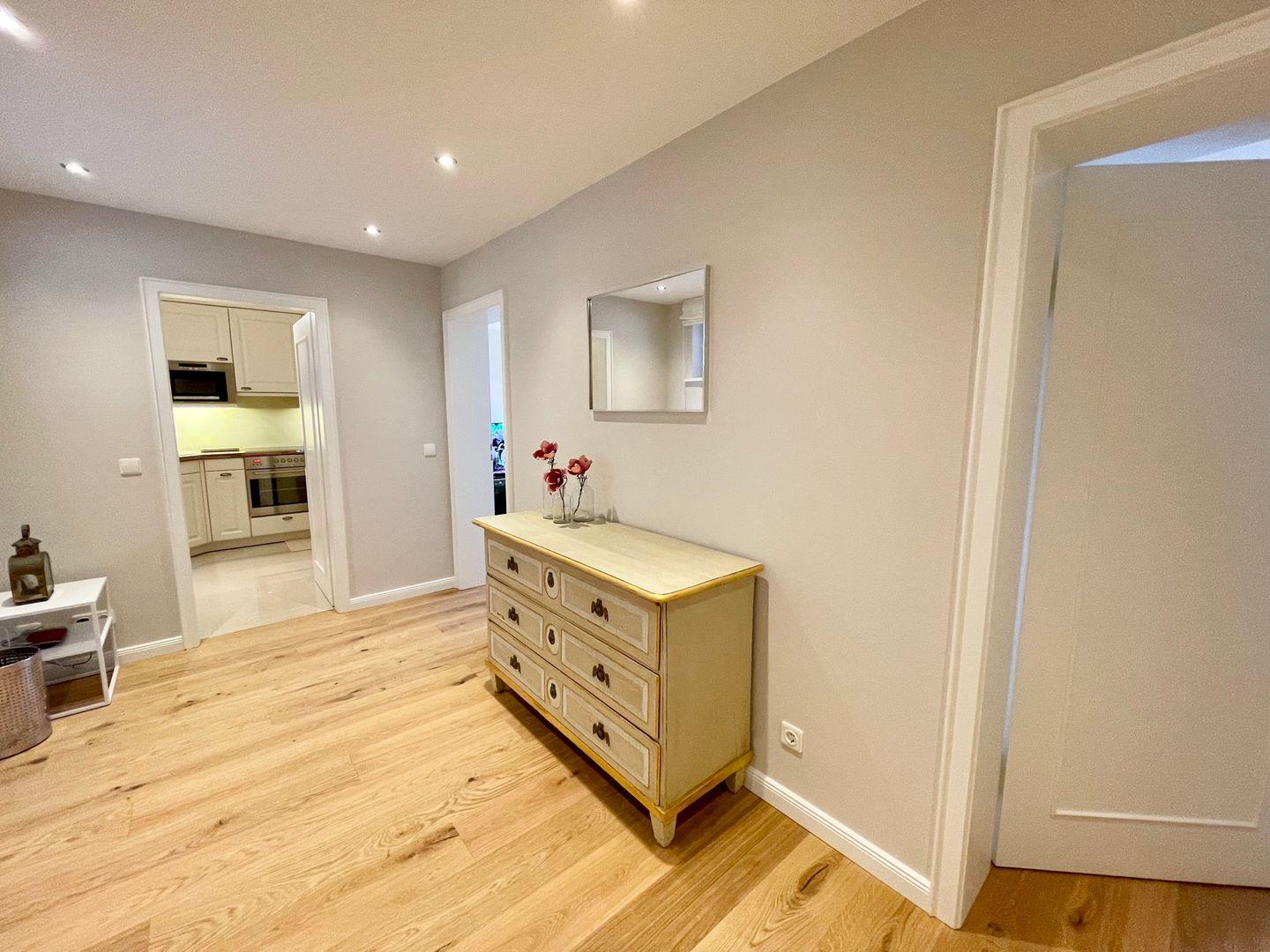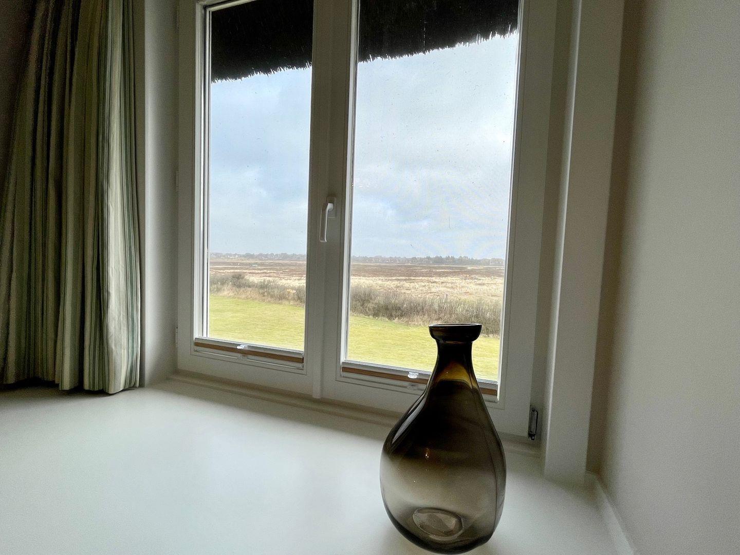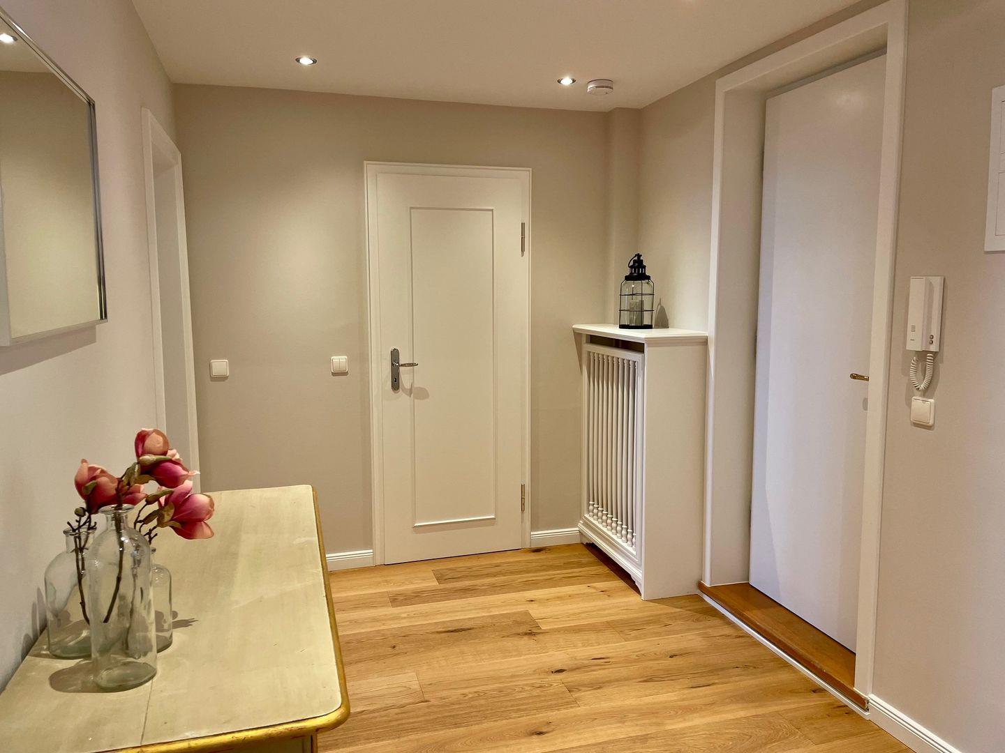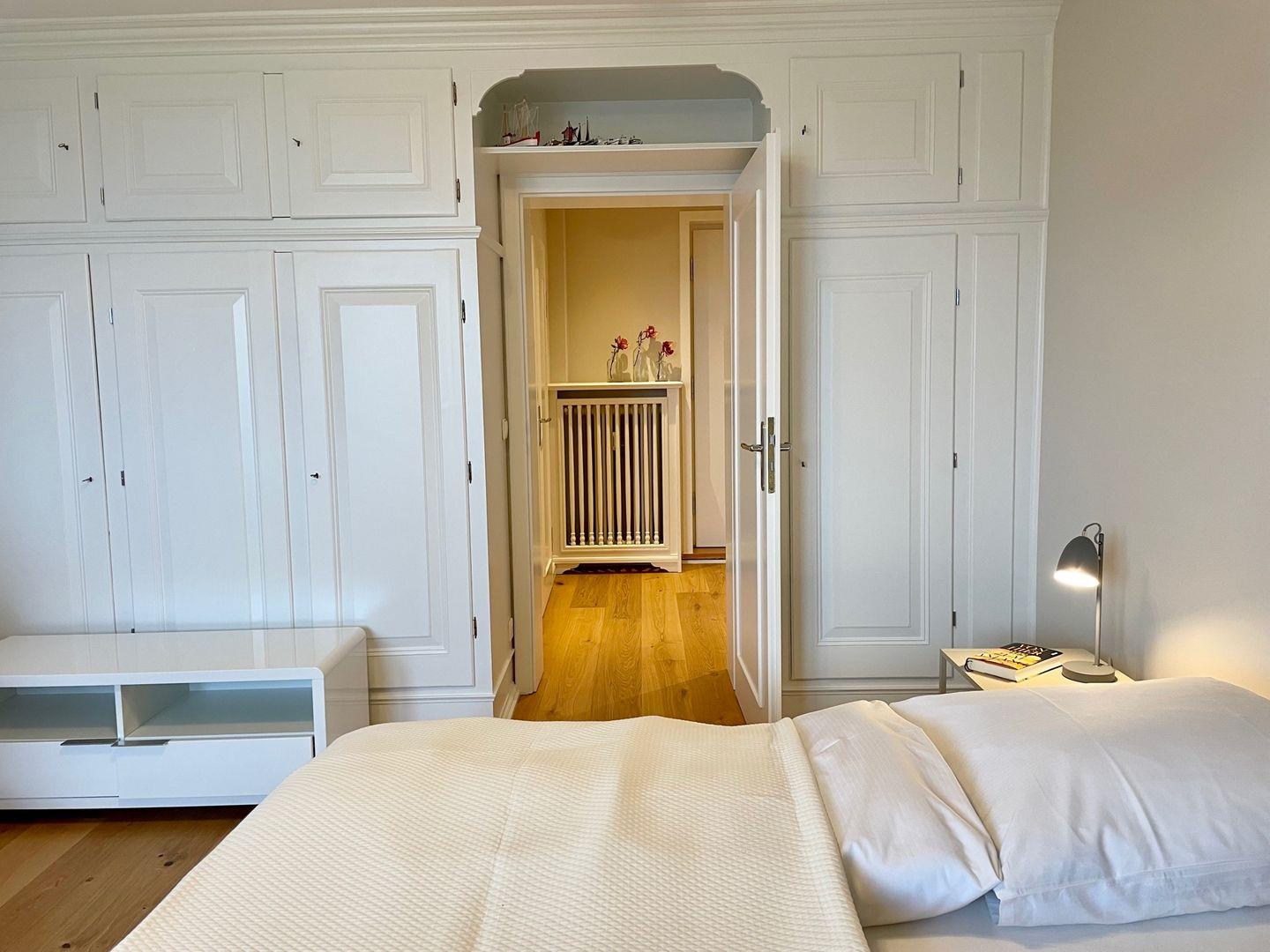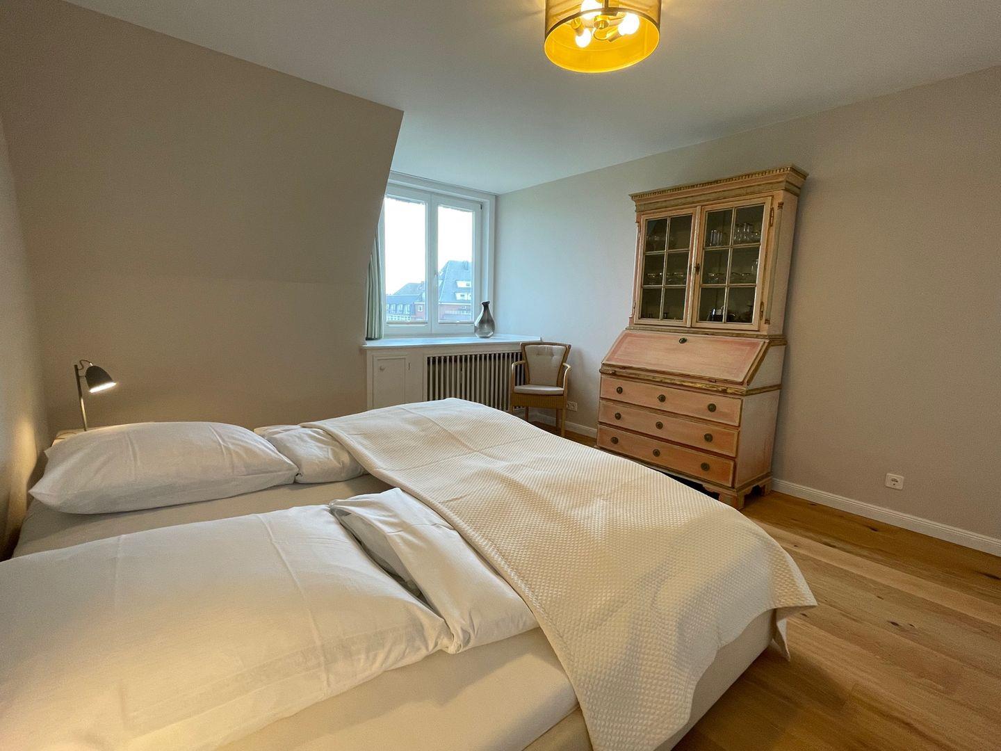 Vom geräumigen Flur aus gelangen Sie in das Wohnzimmer sowie auch ins Schlafzimmer. Das Schlafzimmer, bietet Ihnen ein großes Doppelbett und ein geräumigen Kleiderschrank. Wenn Sie hier aus dem Fenster schauen, sehen Sie die schöne Landschaft Kampens.