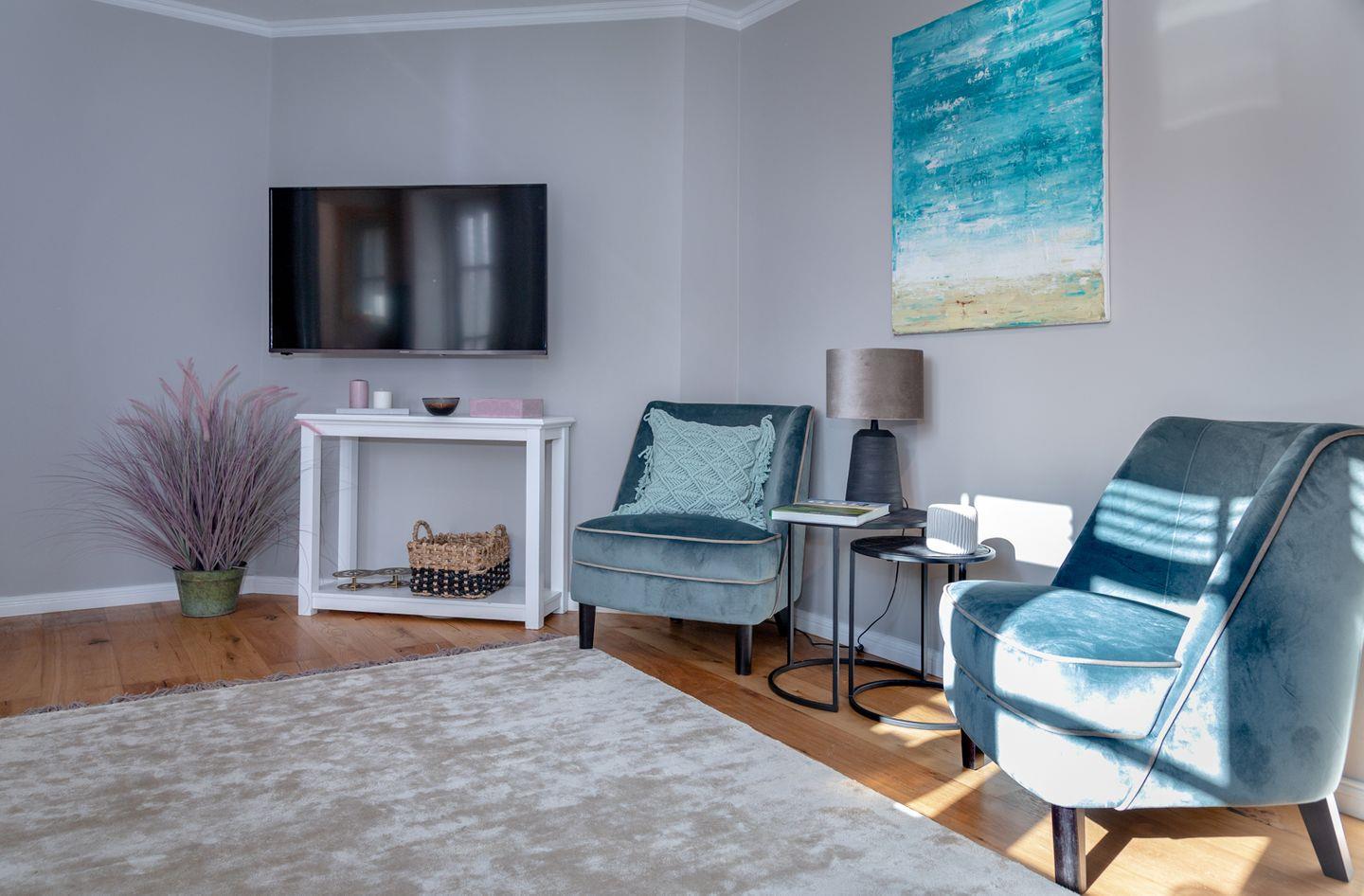 Aus der Diele mit Garderobe heraus werden Sie vom großzügigen und lichtdurchfluteten Wohnbereich empfangen. Das Sofa und die Sessel laden zum Lesen, Entspannen und Verweilen ein. Von der Diele gelangen Sie in das Badezimmer mit Doppelwaschtisch, Dusche und WC sowie in die vollausgestattete Küche mit Cerankochfeld, Toaster, Kaffeefiltermaschine sowie Nespresso-Maschine, Koch- und Tischset.