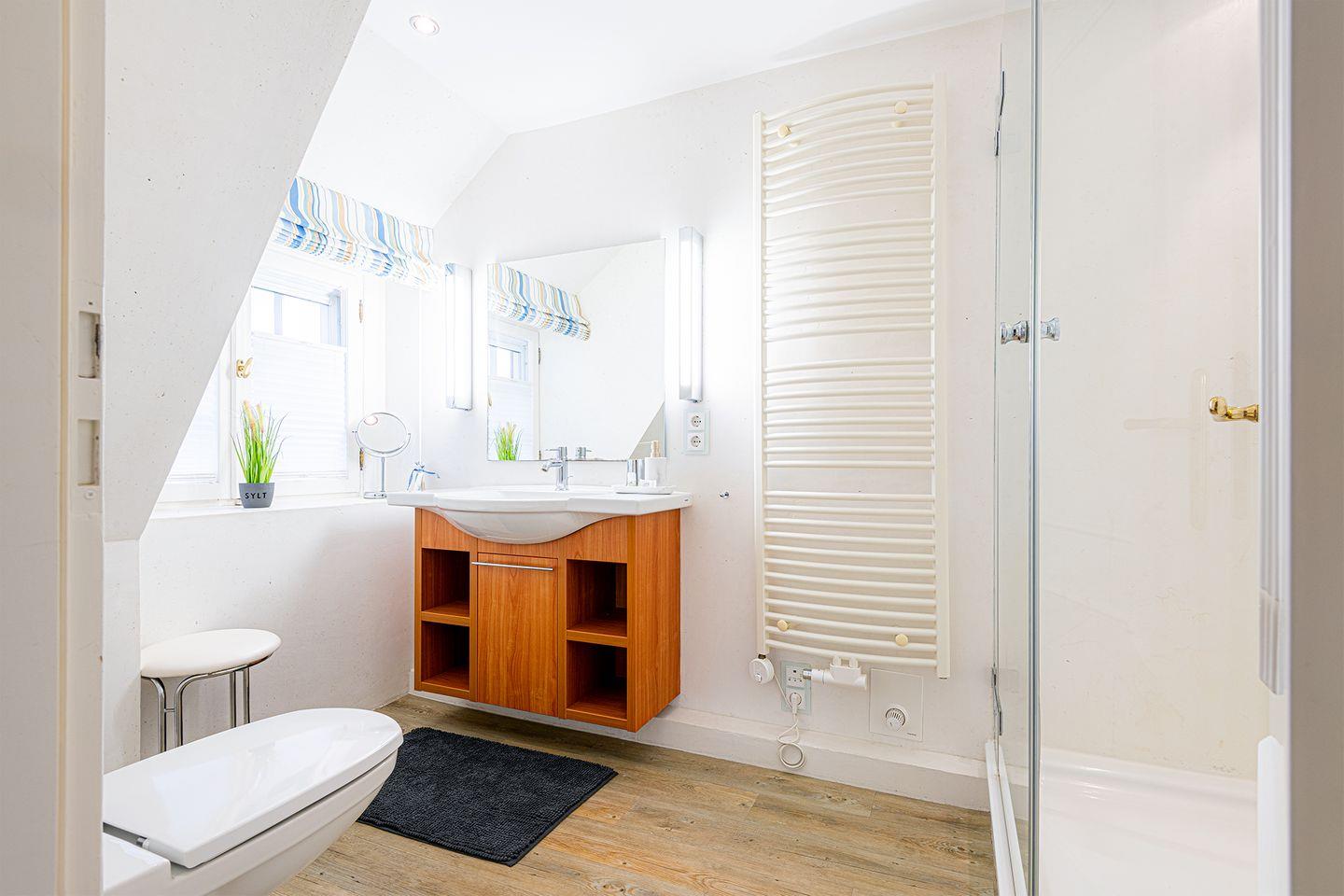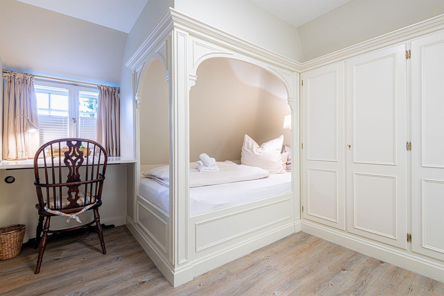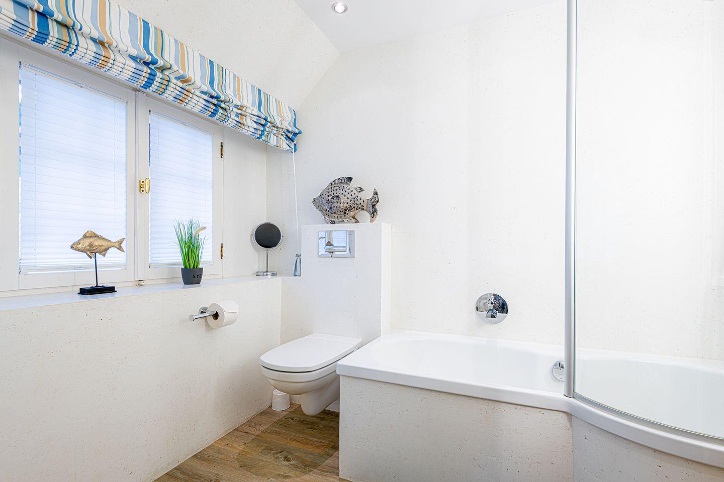 Das Obergeschoss bietet ein großzügiges Schlafzimmer mit einem komfortablen Doppelbett in der Größe 1,80 x 2,00 Meter sowie ein modernes Bad En-Suite. Ein weiteres Schlafzimmer ist im typisch friesischen Stil mit einem Kojen-Bett in der Größe 1,40 x 2,00 Meter gestaltet und verfügt ebenfalls über ein Bad En-Suite. Die geschmackvolle Einrichtung und die ruhige Lage der Schlafräume garantieren erholsame Nächte und einen entspannten Start in den Tag.
