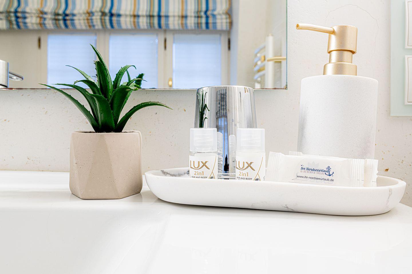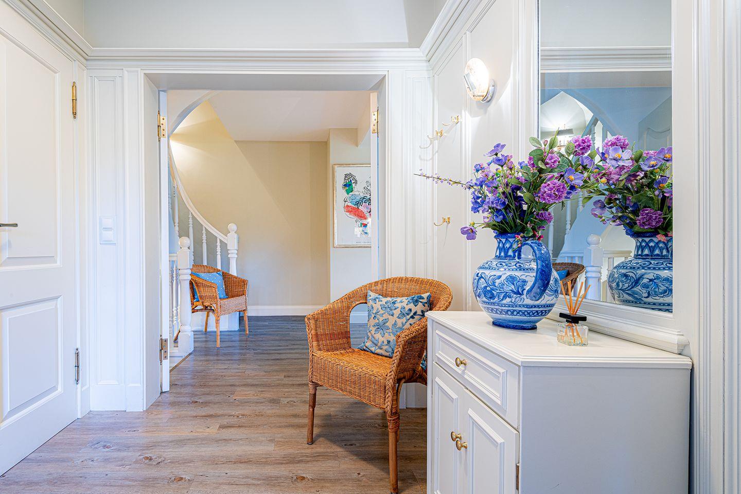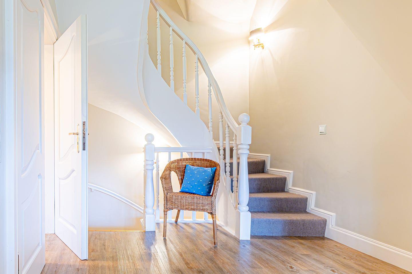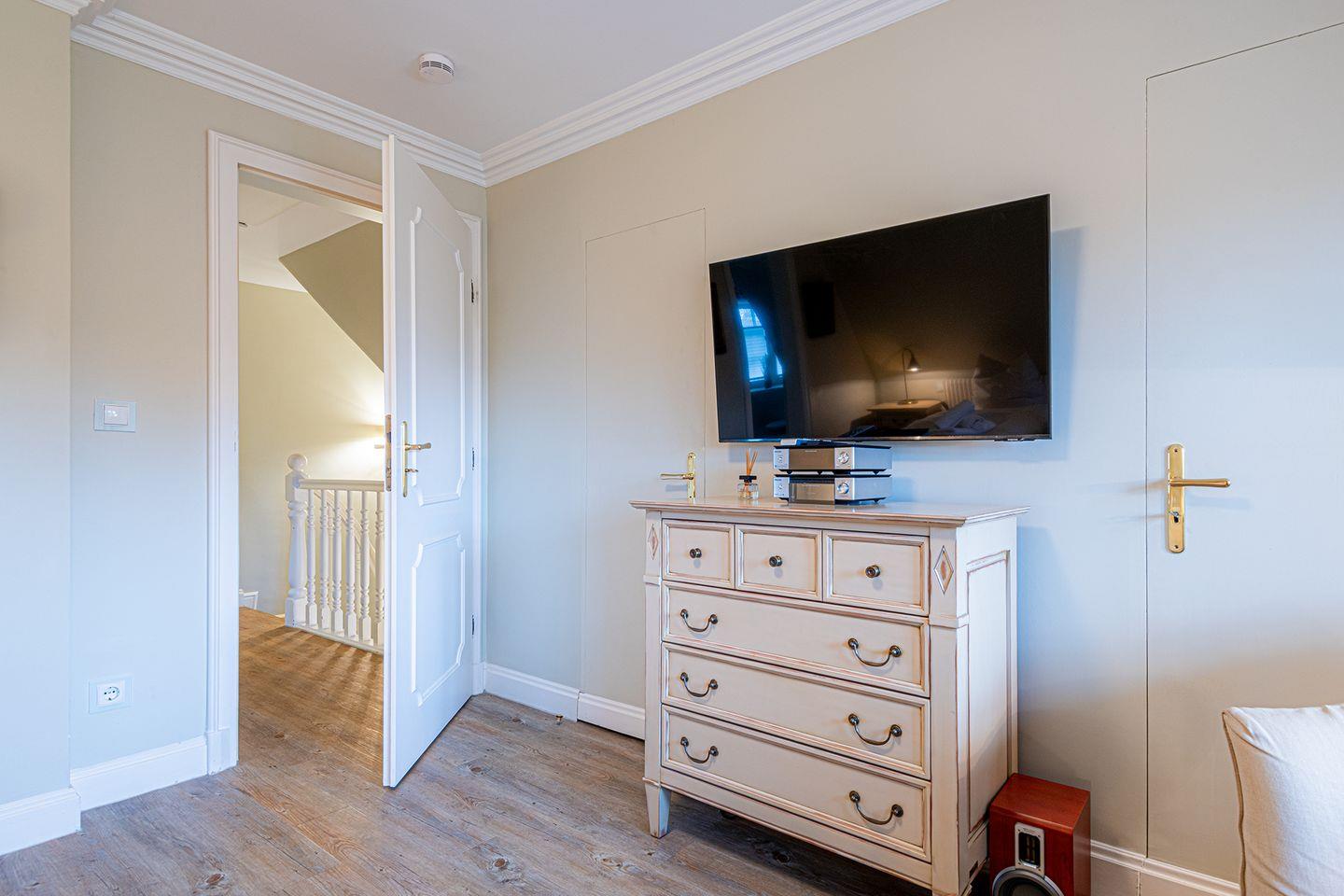 Das Obergeschoss bietet ein großzügiges Schlafzimmer mit einem komfortablen Doppelbett in der Größe 1,80 x 2,00 Meter sowie ein modernes Bad En-Suite. Ein weiteres Schlafzimmer ist im typisch friesischen Stil mit einem Kojen-Bett in der Größe 1,40 x 2,00 Meter gestaltet und verfügt ebenfalls über ein Bad En-Suite. Die geschmackvolle Einrichtung und die ruhige Lage der Schlafräume garantieren erholsame Nächte und einen entspannten Start in den Tag.