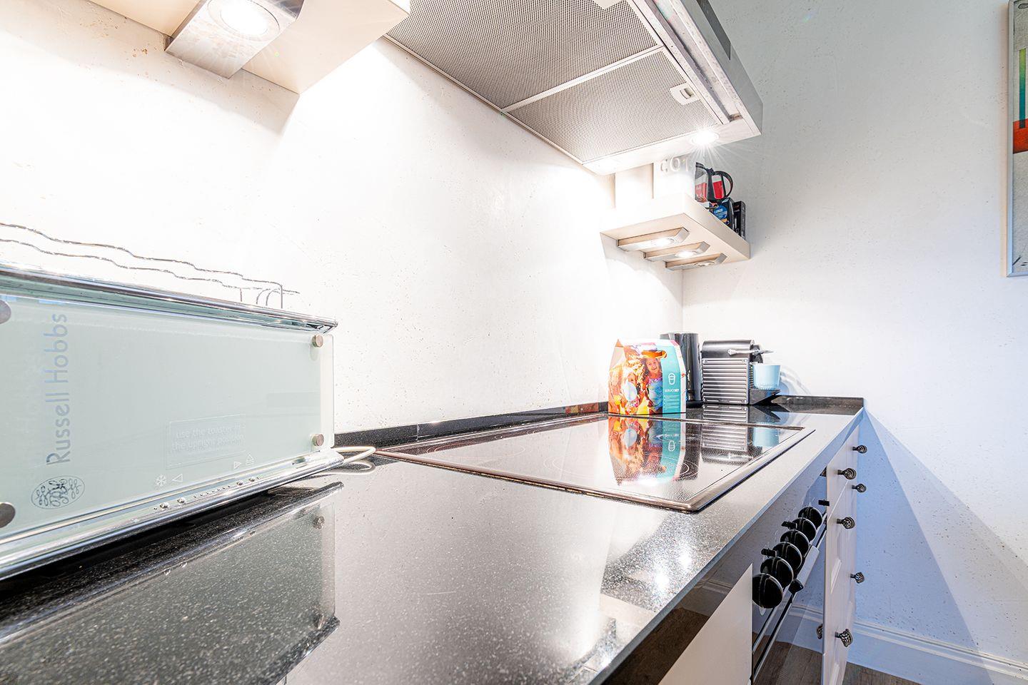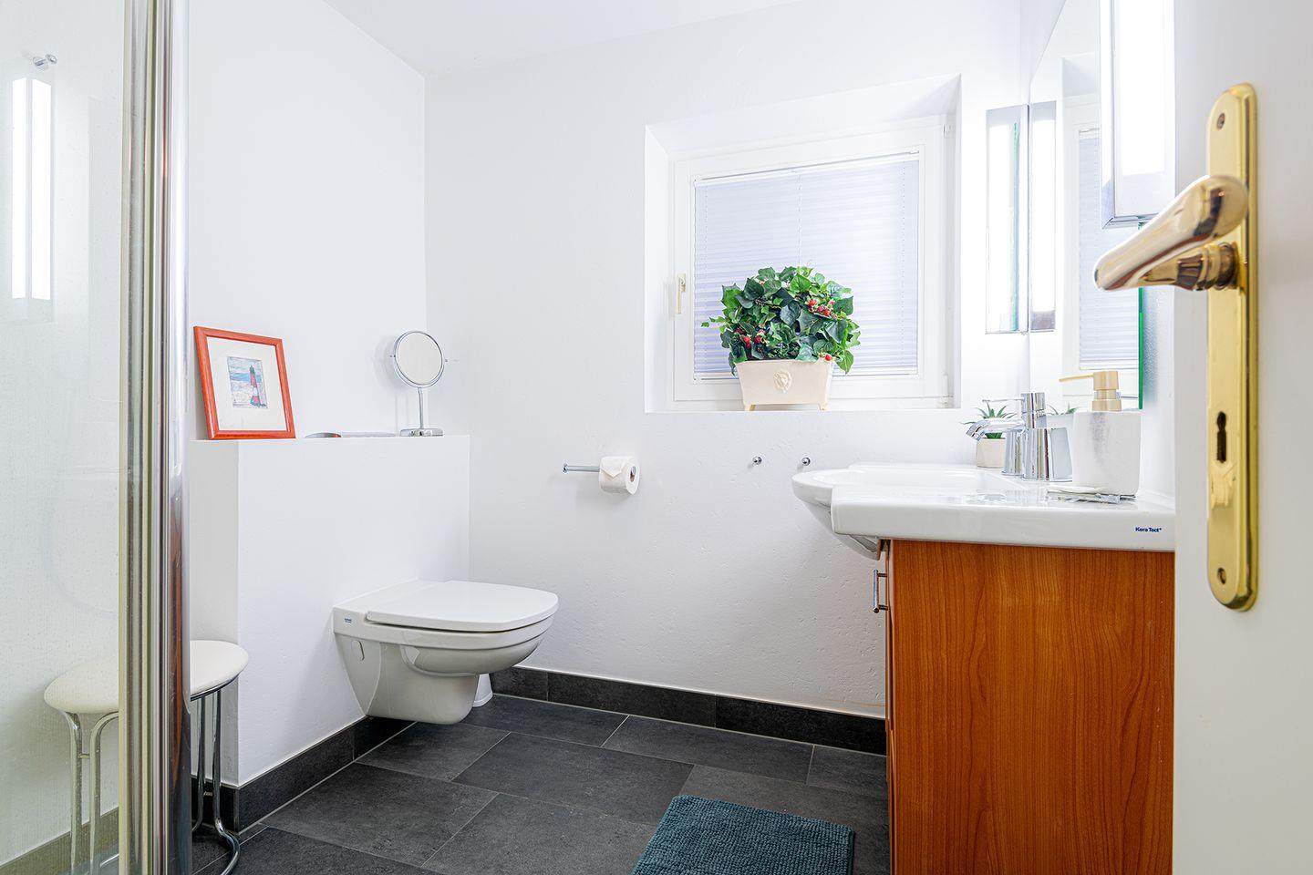 Im Untergeschoss befindet sich das dritte Schlafzimmer mit eigenem Bad En-Suite sowie eine großzügige Waschküche, ausgestattet mit Miele Waschmaschine und Trockner. Diese Ebene bietet zusätzlichen Komfort und Flexibilität für Familien oder Gruppen, die gemeinsam reisen.