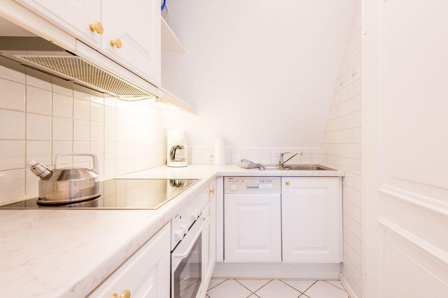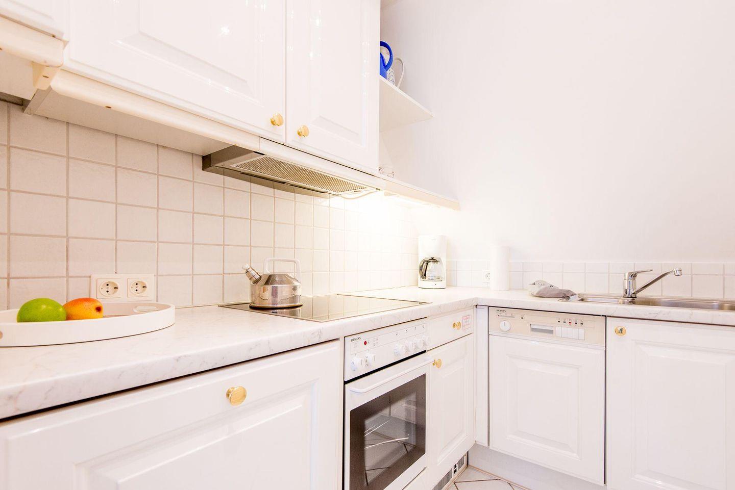 Die separate Küche im Eingangsbereich der Wohnung ist mit einem 4-flammigen Herd, Geschirrspüler und allen notwendigen Küchenutensilien voll ausgestattet. Hier können Sie sich ein Frühstück oder ein leckeres Abendessen zubereiten und die Mahlzeiten anschließend im Essbereich genießen.