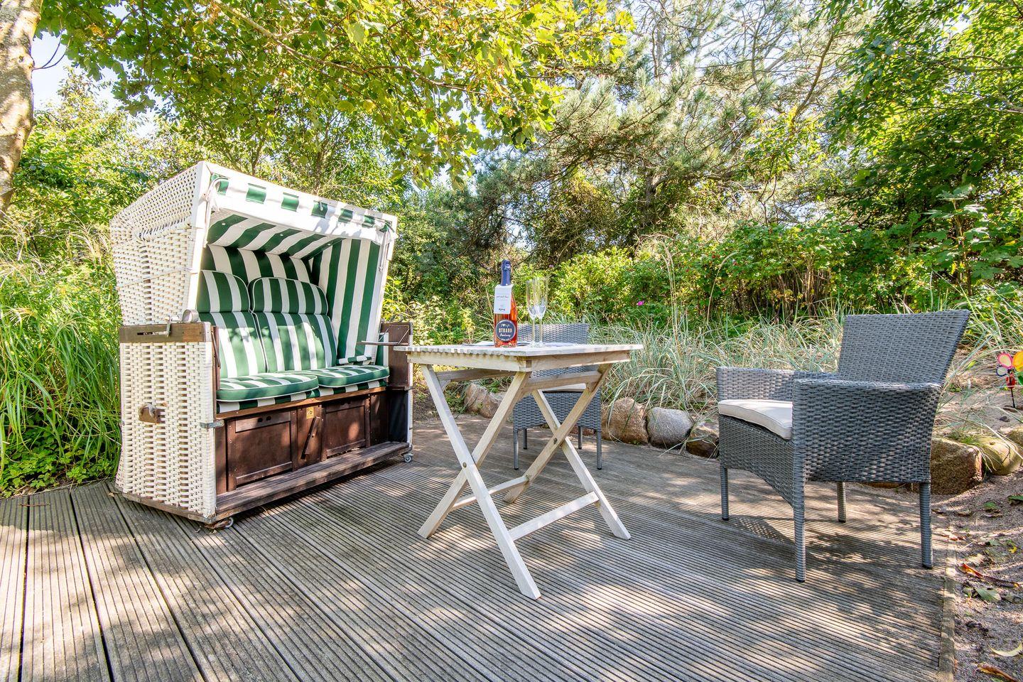 Ein gemeinschaftlich nutzbarer Garten mit einem Strandkorb und einem kleinen Tisch mit zwei Stühlen bietet den perfekten Ort für ruhige Momente und laue Sommerabende im Freien. Eingebettet in eine zauberhafte Hortensienlandschaft können Sie die frische Nordseeluft genießen und den Tag entspannt ausklingen lassen.