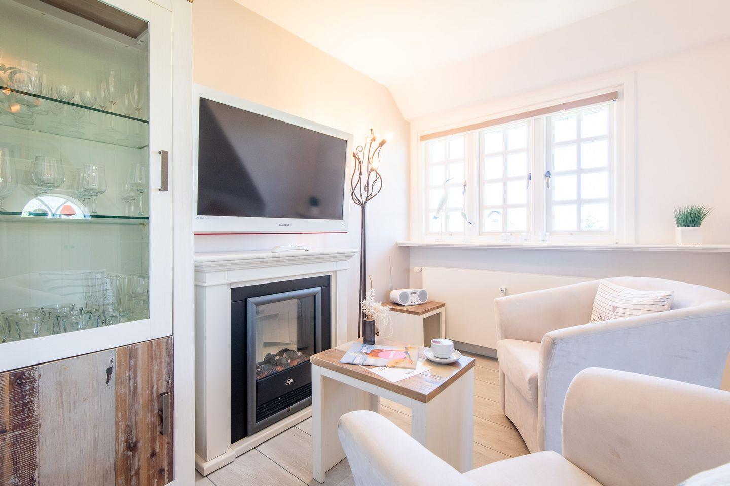 Der einladende Wohnbereich ist ausgestattet mit einem bequemen Sofa, einer gemütlichen Sitzecke und einem Esstisch für zwei Personen. Ein großes TV und ein Elektrokamin, der wohltuende Wärme spendet, sorgen für stimmungsvolle Abende. Durch die geschmackvolle Einrichtung und den einladenden Stil bietet das Wohnzimmer einen idealen Rückzugsort nach einem langen Tag auf der Insel.