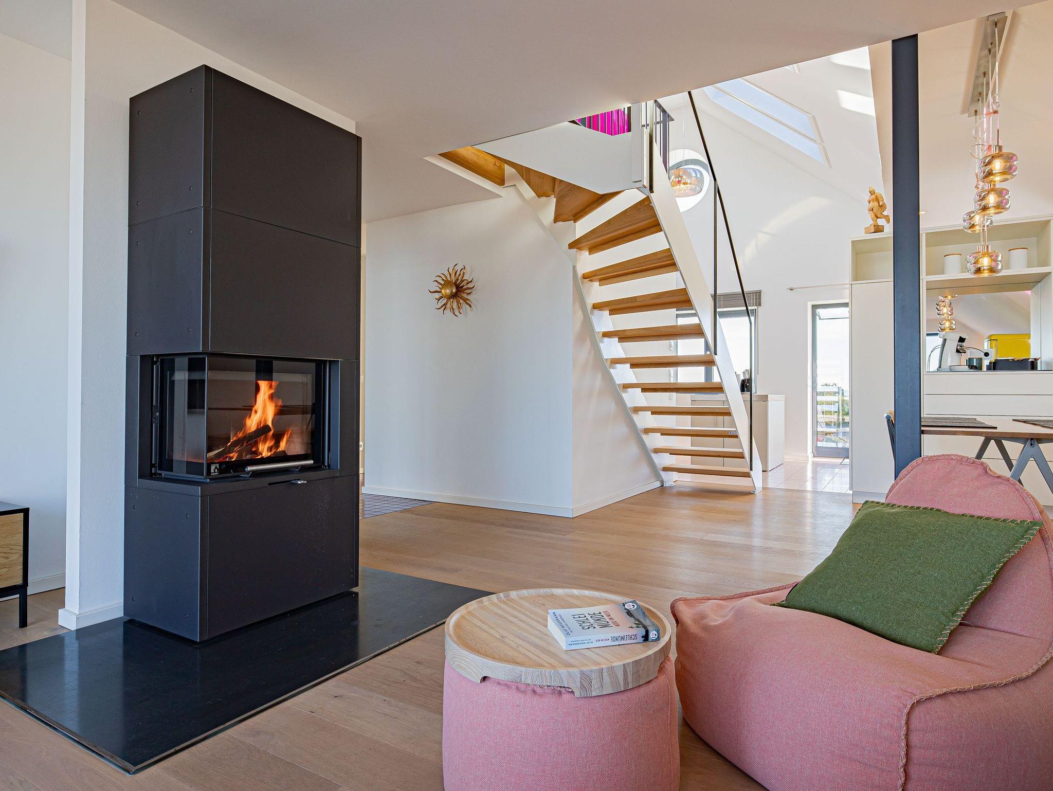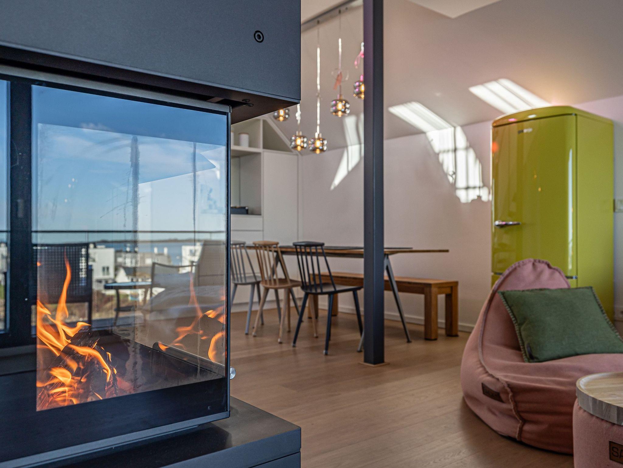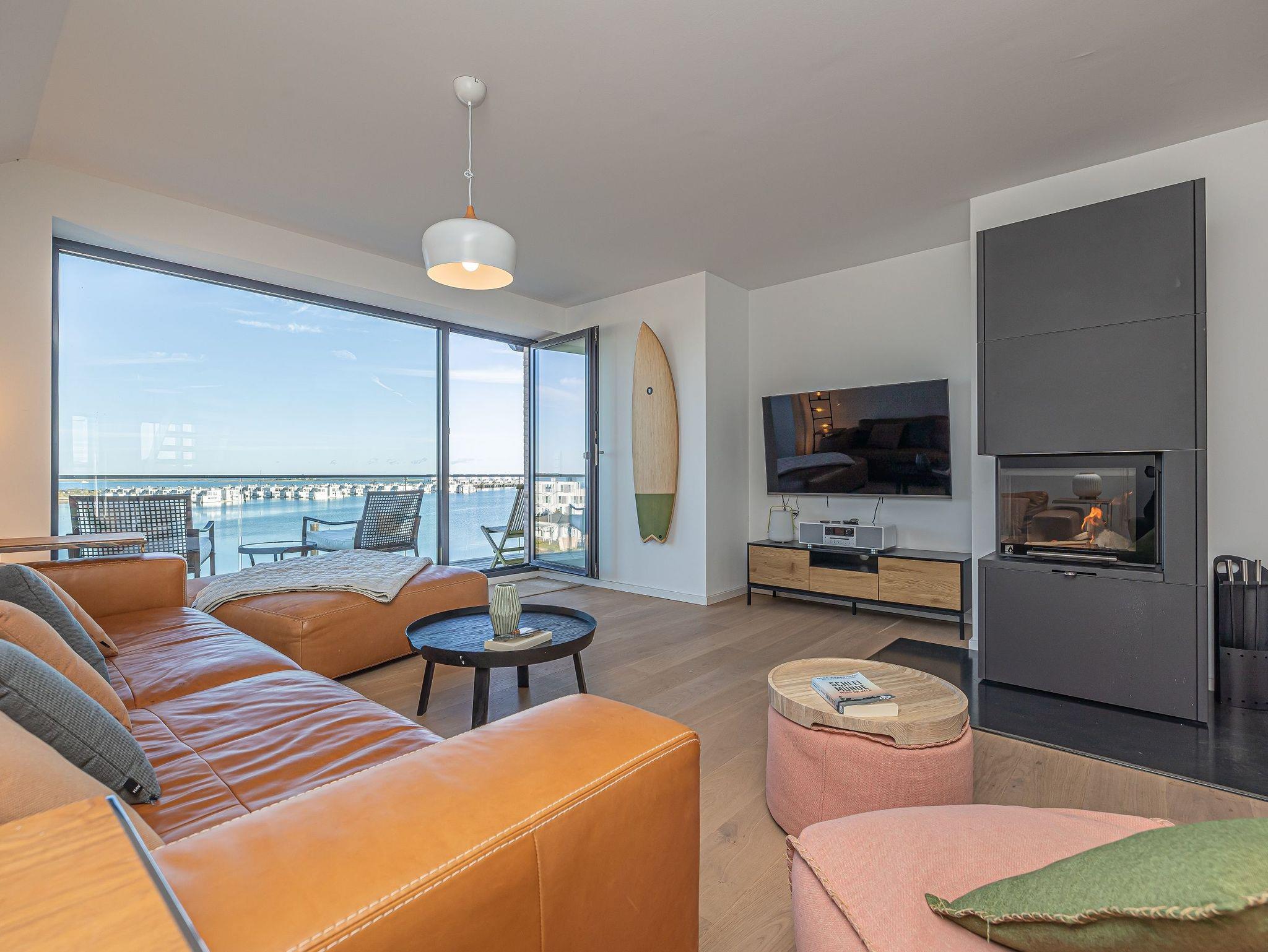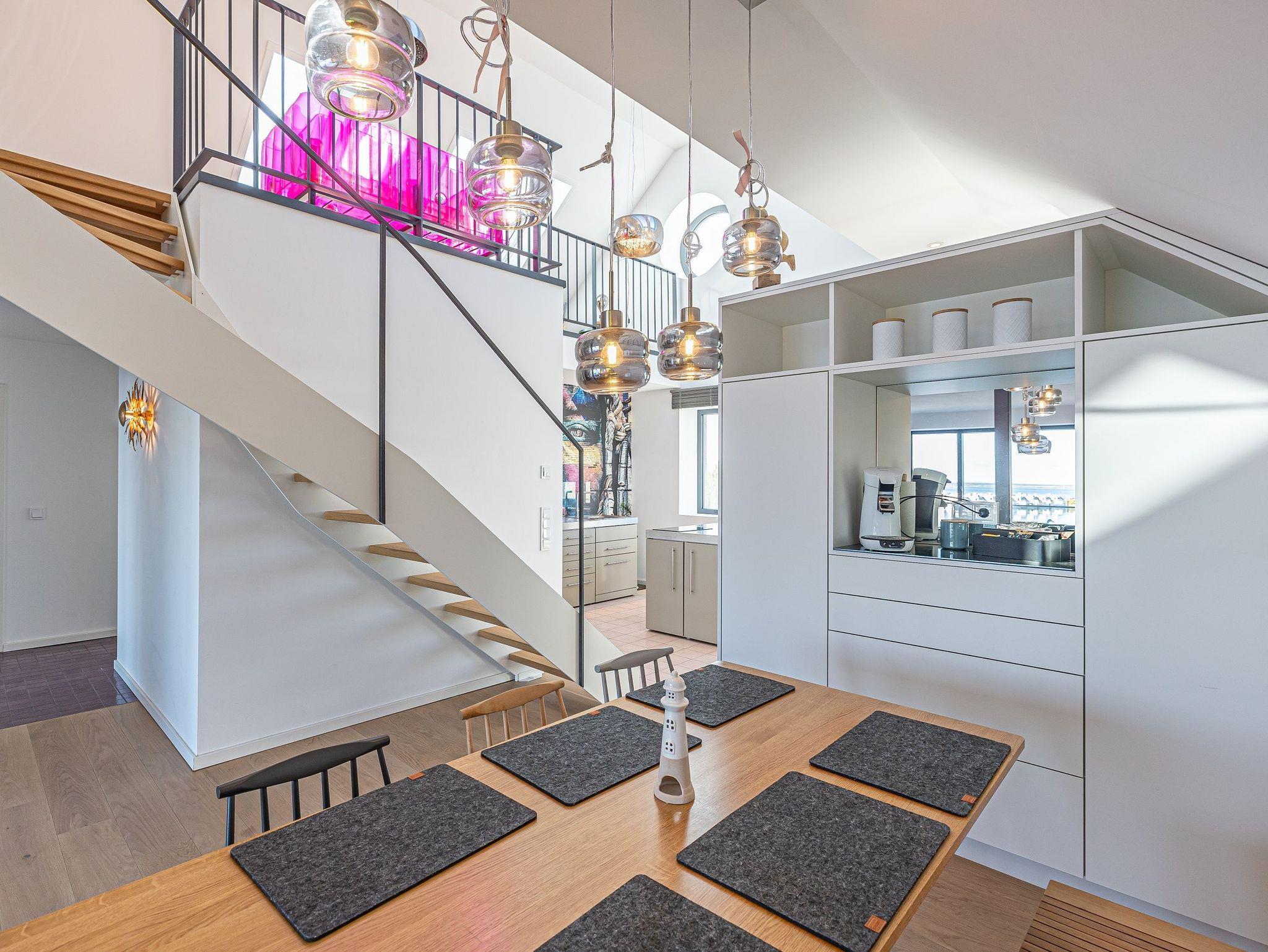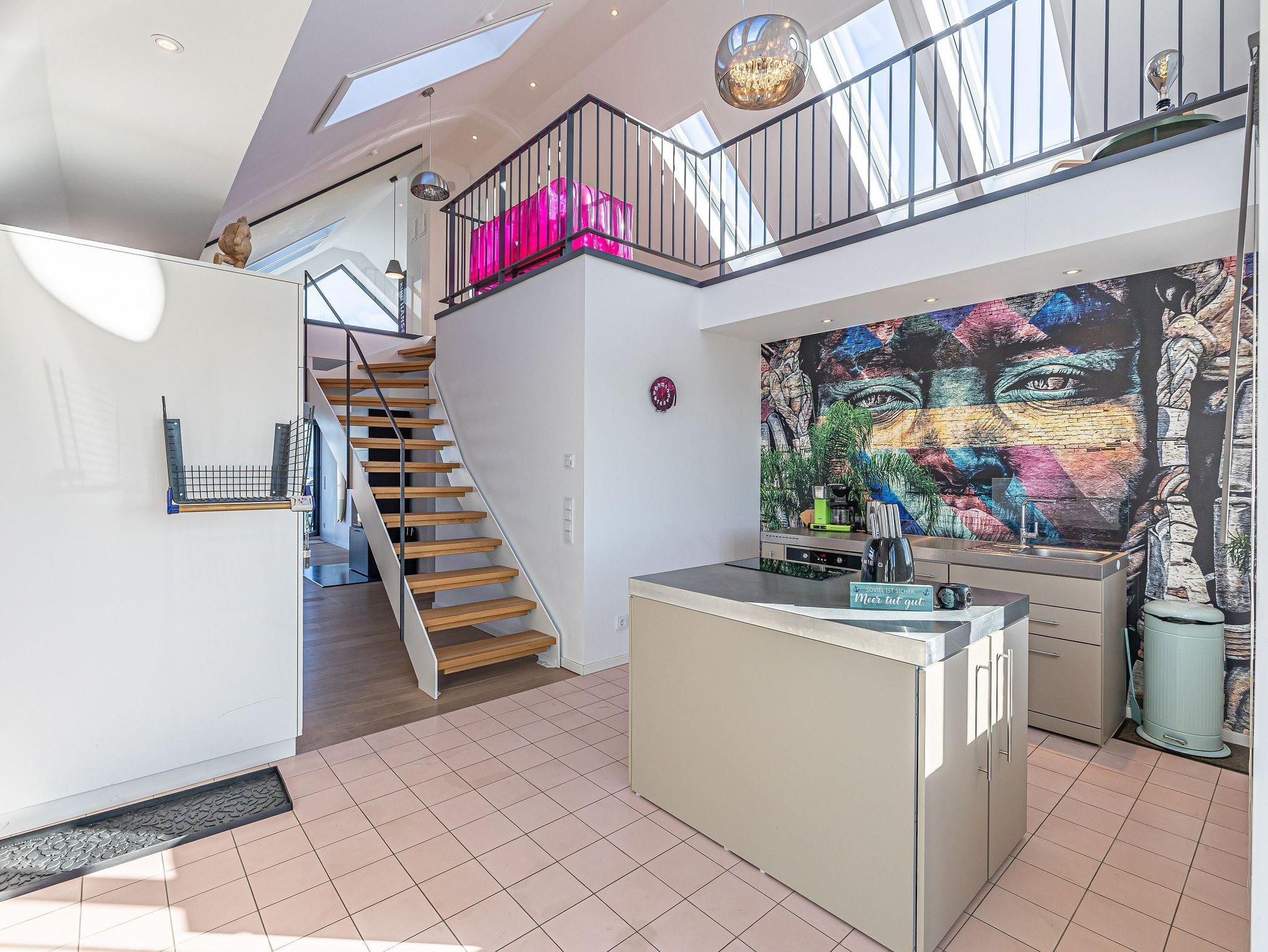 Genießen Sie Luxus und Behaglichkeit in dieser exklusiven 126 m² großen Maisonette-Wohnung mit offenem Dachausbau, die Platz für bis zu 6 Personen bietet. Die moderne, voll ausgestattete Küche mit einem kreativen Wandbild lädt zum gemeinsamen Kochen und Verweilen ein. Im stilvoll eingerichteten Wohnbereich mit Kamin erwartet Sie eine gemütliche Atmosphäre, begleitet von einem beeindruckenden Panoramablick auf den Hafen, Schleimünde mit seinem Leuchtturm und die Ostsee.