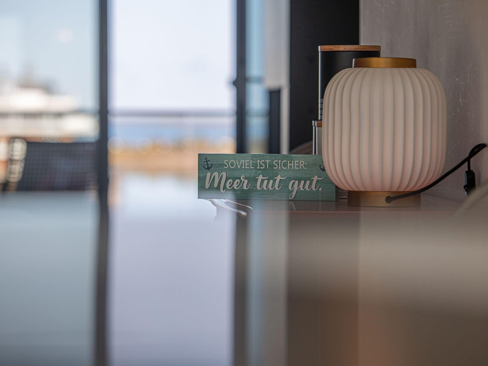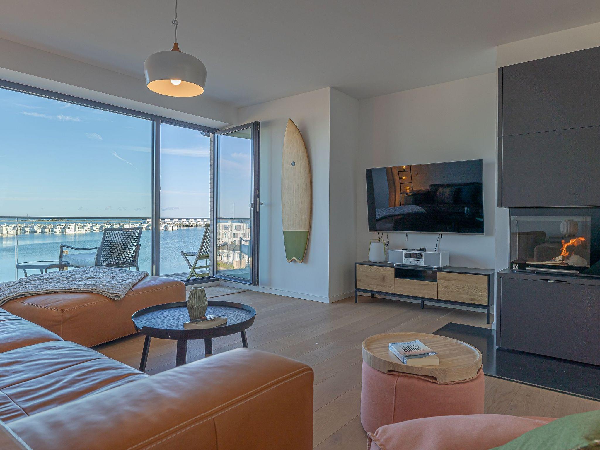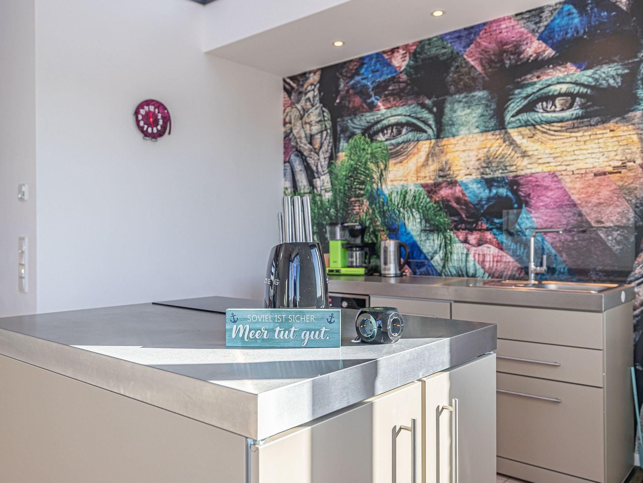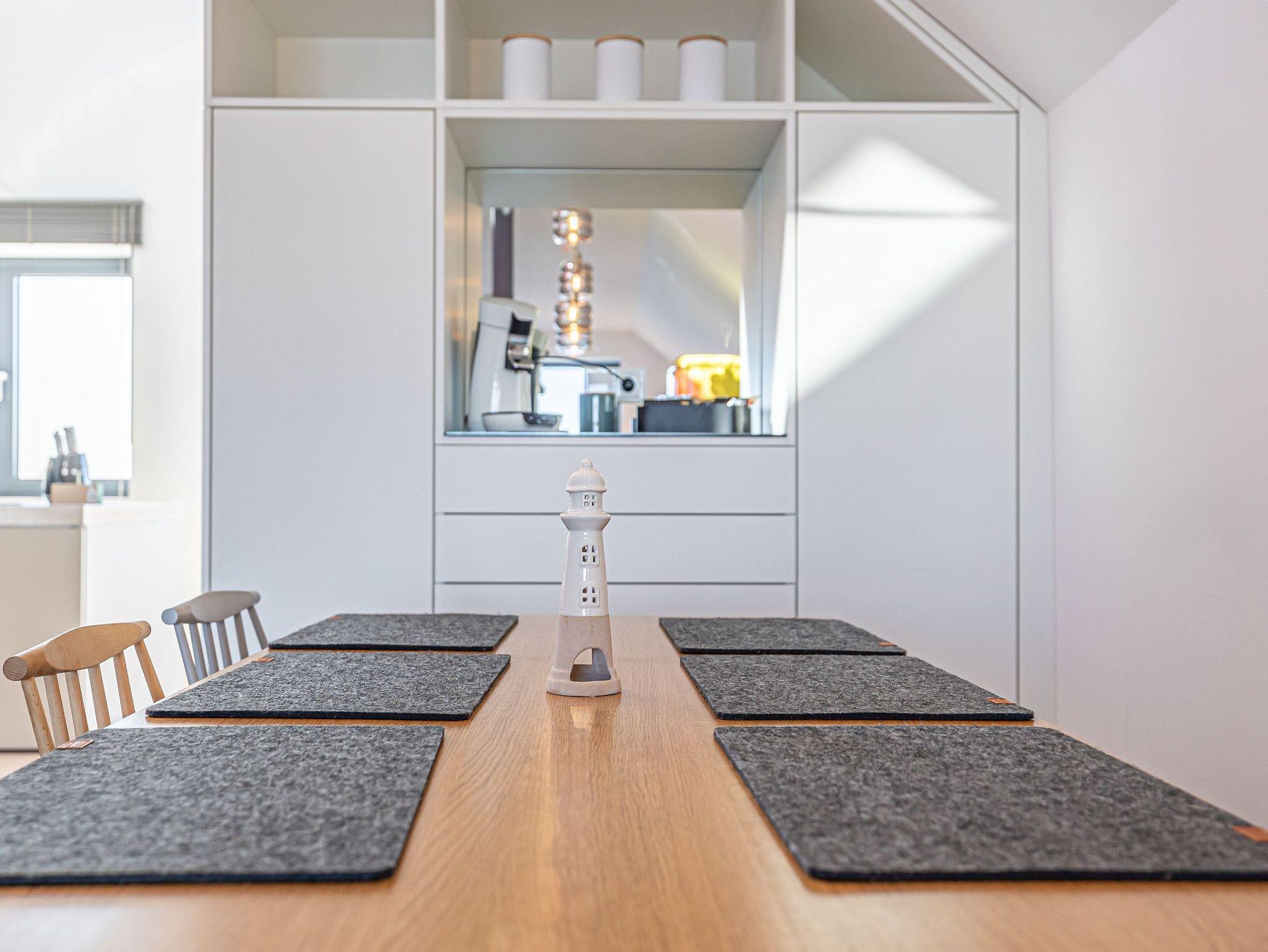 Genießen Sie Luxus und Behaglichkeit in dieser exklusiven 126 m² großen Maisonette-Wohnung mit offenem Dachausbau, die Platz für bis zu 6 Personen bietet. Die moderne, voll ausgestattete Küche mit einem kreativen Wandbild lädt zum gemeinsamen Kochen und Verweilen ein. Im stilvoll eingerichteten Wohnbereich mit Kamin erwartet Sie eine gemütliche Atmosphäre, begleitet von einem beeindruckenden Panoramablick auf den Hafen, Schleimünde mit seinem Leuchtturm und die Ostsee.