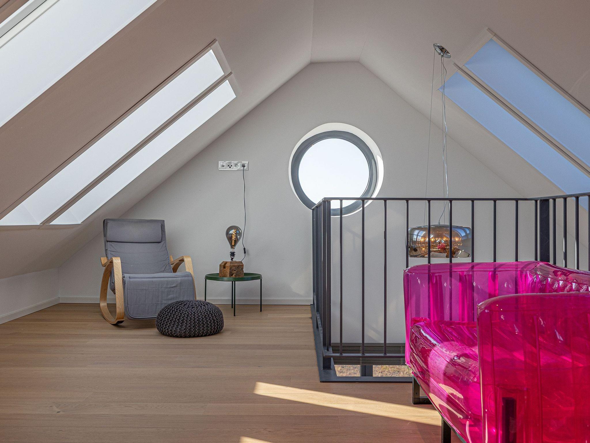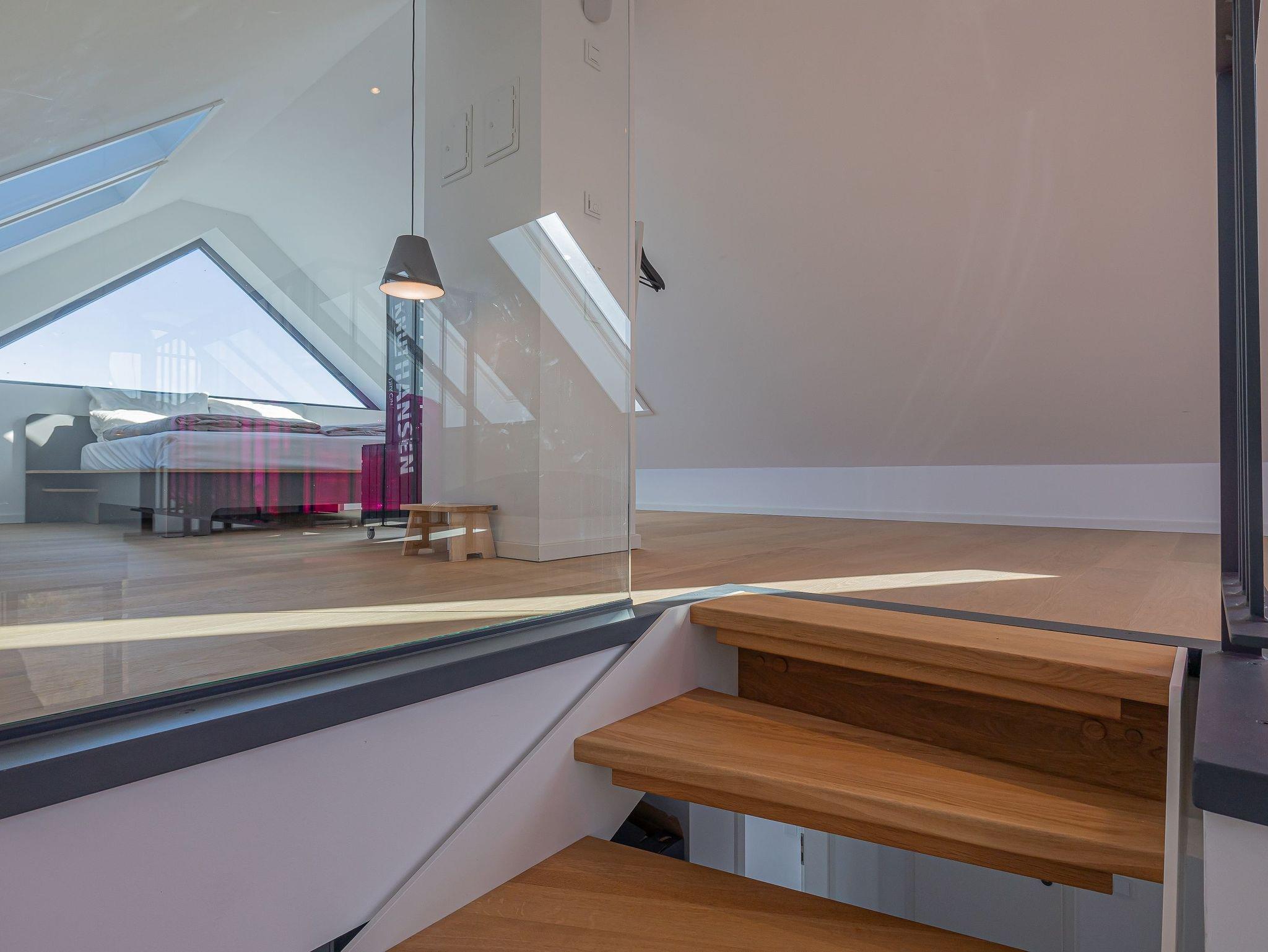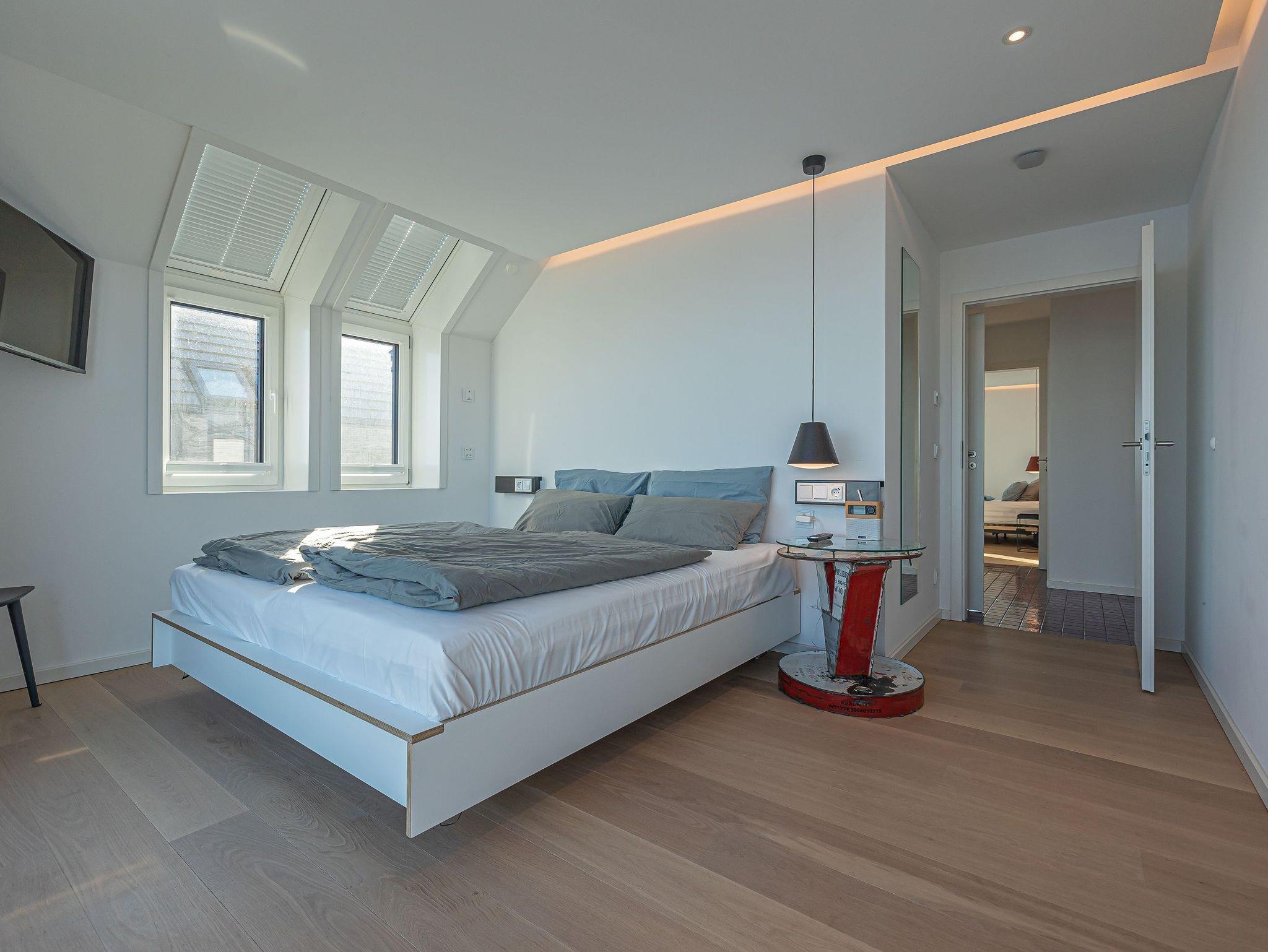 Der offene Dachausbau, durchflutet von Tageslicht und ausgestattet mit großen Fenstern, vermittelt ein unvergleichliches Wohngefühl. Hier befindet sich ein komfortables Bett, von dem aus Sie die Schlei und Ostsee in Ruhe betrachten können.
