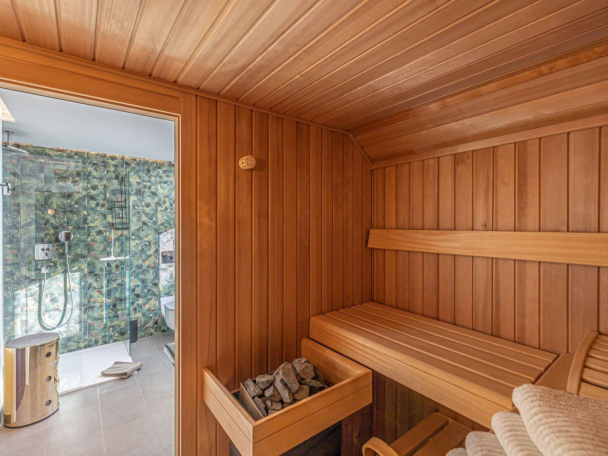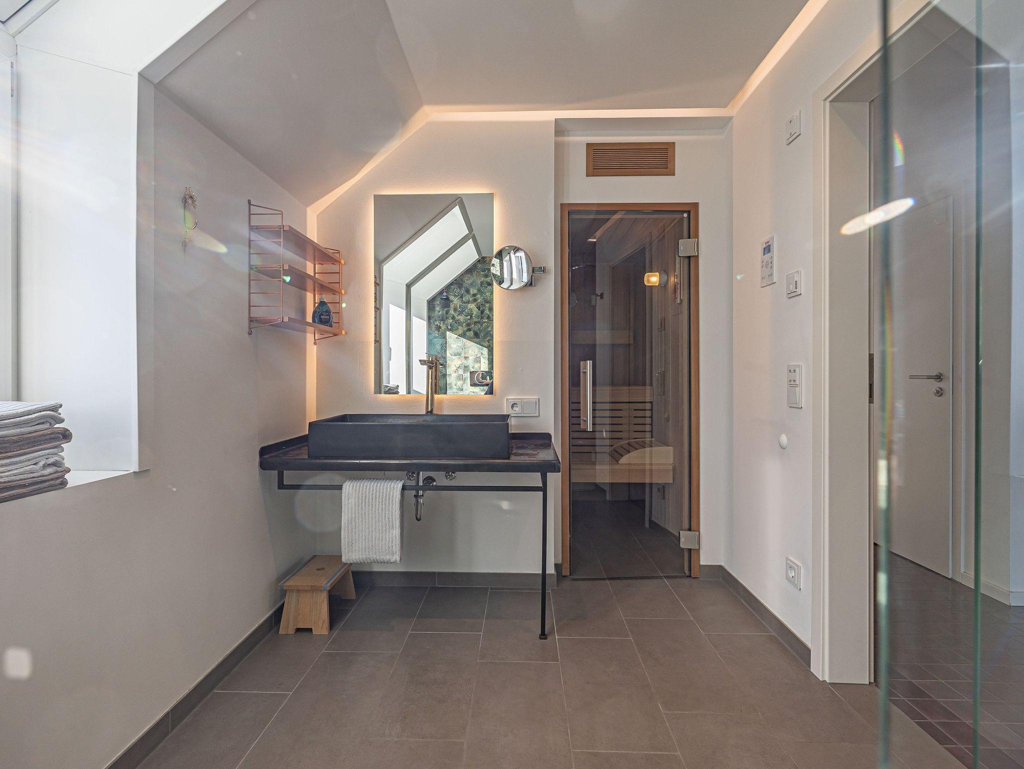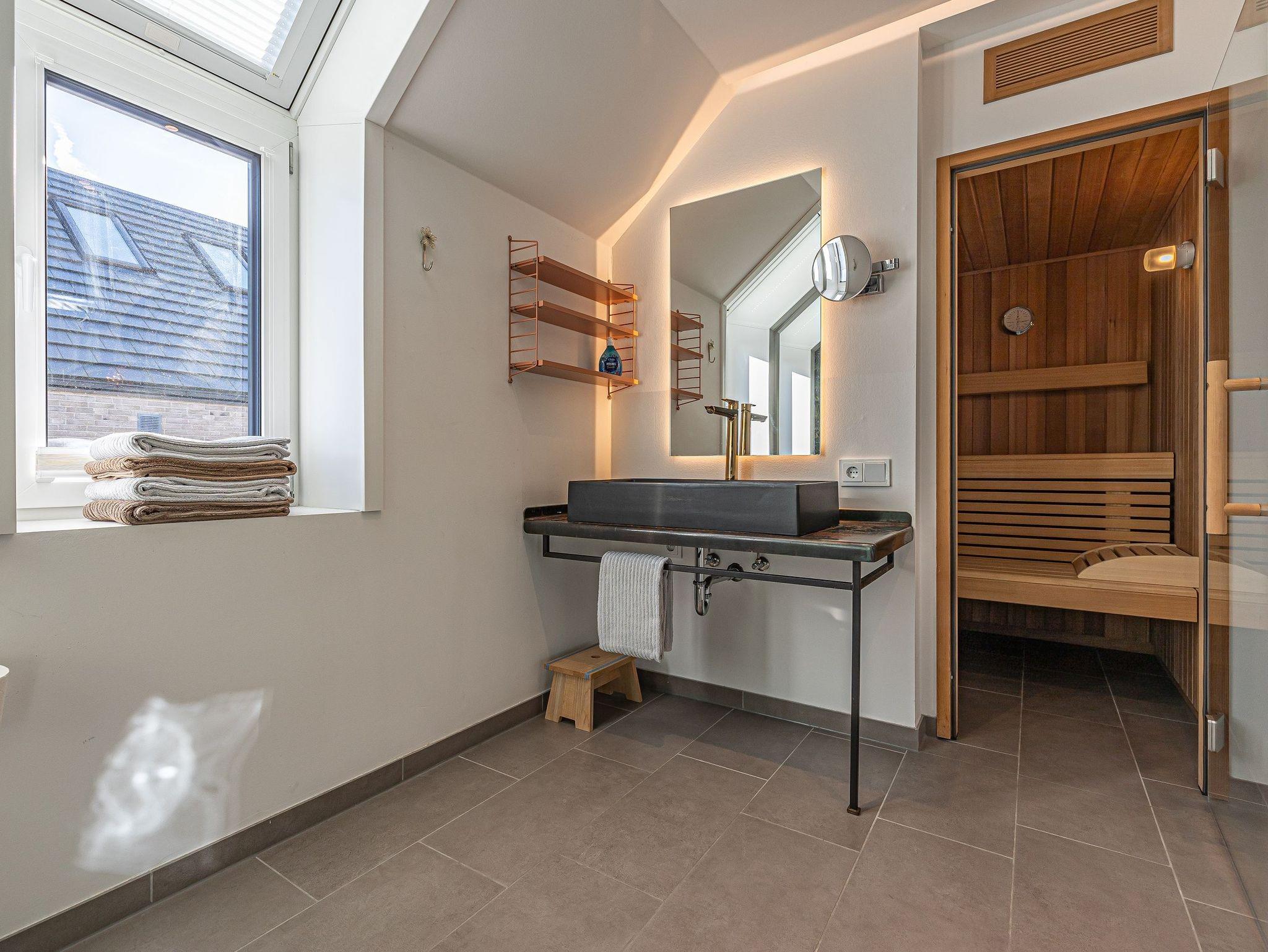 Zwei helle Schlafzimmer mit französischen Betten und jeweils eigenem Fernseher sorgen für erholsamen Schlaf. Ein zusätzliches Gäste-WC mit Waschmaschine und Trockner bringt zusätzlichen Komfort. Ihr privater Wellnessbereich, ausgestattet mit einer finnischen Sauna und einer bodengleichen Rainshower-Dusche, lädt zum Entspannen ein.
