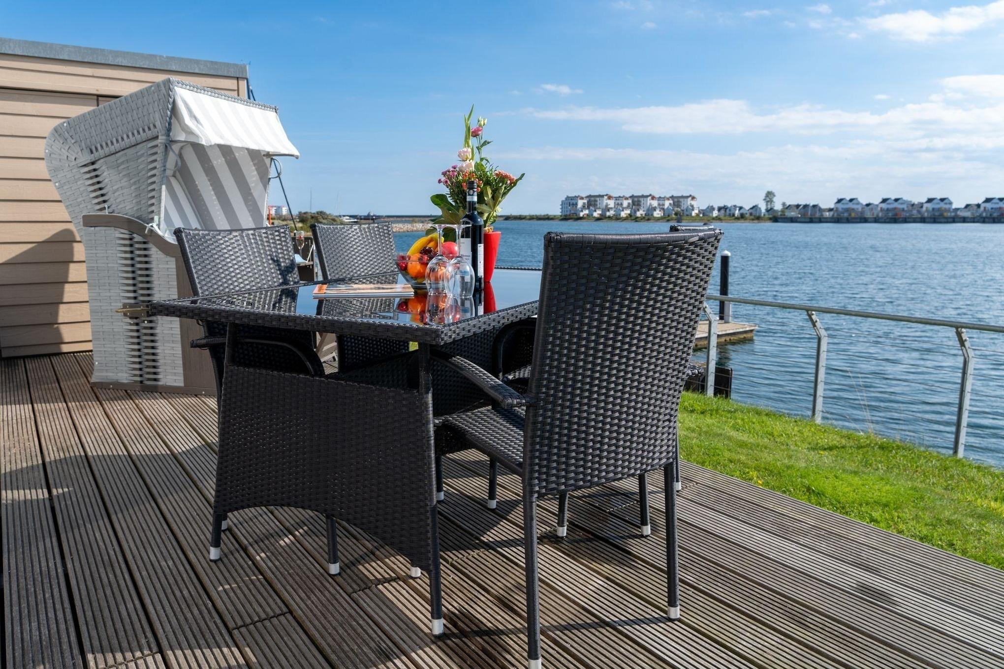 Die Terrasse mit Hafenblick und einem Strandkorb lädt zum Entspannen ein.